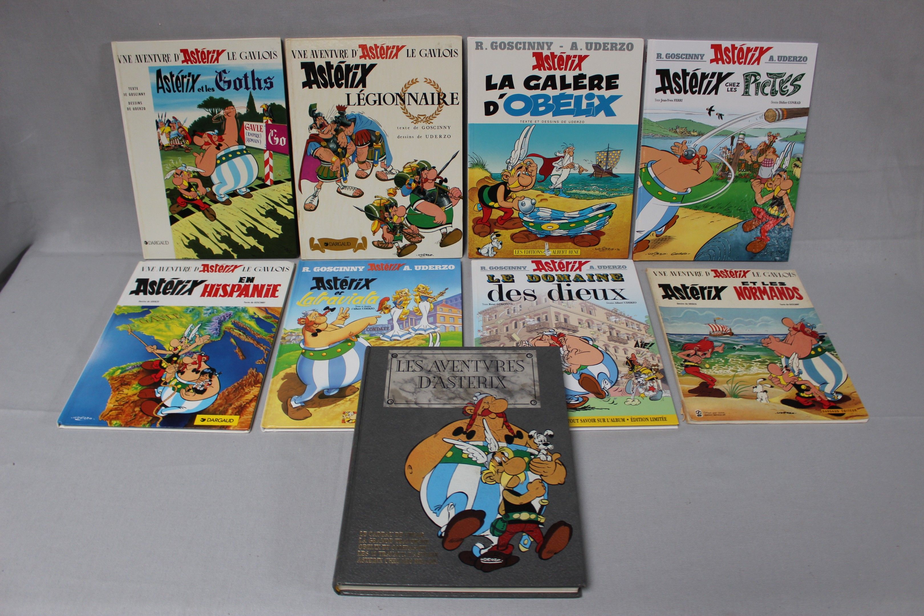 [BANDES DESSINEES] Astérix, par Goscinny et Uderzo, chez Dargaud, sept tomes, 1 tome offert par ELF(traces d'écritures en première page) et un recueil de 5 aventures