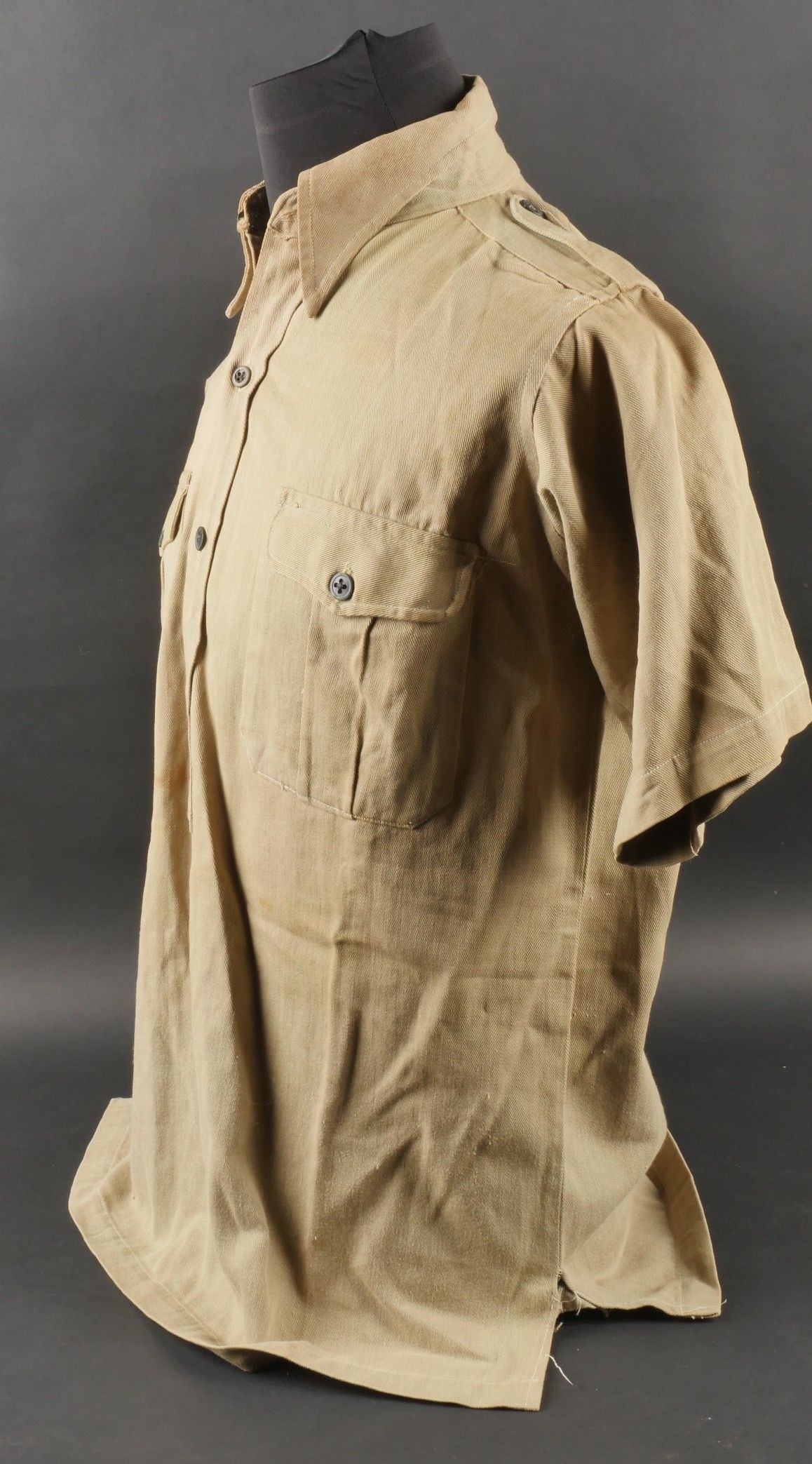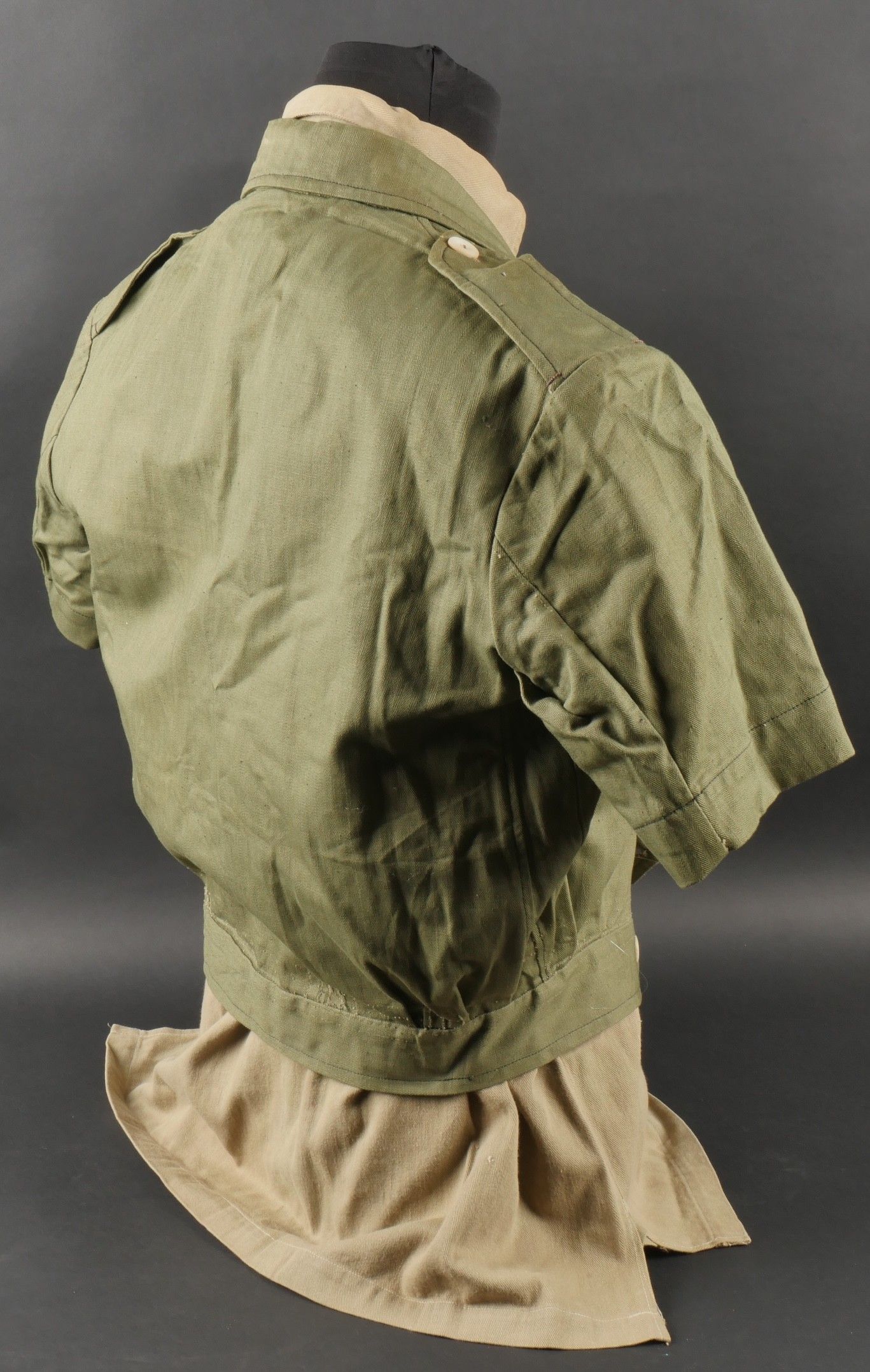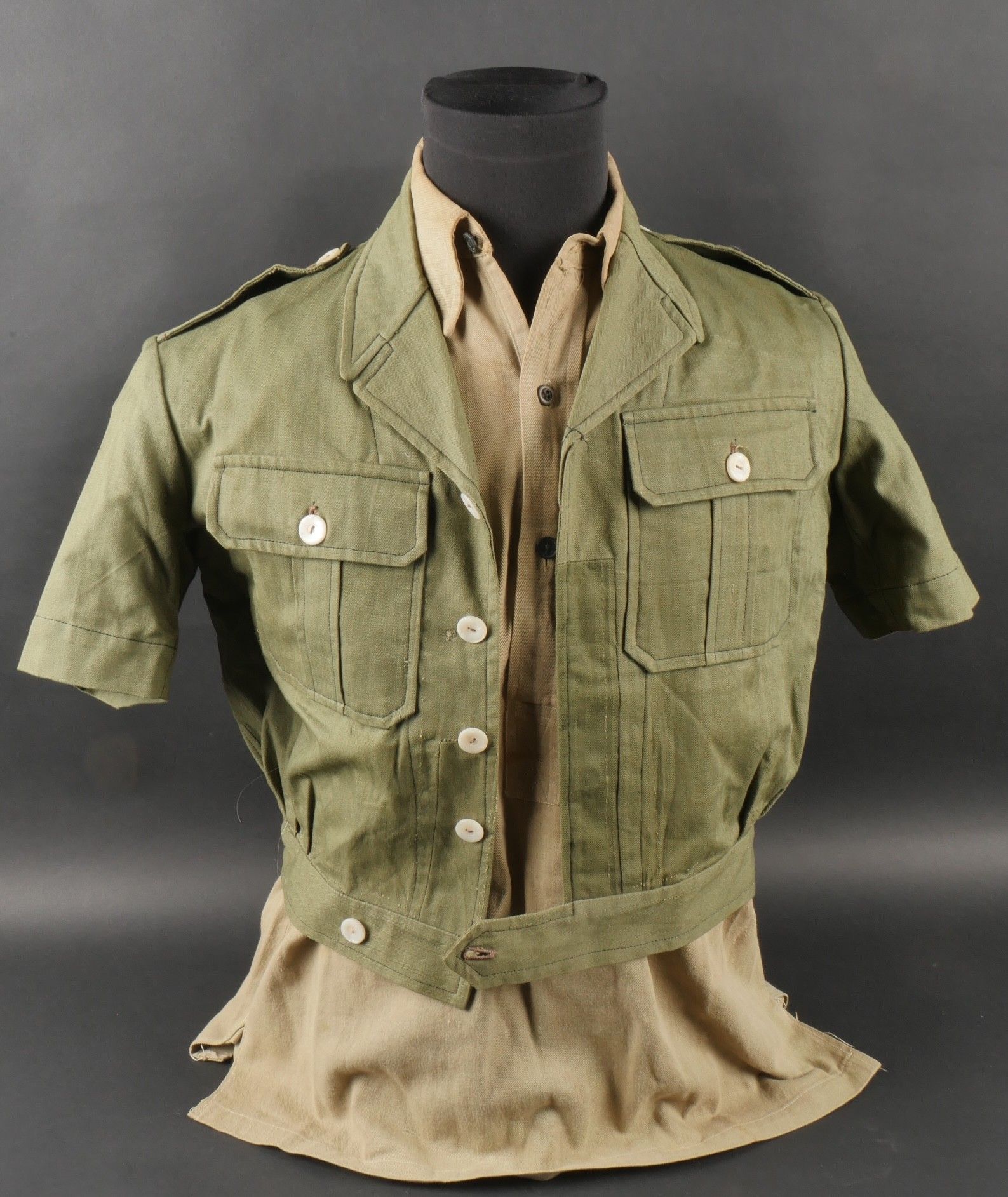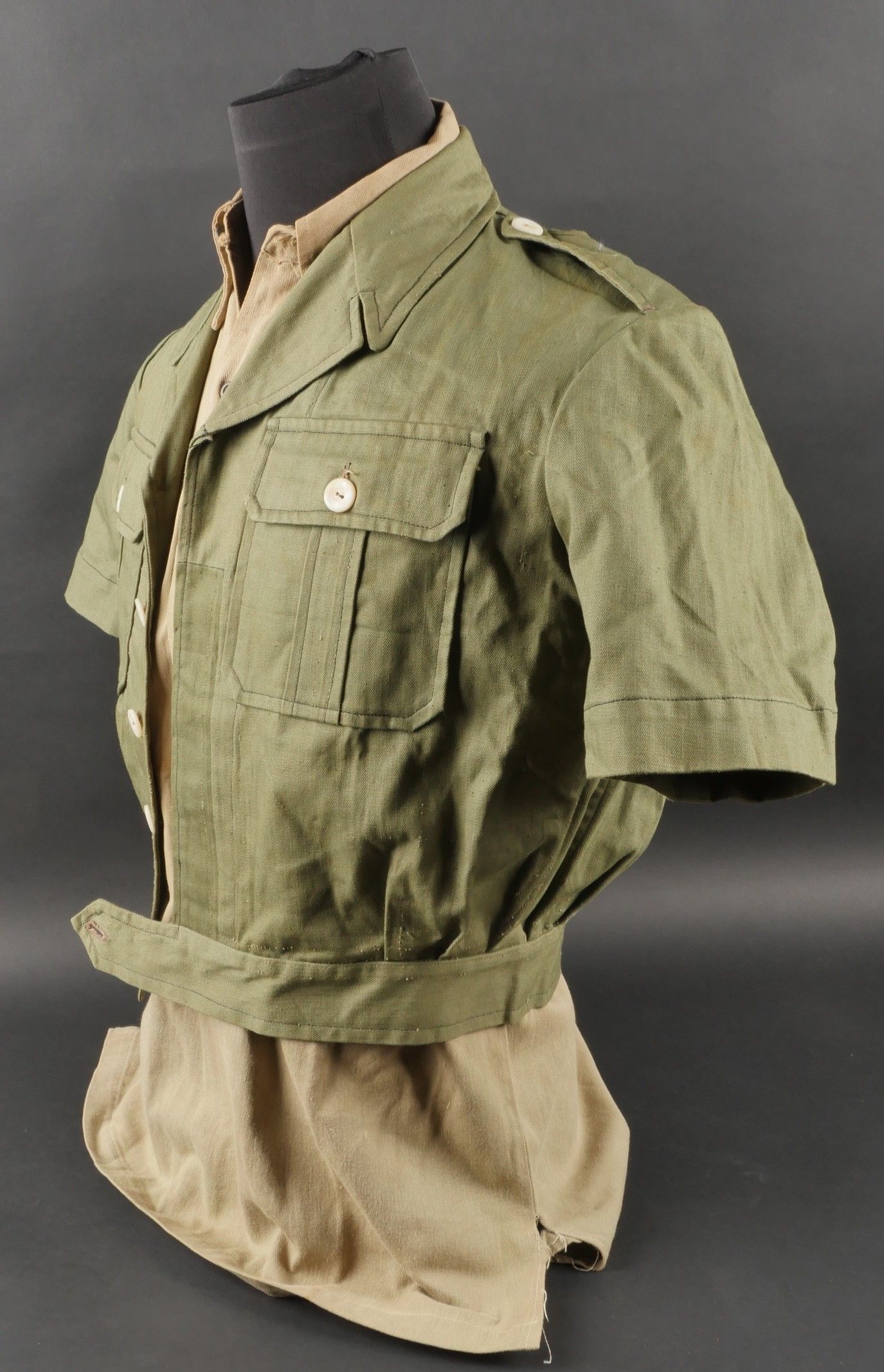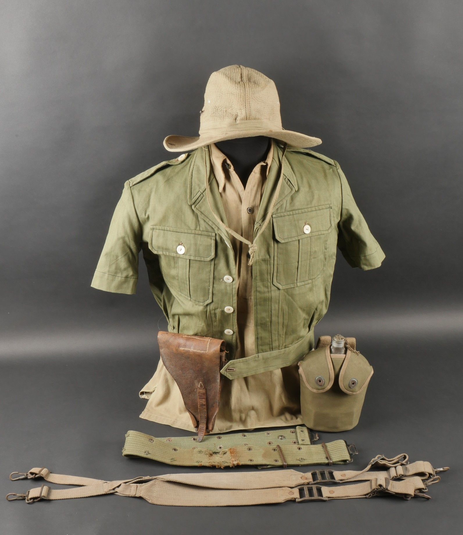 Ensemble d'effets Indochine. Comprenant un petit blouson chemisette de fabrication Extrême Orient copié sur le battledress britannique, fabriqué en tissu HBT, ce type de blouson est notamment observé chez les fusiliers marins et commandos marine. Un brelage TAP 53 en toile kaki, rivets pleins, tampon de fabricant présent mais illisible. Un ceinturon TAP 50 en toile kaki, double passant arrondi présent mais toile accidentée à l'arrière. Gourde modèle 1951, passants toile, housse datée 1954. Etui pour PA de fabrication locale en cuir fauve pour P08, deux emplacements pour chargeurs et un pour clé de démontage, ainsi qu'un logement latéral pour la baguette P08. Une chemisette en toile beige de confection Union, importée du Japon, deux poches de poitrine. Un chapeau de brousse de fabrication Extrême Orient en toile kaki claire, œillets en aluminium, jugulaire présente, grosse pression présentant des traces d'oxydation. Indochina effects set. Includes a short HBT jacket copied from the British battledress made in the Far East this type worn by naval fusiliers and commandos. TAP 53 web harness khaki with solid rivets maker mark illegible. TAP 50 belt in khaki webbing double rounded keepers rear webbing damaged. 1951 model canteen with web cover dated 1954. Locally made brown leather P08 holster with two magazine slots one for a takedown tool and a side slot for cleaning rod. Beige canvas shirt maker Union imported from Japan two breast pockets. Light khaki Far East bush hat aluminum eyelets chinstrap present large snap showing oxidation.
