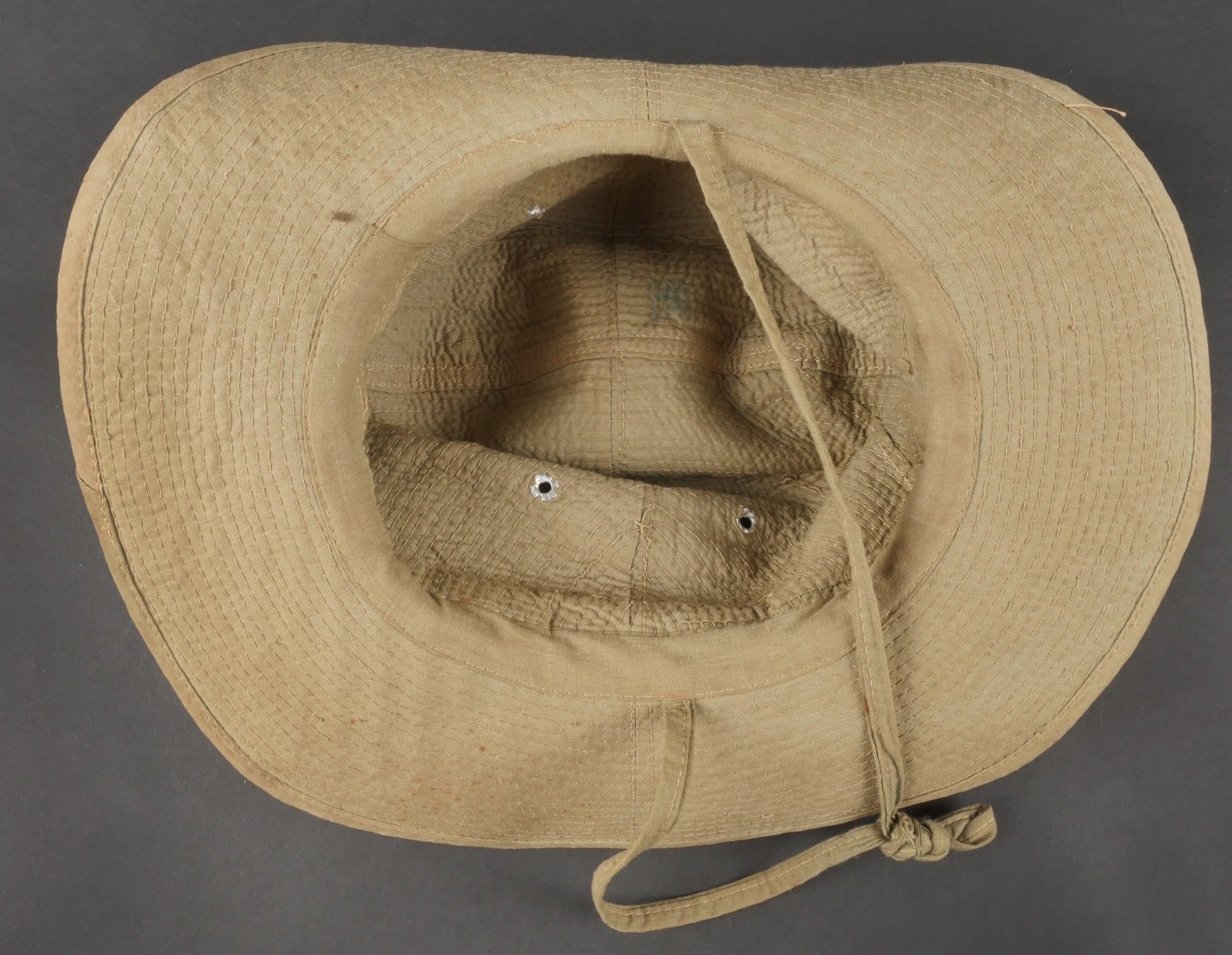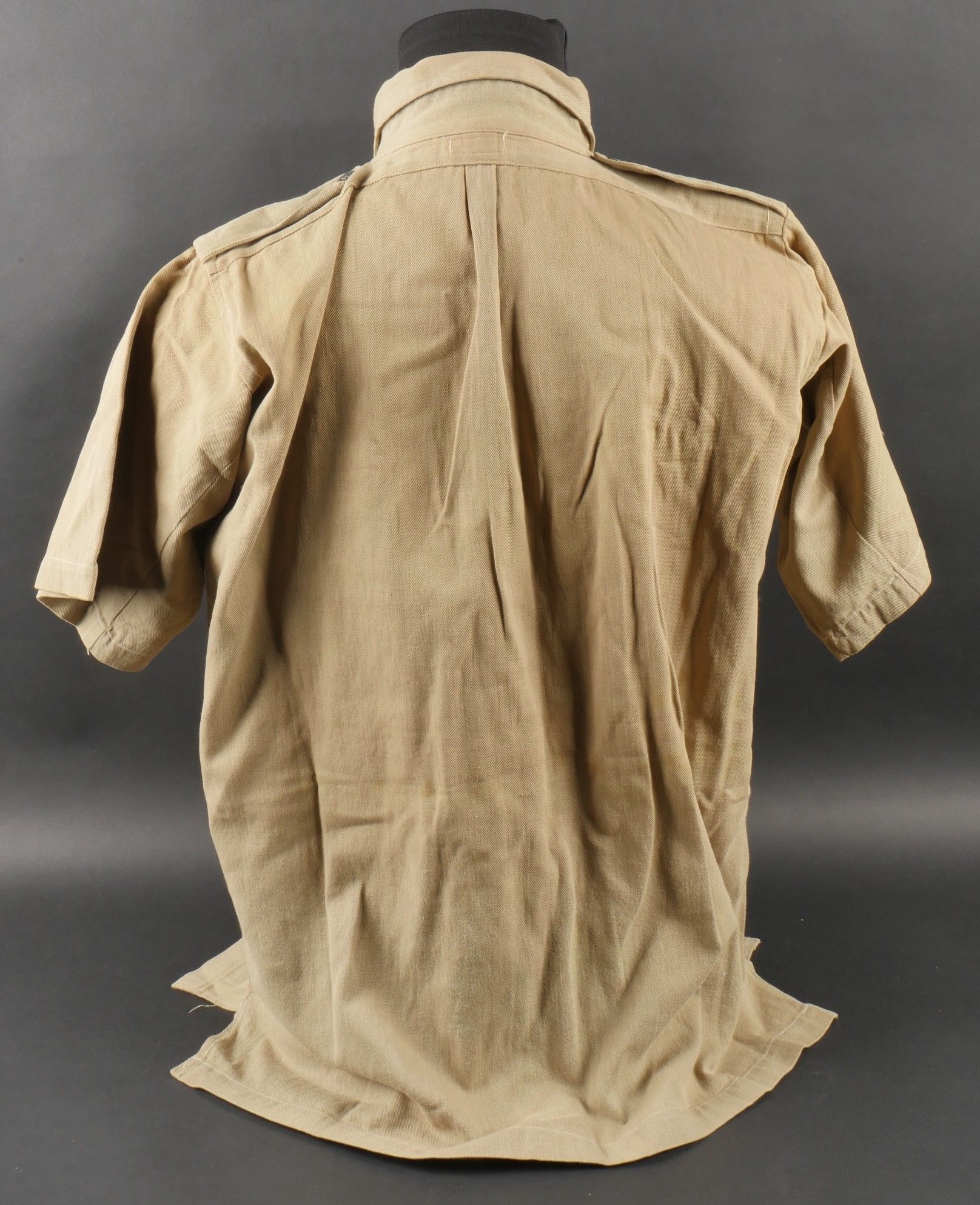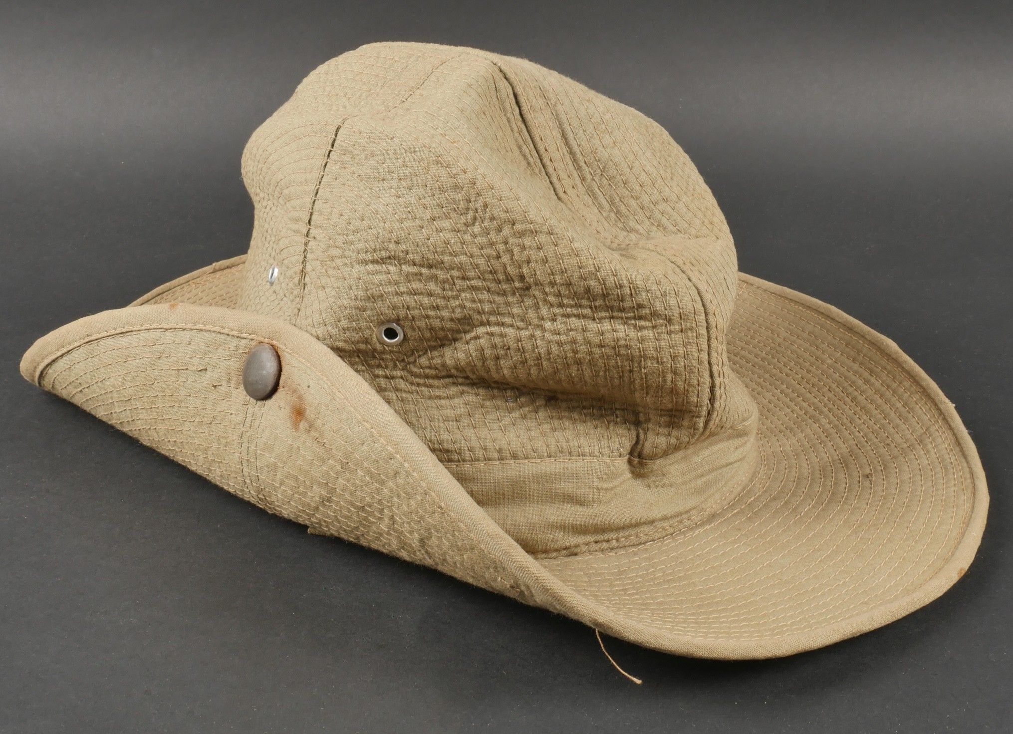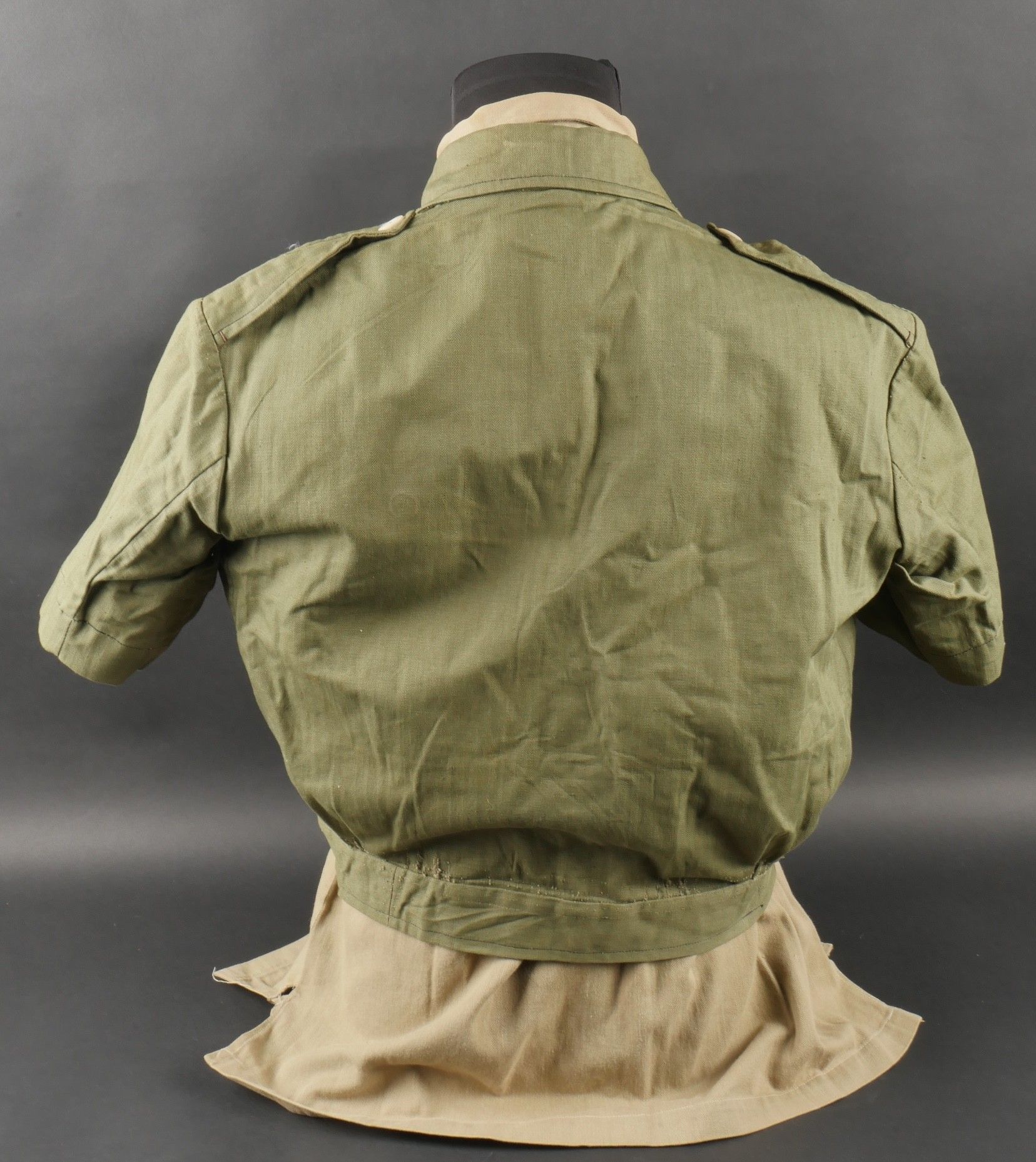 Ensemble d'effets Indochine. Comprenant un petit blouson chemisette de fabrication Extrême Orient copié sur le battledress britannique, fabriqué en tissu HBT, ce type de blouson est notamment observé chez les fusiliers marins et commandos marine. Un brelage TAP 53 en toile kaki, rivets pleins, tampon de fabricant présent mais illisible. Un ceinturon TAP 50 en toile kaki, double passant arrondi présent mais toile accidentée à l'arrière. Gourde modèle 1951, passants toile, housse datée 1954. Etui pour PA de fabrication locale en cuir fauve pour P08, deux emplacements pour chargeurs et un pour clé de démontage, ainsi qu'un logement latéral pour la baguette P08. Une chemisette en toile beige de confection Union, importée du Japon, deux poches de poitrine. Un chapeau de brousse de fabrication Extrême Orient en toile kaki claire, œillets en aluminium, jugulaire présente, grosse pression présentant des traces d'oxydation. Indochina effects set. Includes a short HBT jacket copied from the British battledress made in the Far East this type worn by naval fusiliers and commandos. TAP 53 web harness khaki with solid rivets maker mark illegible. TAP 50 belt in khaki webbing double rounded keepers rear webbing damaged. 1951 model canteen with web cover dated 1954. Locally made brown leather P08 holster with two magazine slots one for a takedown tool and a side slot for cleaning rod. Beige canvas shirt maker Union imported from Japan two breast pockets. Light khaki Far East bush hat aluminum eyelets chinstrap present large snap showing oxidation.