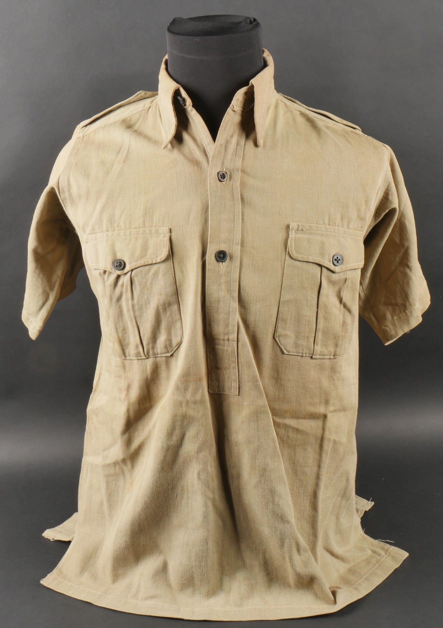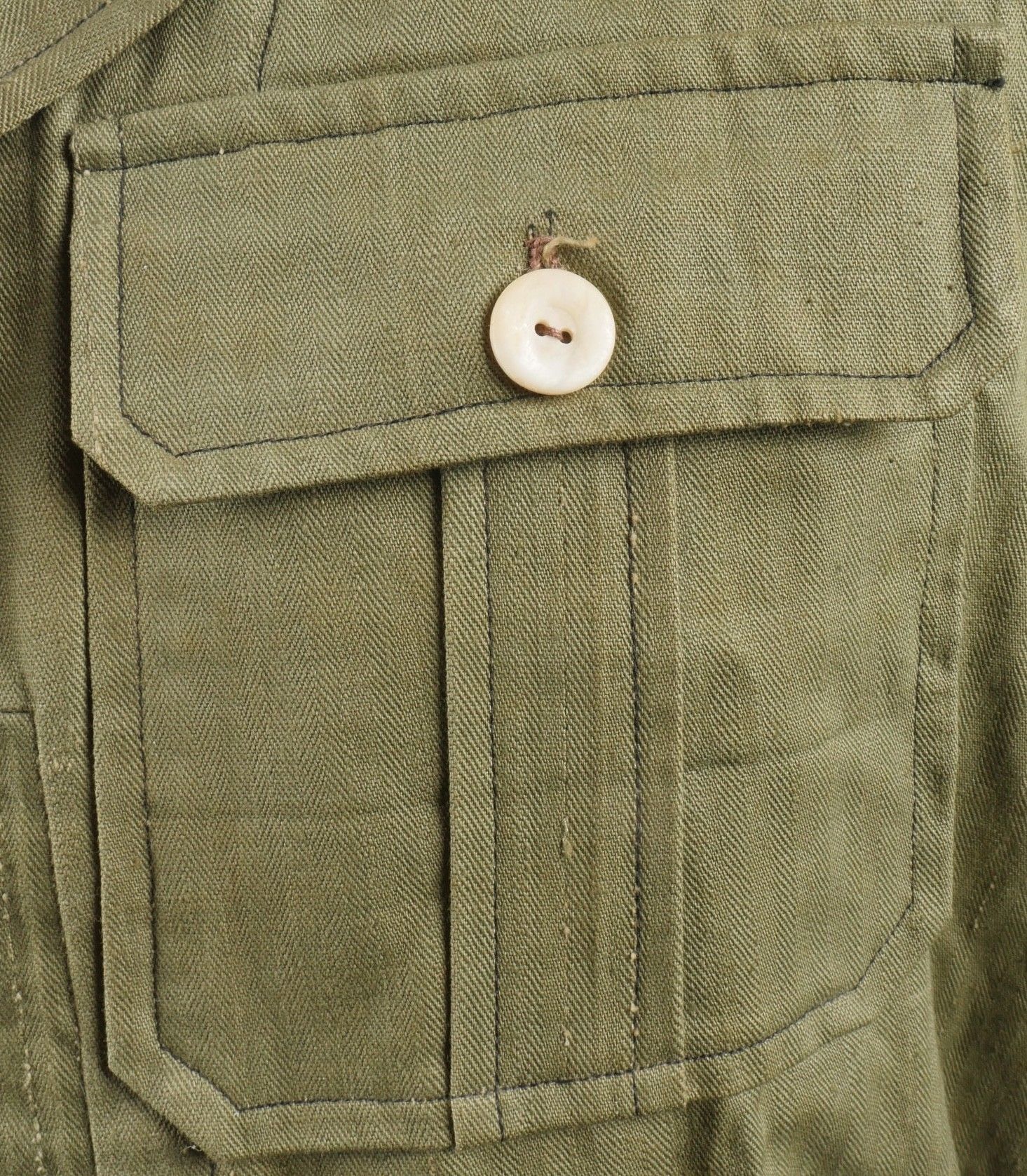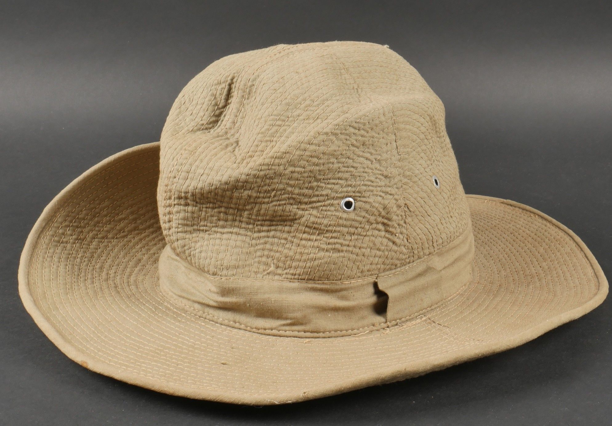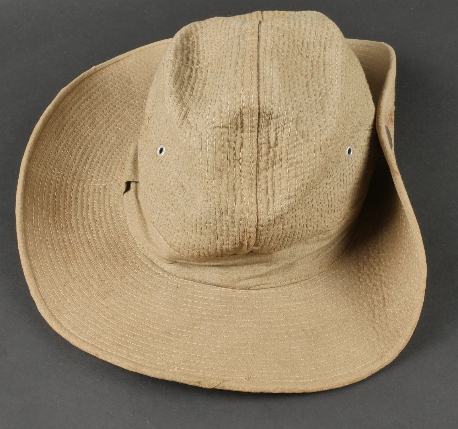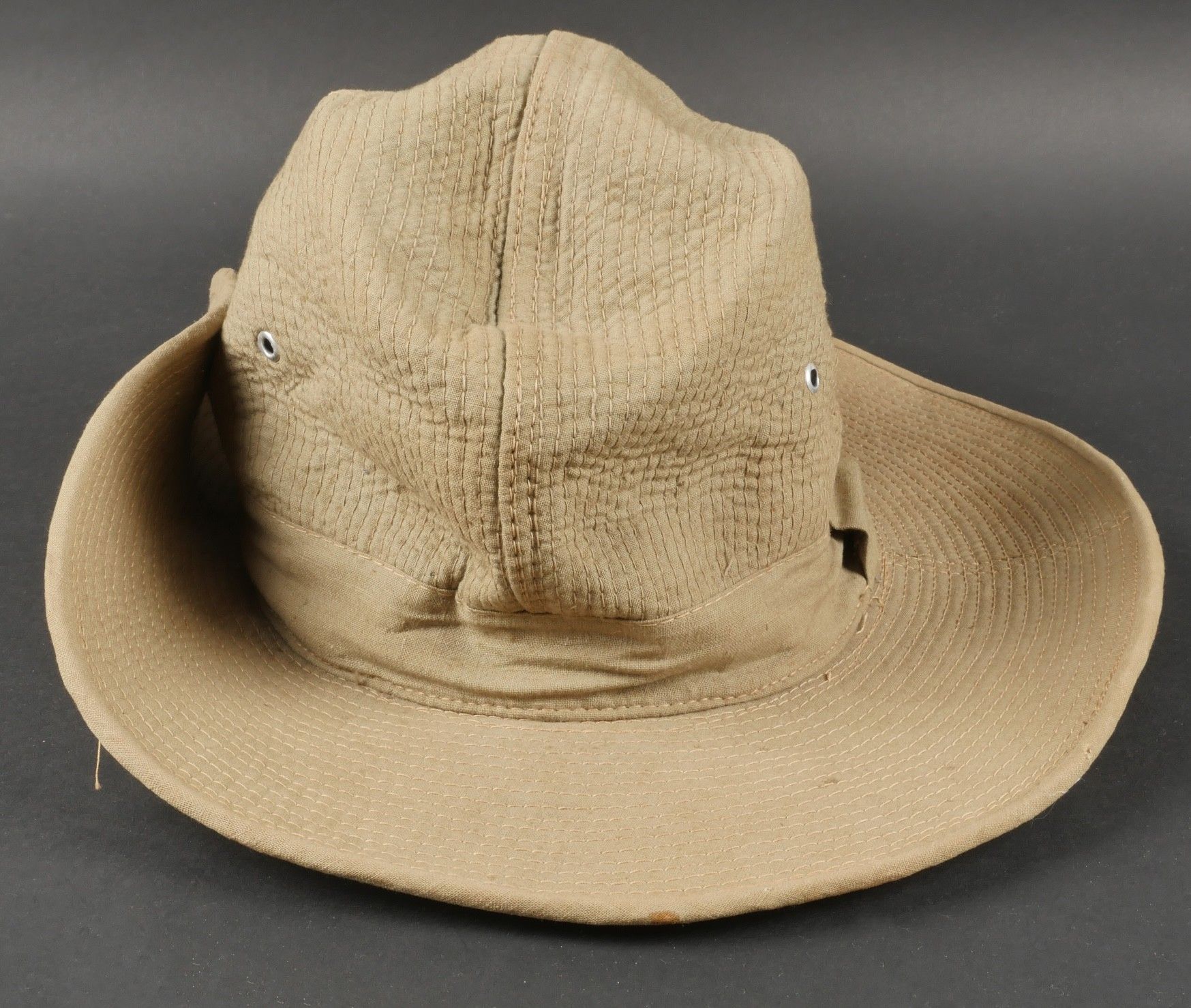Ensemble d'effets Indochine. Comprenant un petit blouson chemisette de fabrication Extrême Orient copié sur le battledress britannique, fabriqué en tissu HBT, ce type de blouson est notamment observé chez les fusiliers marins et commandos marine. Un brelage TAP 53 en toile kaki, rivets pleins, tampon de fabricant présent mais illisible. Un ceinturon TAP 50 en toile kaki, double passant arrondi présent mais toile accidentée à l'arrière. Gourde modèle 1951, passants toile, housse datée 1954. Etui pour PA de fabrication locale en cuir fauve pour P08, deux emplacements pour chargeurs et un pour clé de démontage, ainsi qu'un logement latéral pour la baguette P08. Une chemisette en toile beige de confection Union, importée du Japon, deux poches de poitrine. Un chapeau de brousse de fabrication Extrême Orient en toile kaki claire, œillets en aluminium, jugulaire présente, grosse pression présentant des traces d'oxydation. Indochina effects set. Includes a short HBT jacket copied from the British battledress made in the Far East this type worn by naval fusiliers and commandos. TAP 53 web harness khaki with solid rivets maker mark illegible. TAP 50 belt in khaki webbing double rounded keepers rear webbing damaged. 1951 model canteen with web cover dated 1954. Locally made brown leather P08 holster with two magazine slots one for a takedown tool and a side slot for cleaning rod. Beige canvas shirt maker Union imported from Japan two breast pockets. Light khaki Far East bush hat aluminum eyelets chinstrap present large snap showing oxidation.