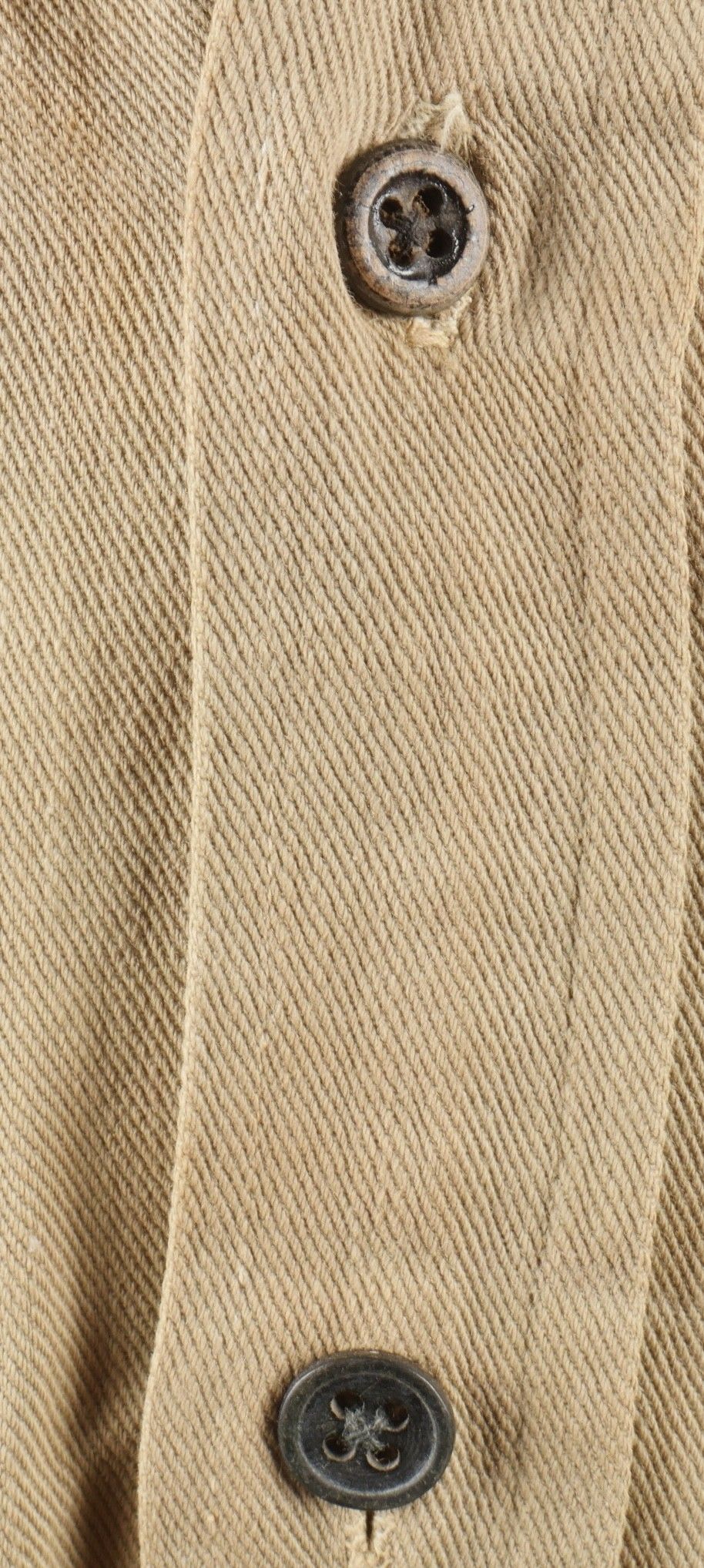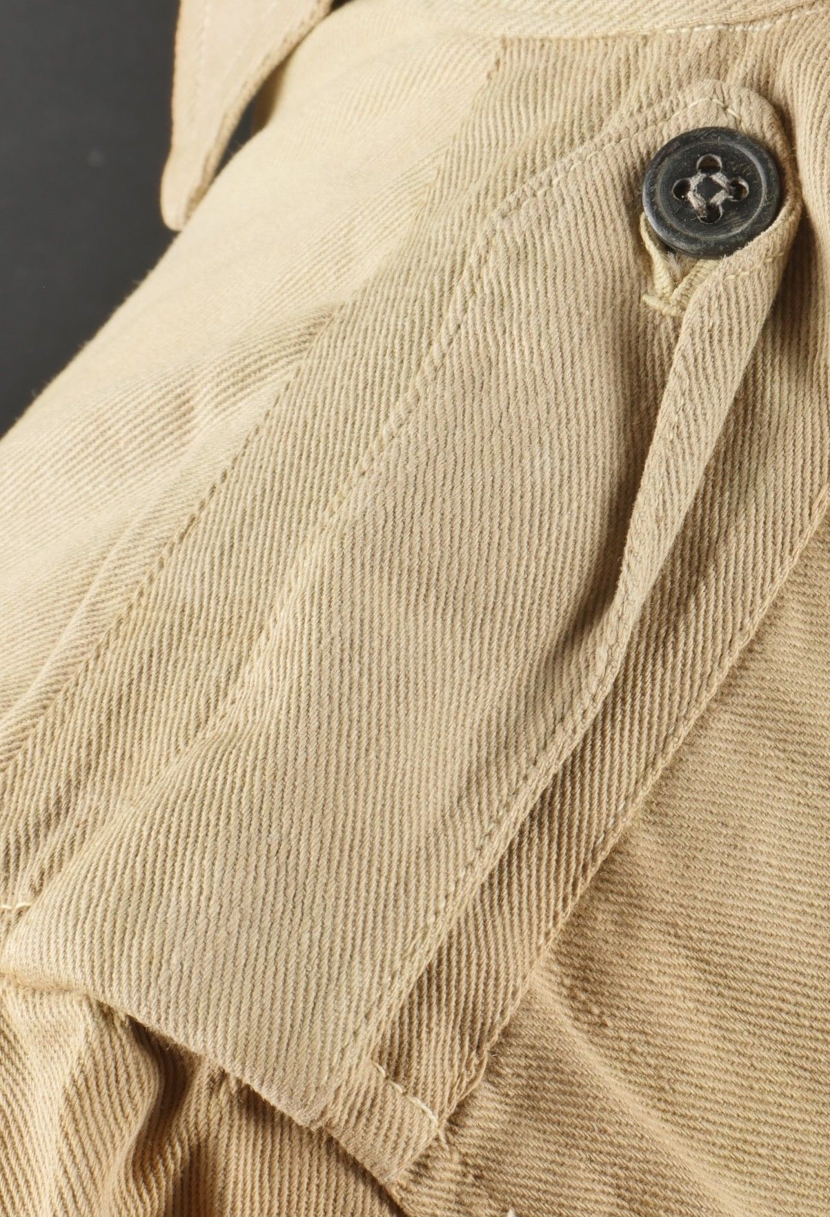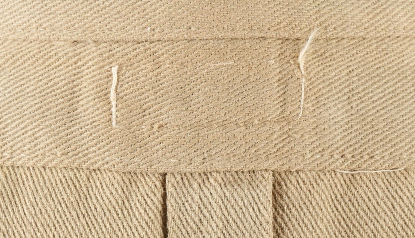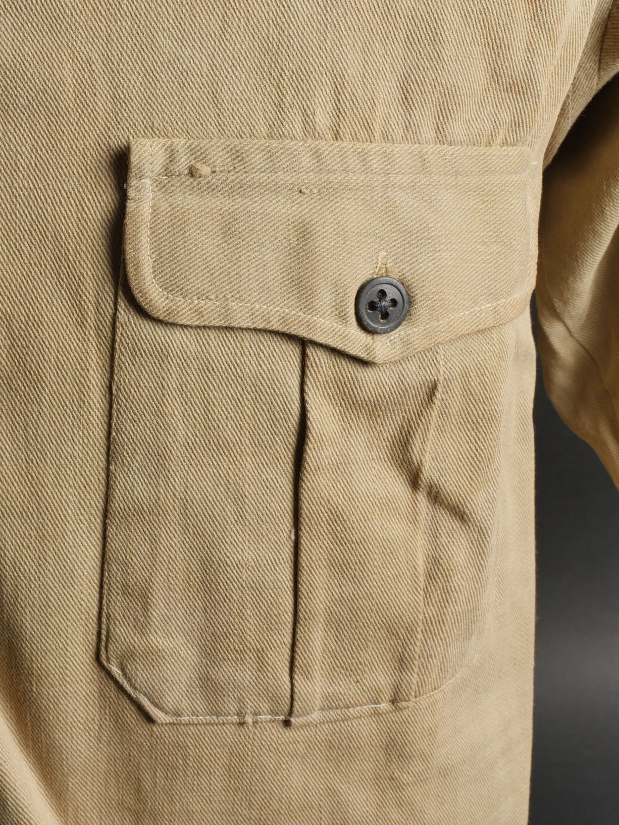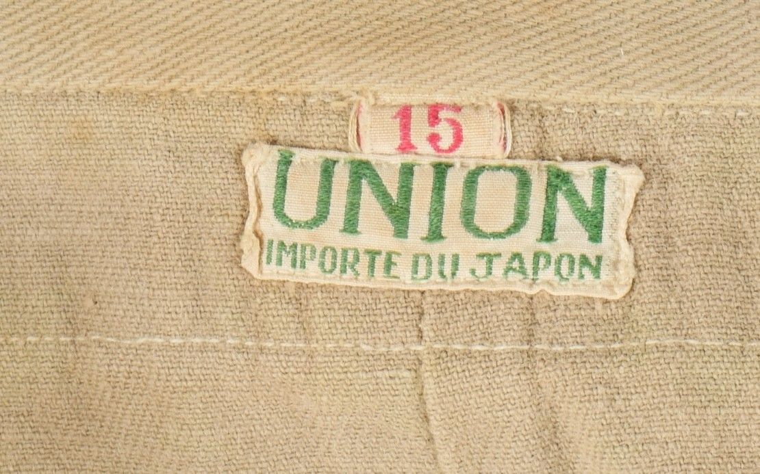 Ensemble d'effets Indochine. Comprenant un petit blouson chemisette de fabrication Extrême Orient copié sur le battledress britannique, fabriqué en tissu HBT, ce type de blouson est notamment observé chez les fusiliers marins et commandos marine. Un brelage TAP 53 en toile kaki, rivets pleins, tampon de fabricant présent mais illisible. Un ceinturon TAP 50 en toile kaki, double passant arrondi présent mais toile accidentée à l'arrière. Gourde modèle 1951, passants toile, housse datée 1954. Etui pour PA de fabrication locale en cuir fauve pour P08, deux emplacements pour chargeurs et un pour clé de démontage, ainsi qu'un logement latéral pour la baguette P08. Une chemisette en toile beige de confection Union, importée du Japon, deux poches de poitrine. Un chapeau de brousse de fabrication Extrême Orient en toile kaki claire, œillets en aluminium, jugulaire présente, grosse pression présentant des traces d'oxydation. Indochina effects set. Includes a short HBT jacket copied from the British battledress made in the Far East this type worn by naval fusiliers and commandos. TAP 53 web harness khaki with solid rivets maker mark illegible. TAP 50 belt in khaki webbing double rounded keepers rear webbing damaged. 1951 model canteen with web cover dated 1954. Locally made brown leather P08 holster with two magazine slots one for a takedown tool and a side slot for cleaning rod. Beige canvas shirt maker Union imported from Japan two breast pockets. Light khaki Far East bush hat aluminum eyelets chinstrap present large snap showing oxidation.