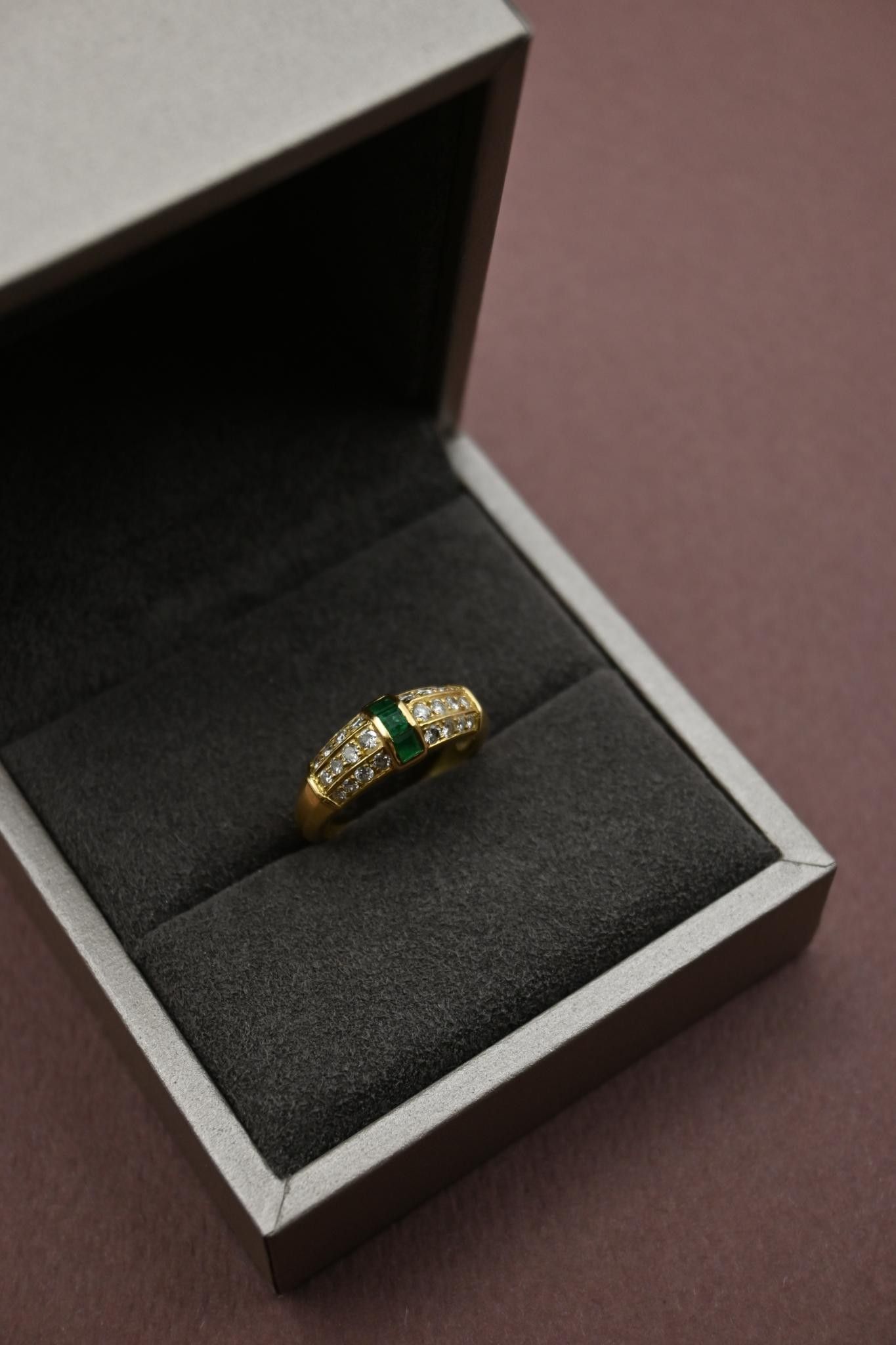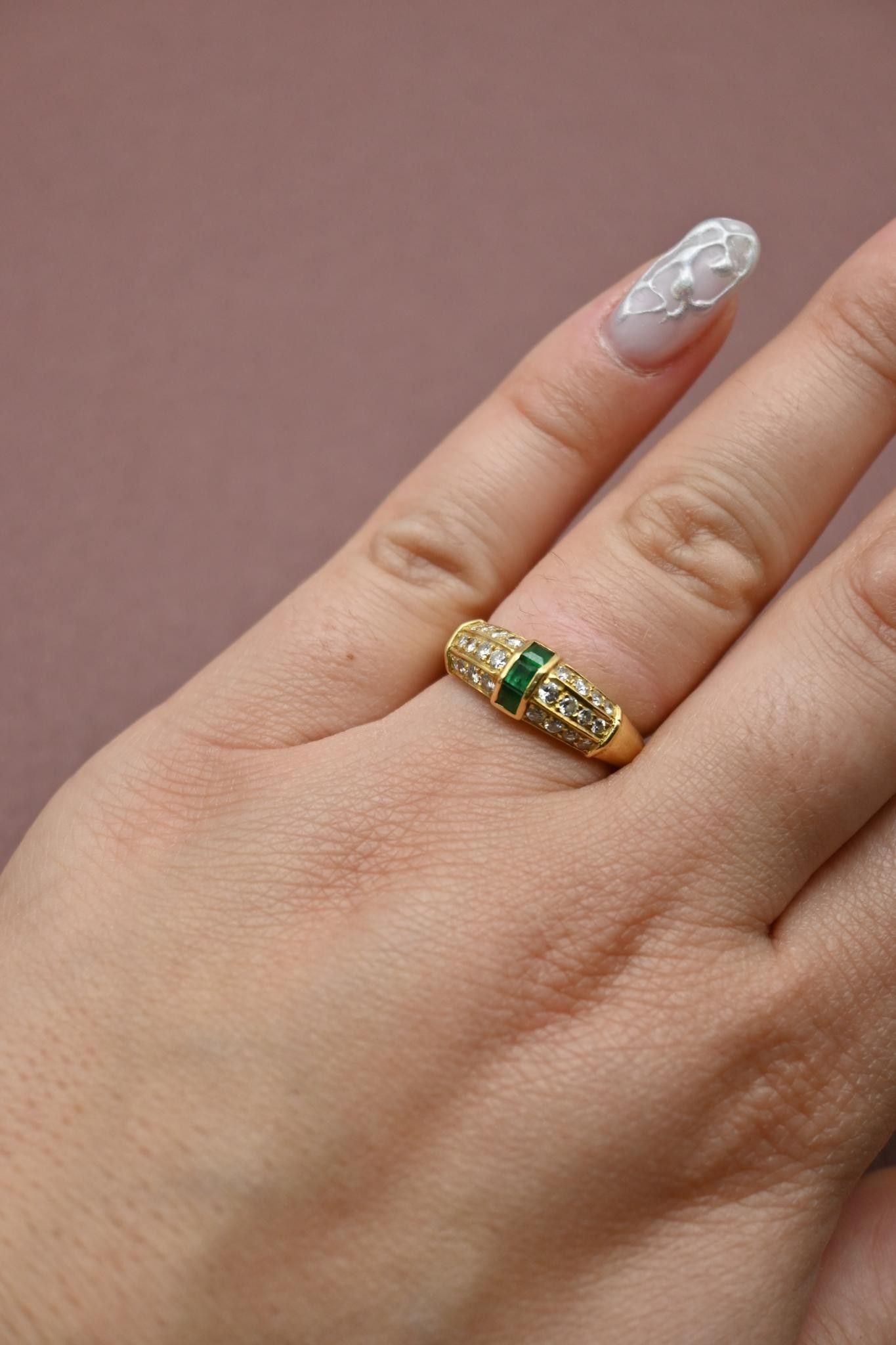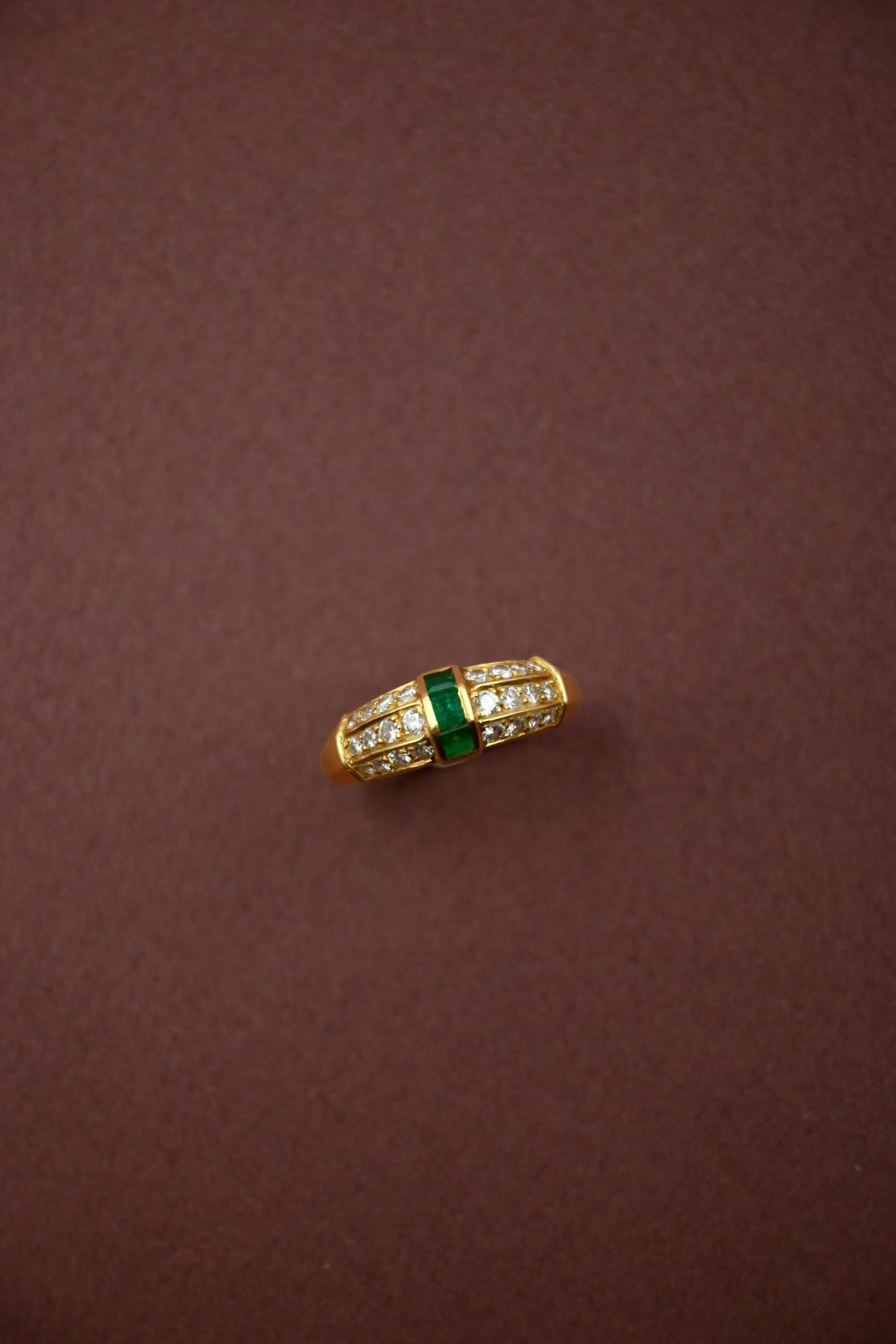 Bague en or 18K 750 millièmes centrée de trois émeraudes calibrées, épaulées de petits diamants en pavage.