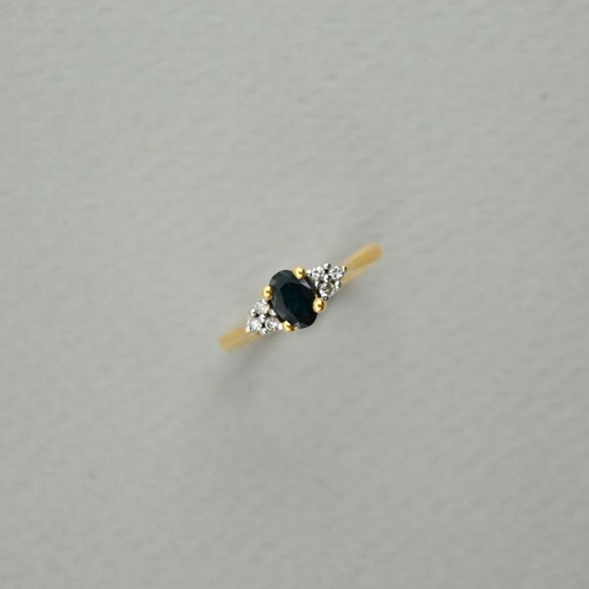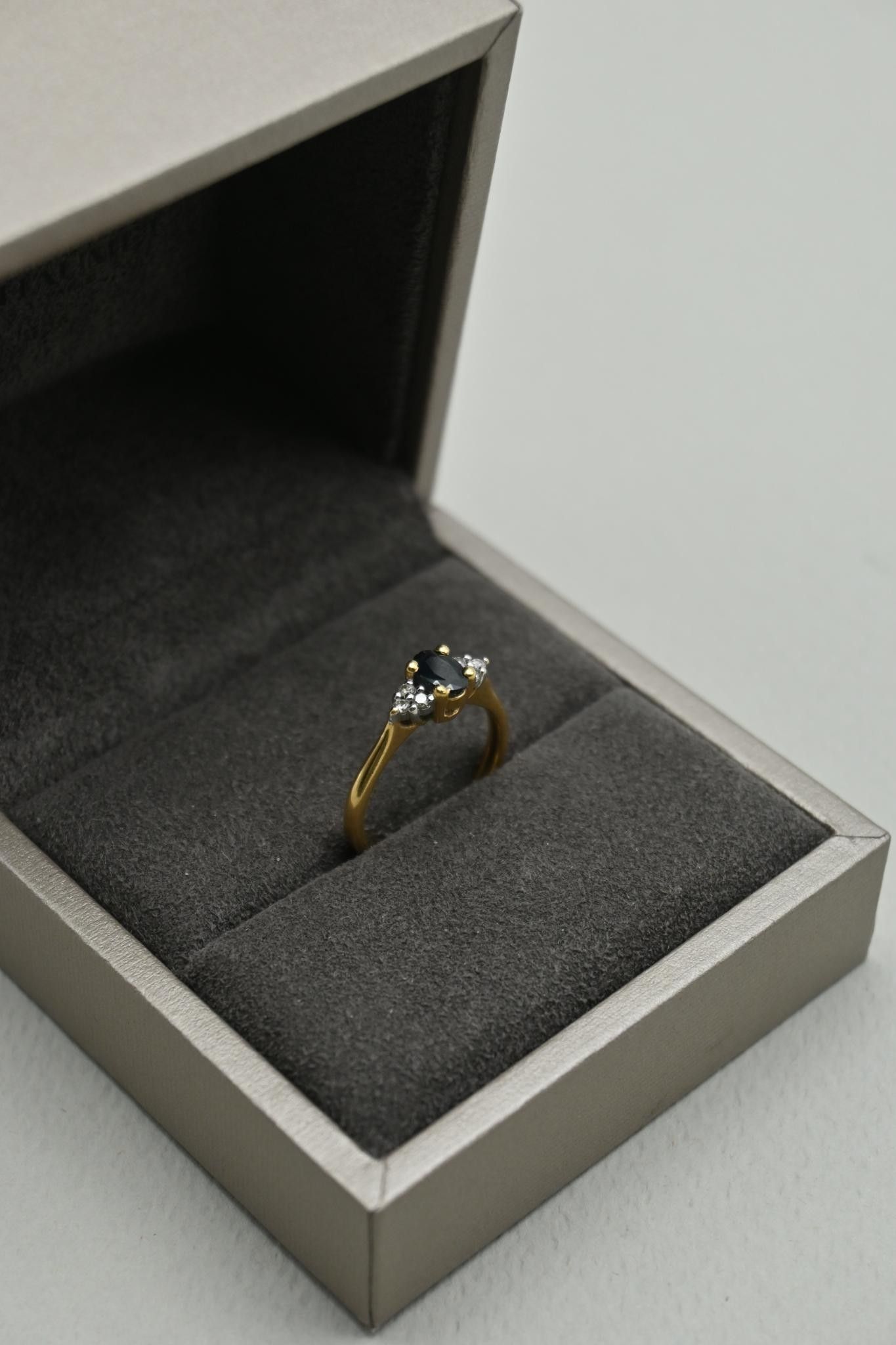 Bague en or 18K 750 millièmes, saphir ovale et six petits diamants. Tour de doigt : 53 Poids brut : 2.5 g