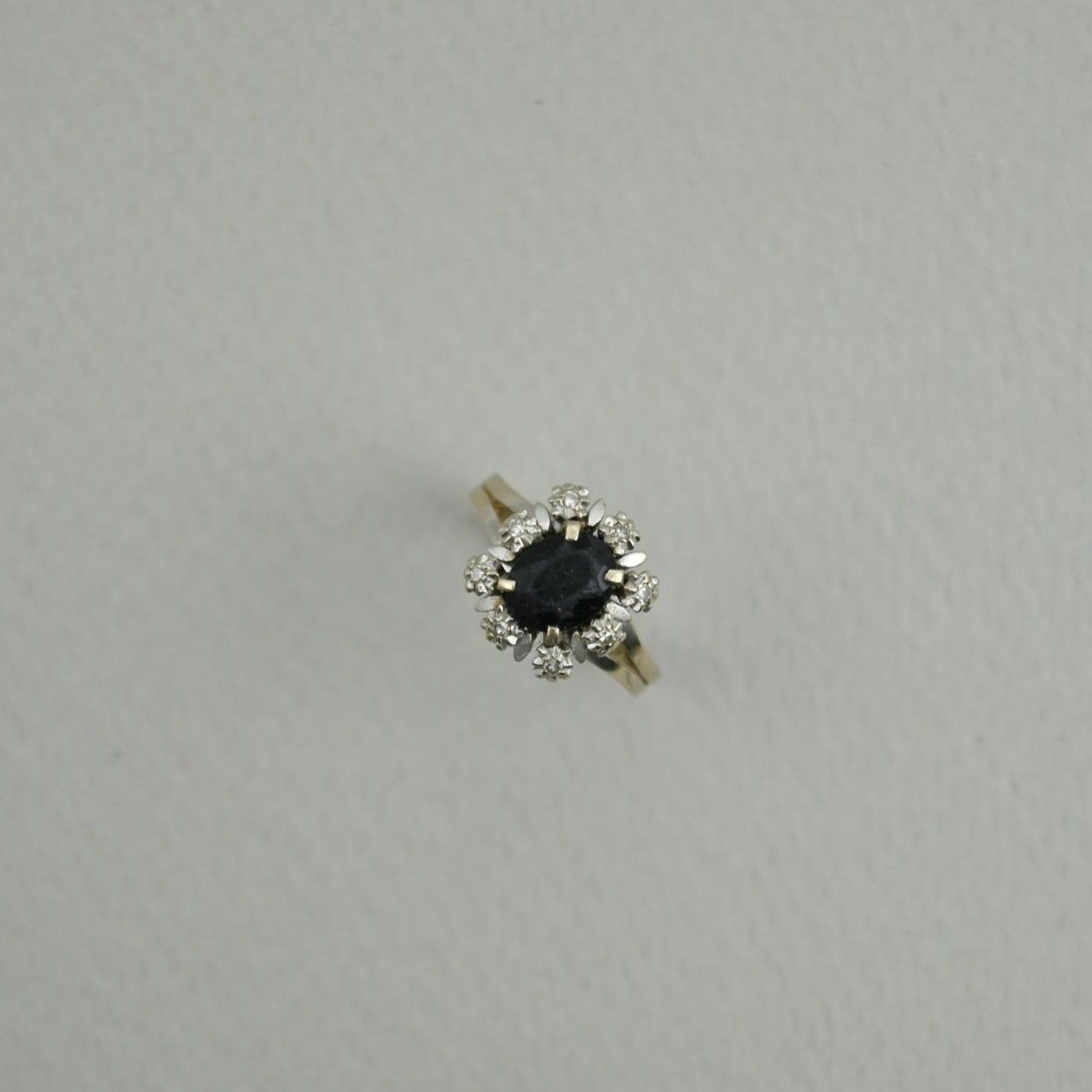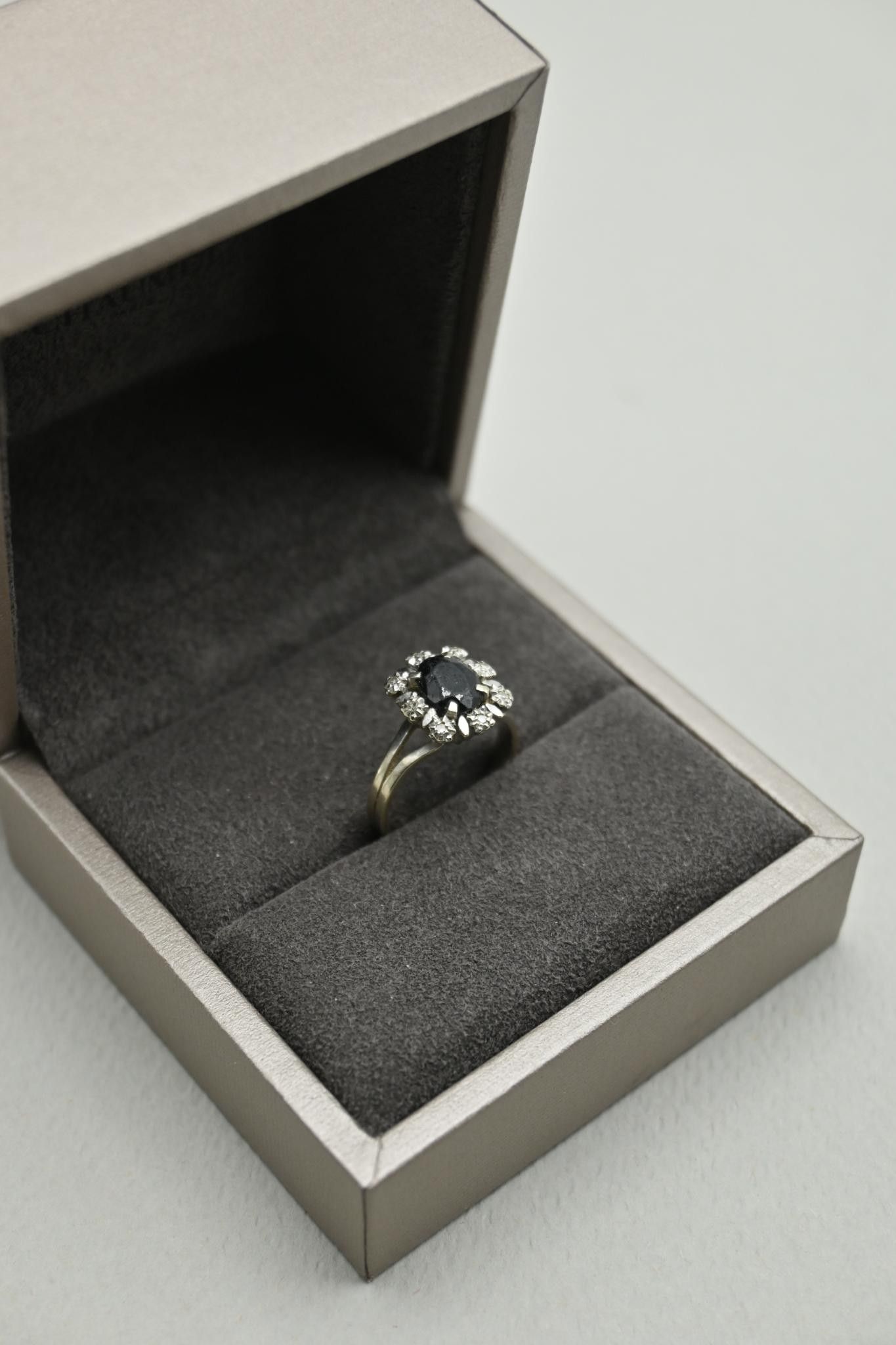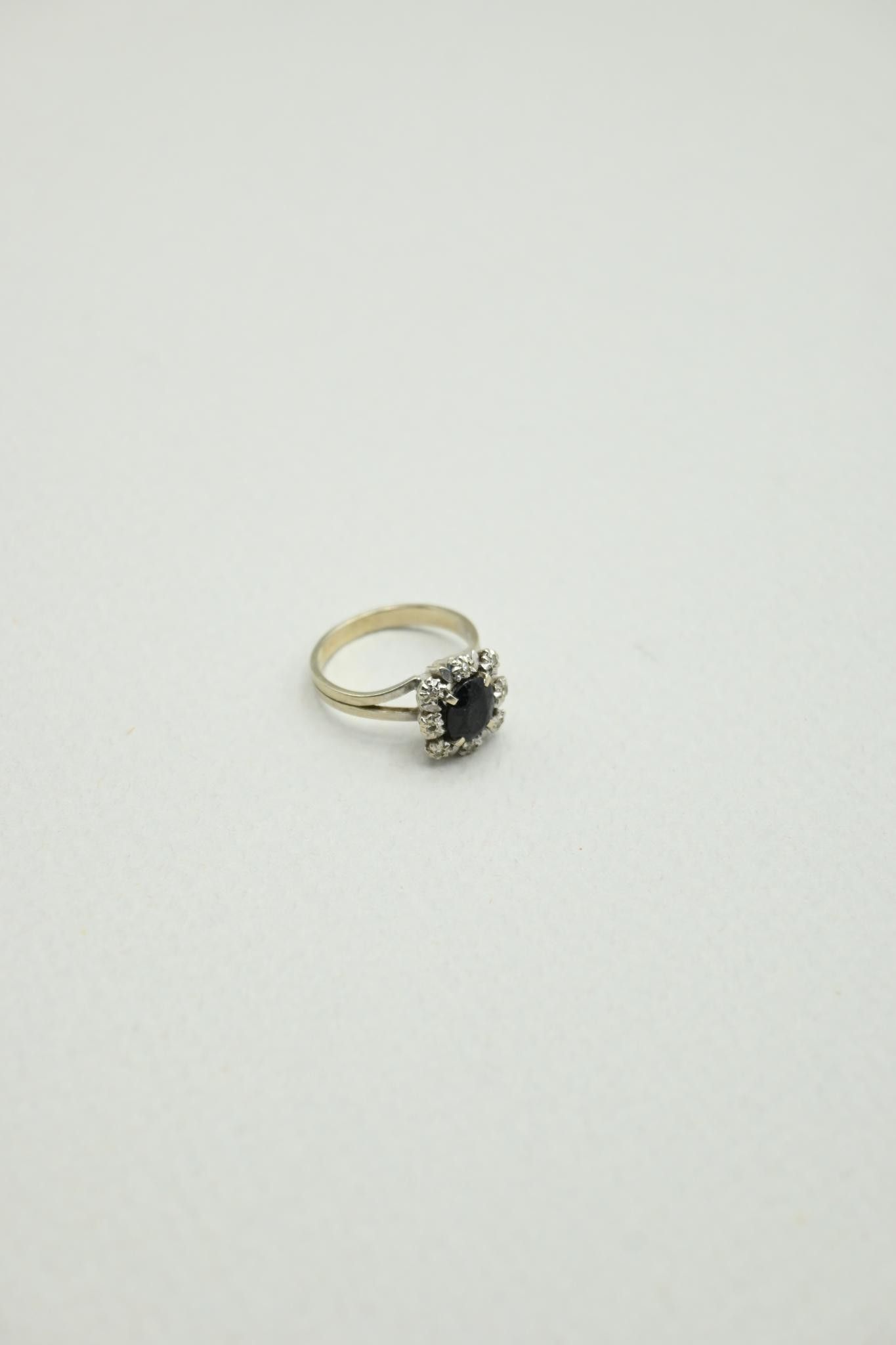 Bague Marguerite en or gris 18K 750 millièmes centrée d'un saphir (usé) dans un entourage de pierres.