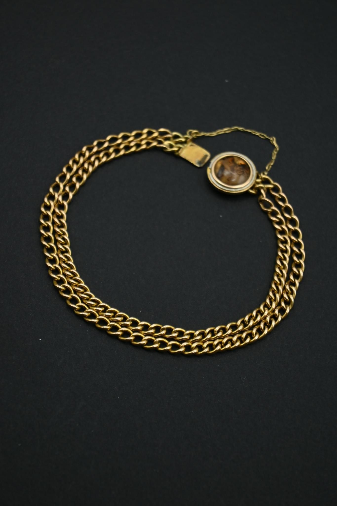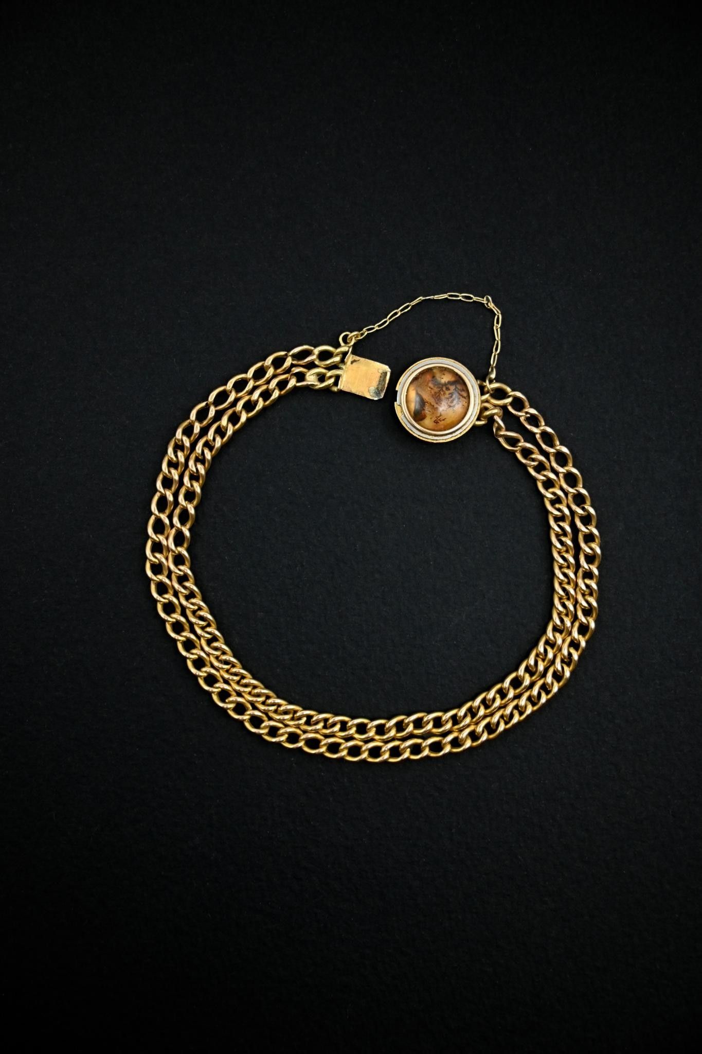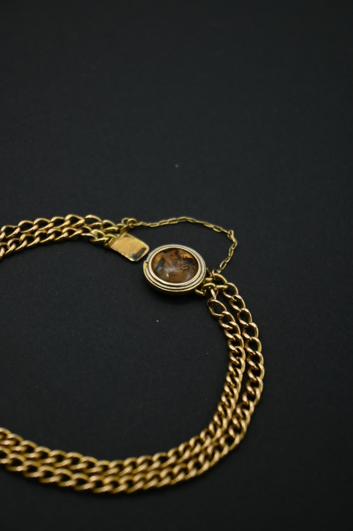 Bracelet double rangs en or 18K 750 millièmes. Fermoir rond orné d'une agate mousse. Avec chainette de sécurité
