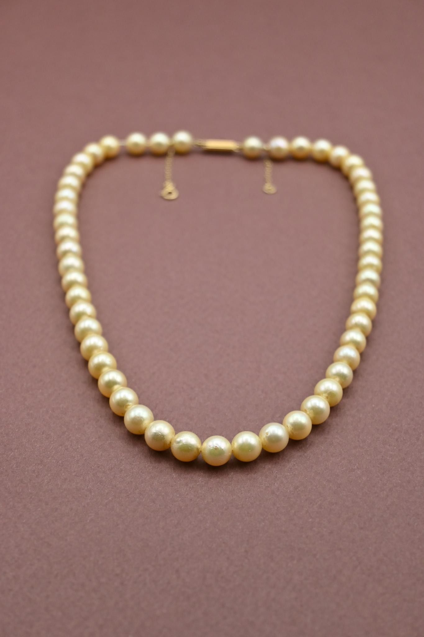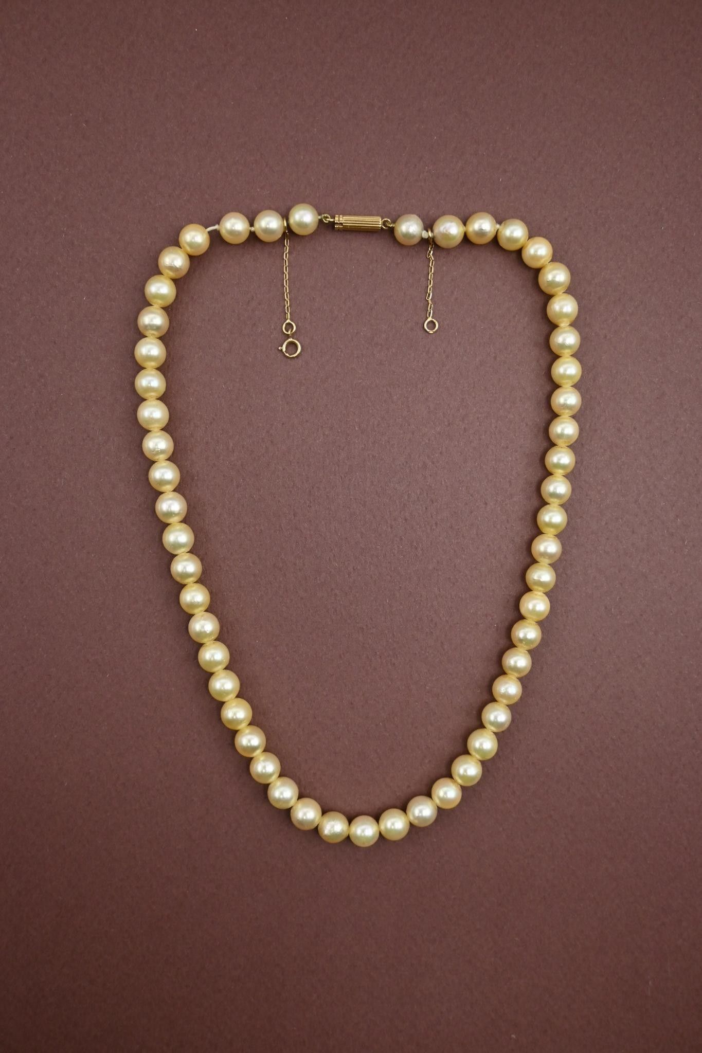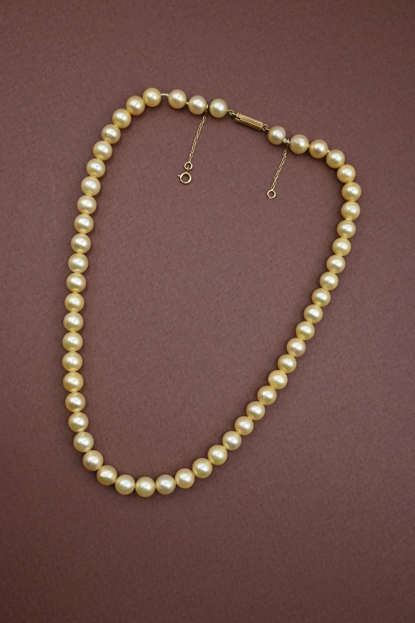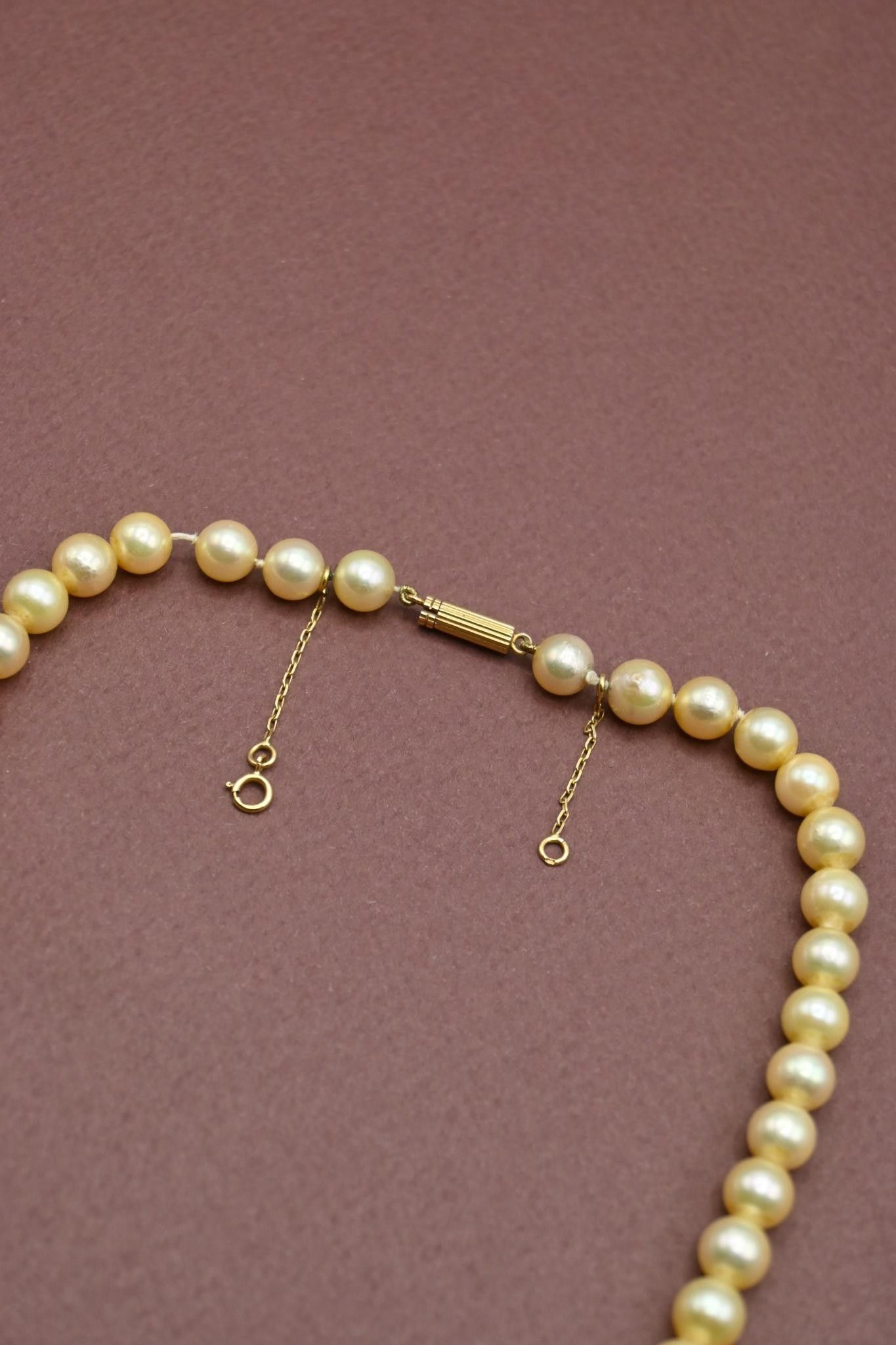 Collier de perles de cultures en chute (7,5 à 7,9 millimètre environ). Fermoir tube en or 18K 750 millièmes avec chaine de sécurité.