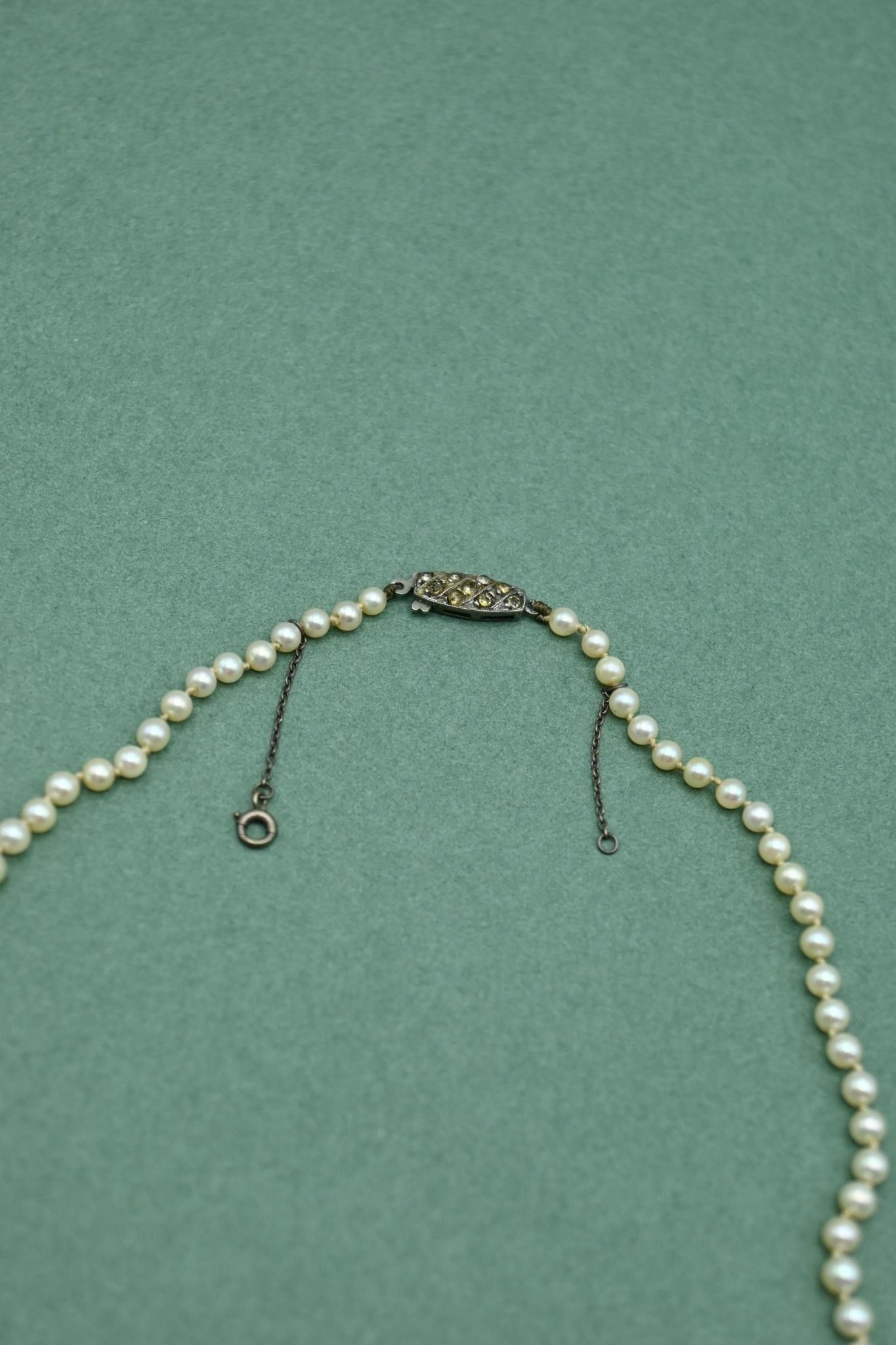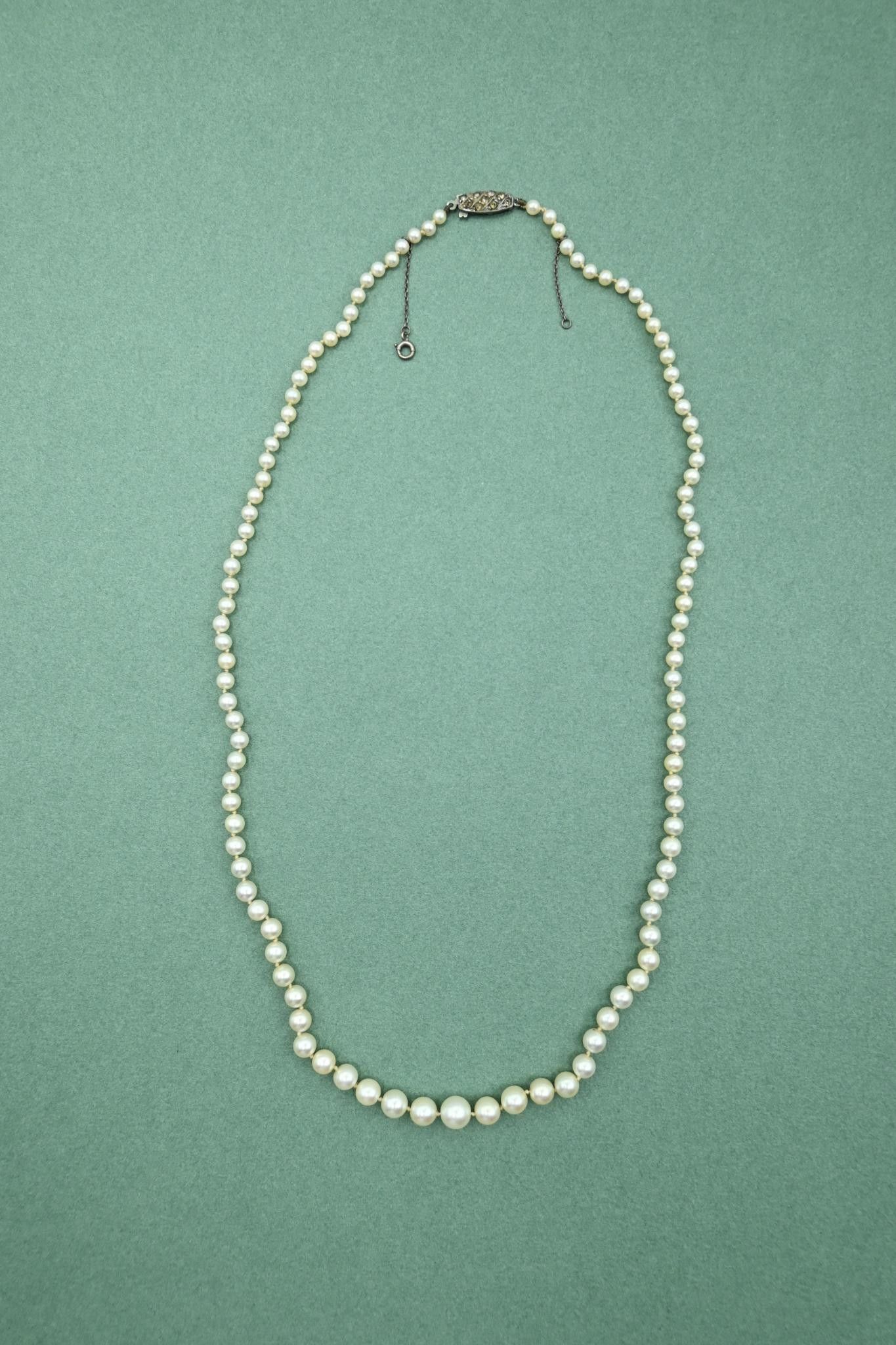Collier de perles de culture en chute, fermoir ancien en argent serti de strass