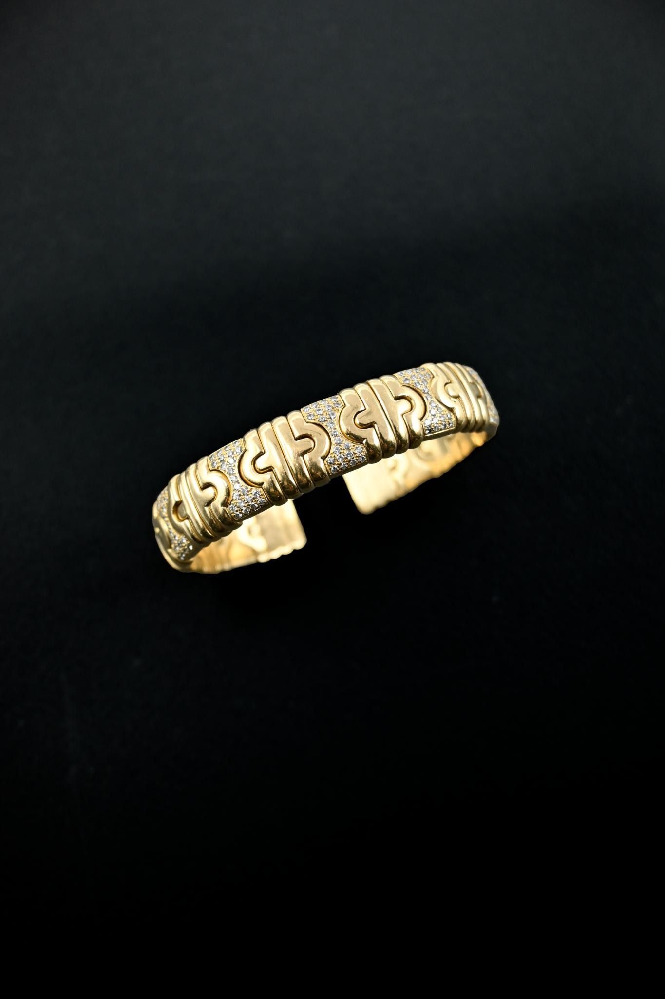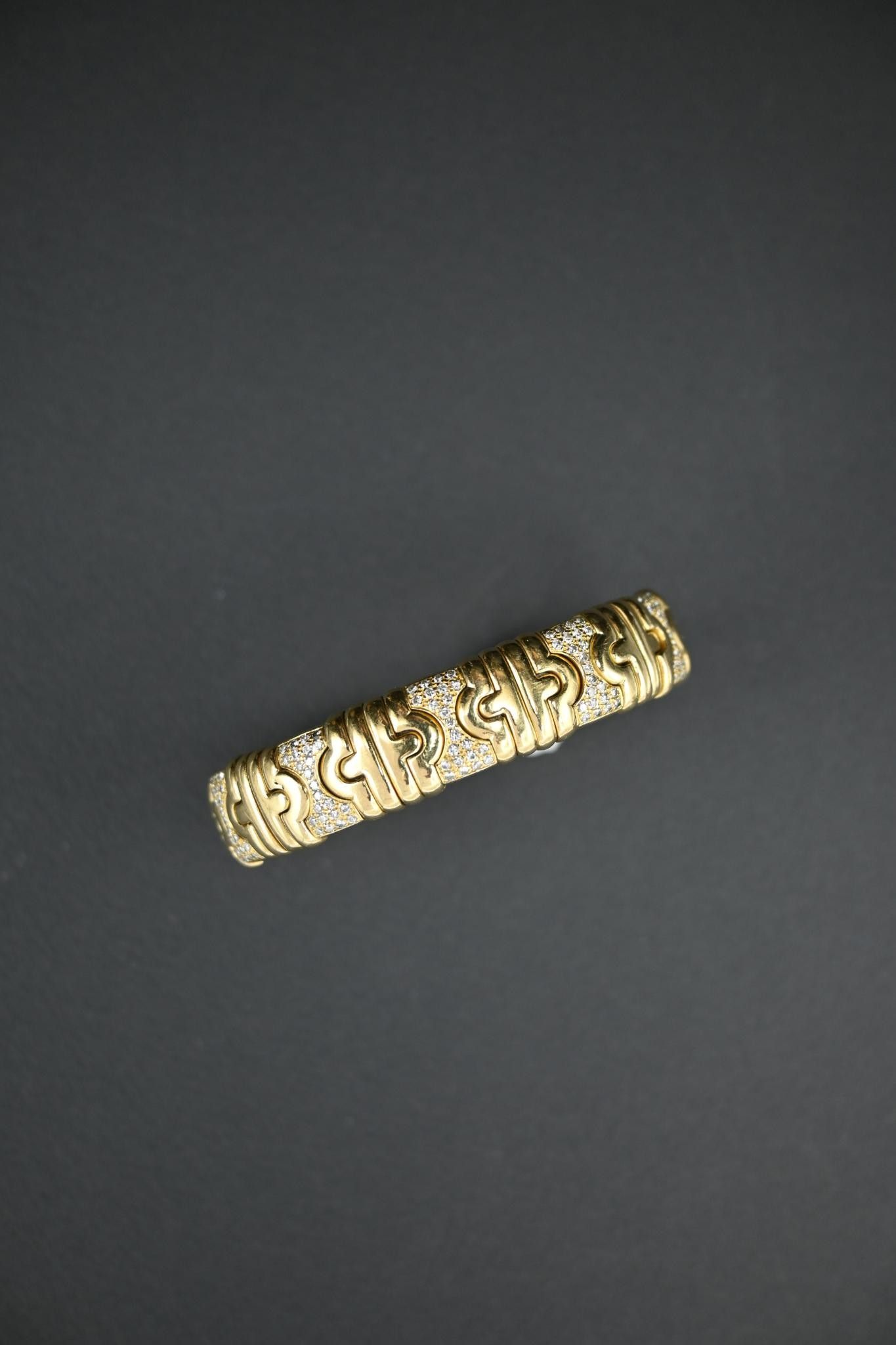 Bracelet de type jonc ouvert en or 18K 750 millièmes composé de divers éléments géométriques assemblés sur une lame métallique. Cinq éléments pavés de diamants en serti grain. Dans le goût des créations de la Maison Bulgari.