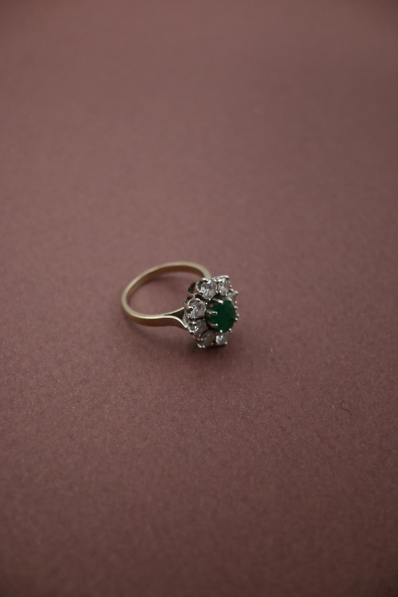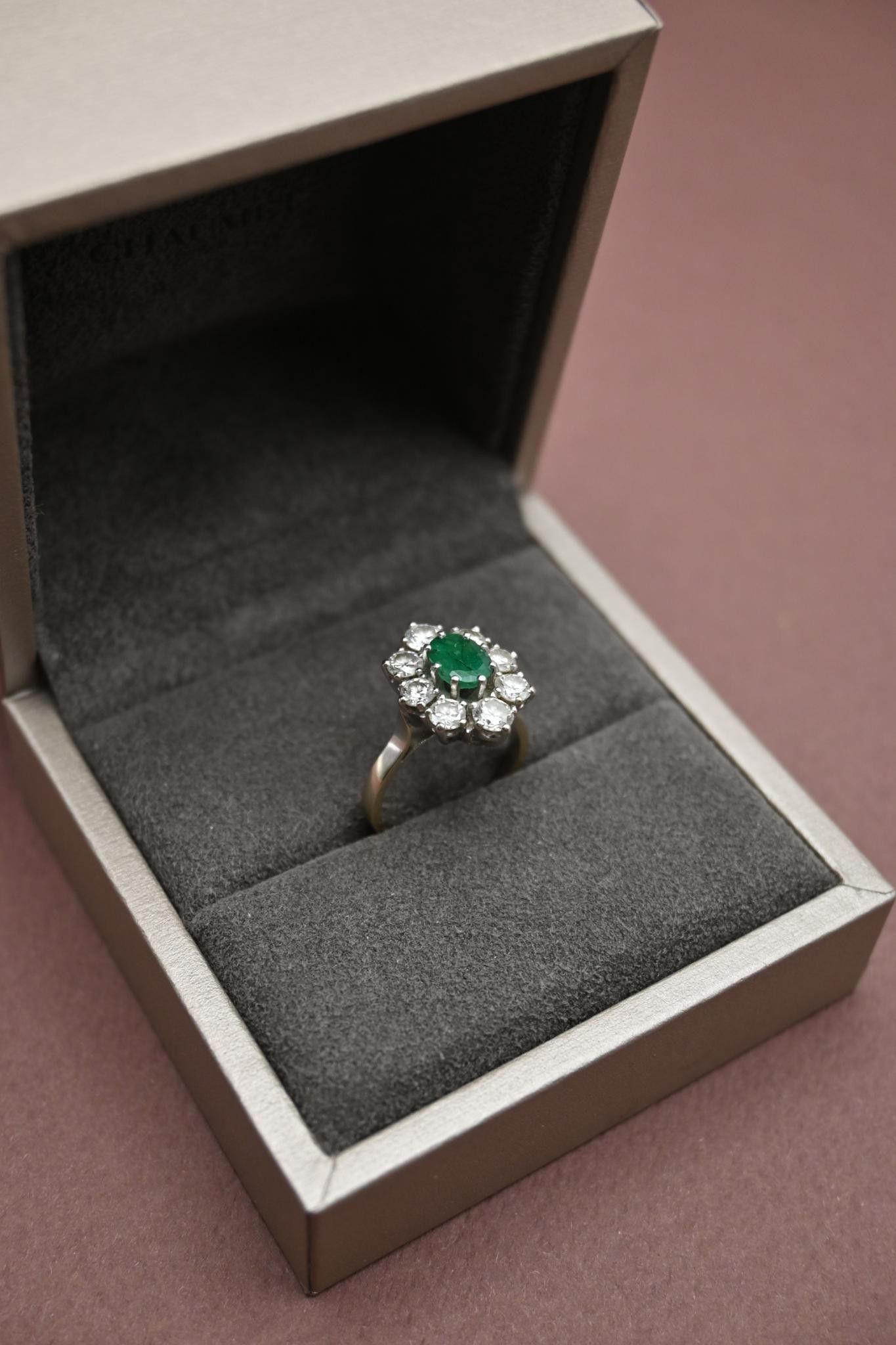 Bague fleur en or gris 18K 750 millièmes, émeraude ovale entourée de six diamants taille moderne (6 x 0.10ct et deux diamants d'environ 0.20ct)