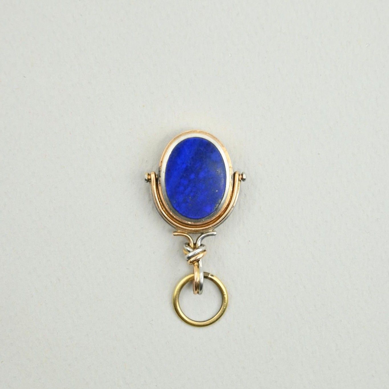 Sceau à cacheter formant pendentif en deux tons d'or 18K 750 millièmes, une face ornée d'armoiries en intaille sur agate, l'autre d'une tranche de lapis-lazuli non gravée.
