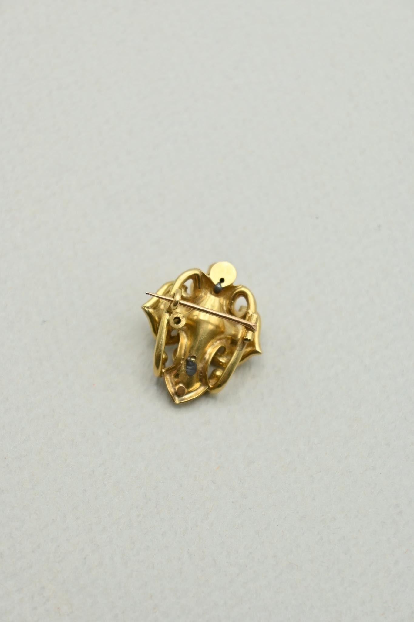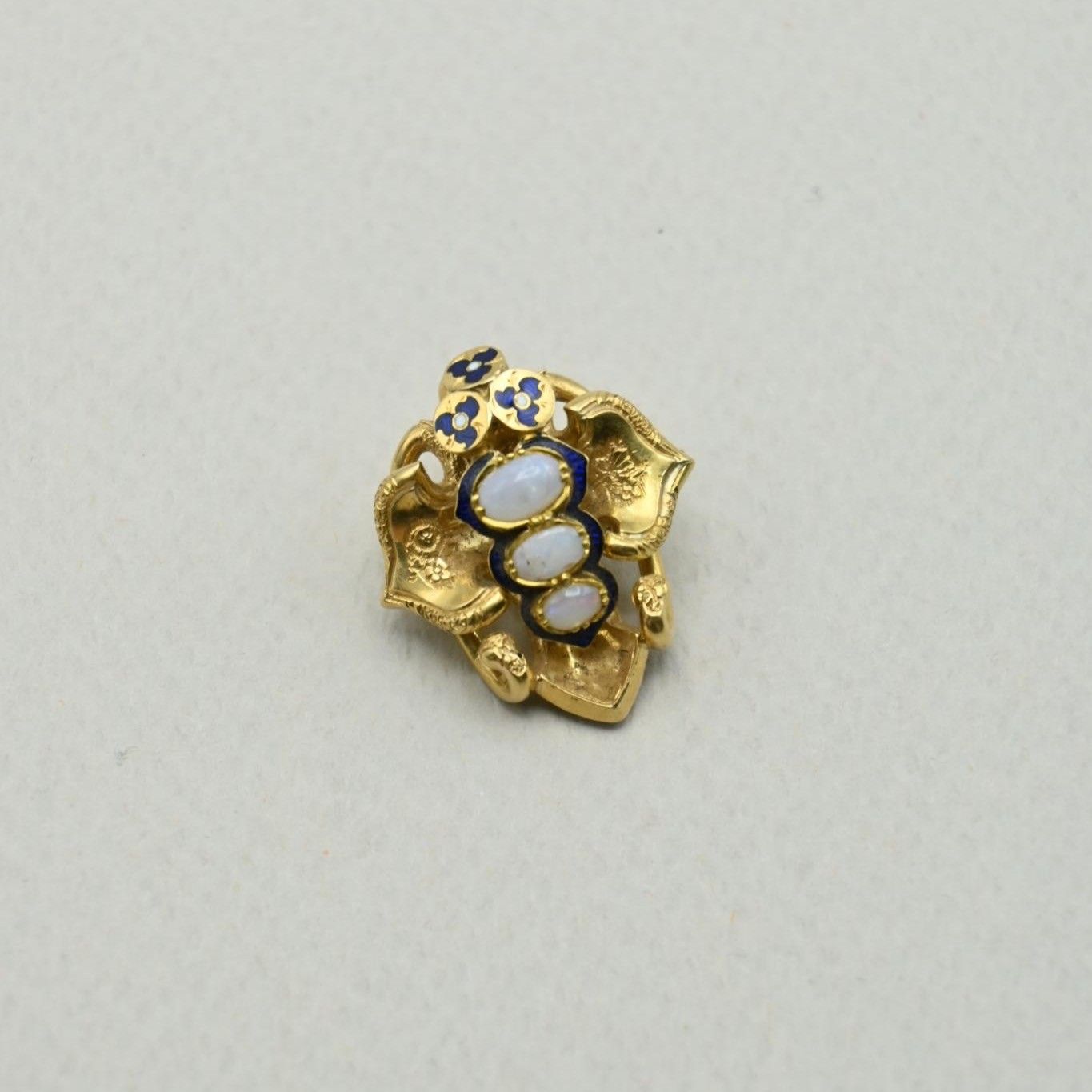Broche en or 18K 750 millièmes à décor de trois cabochons d’opales (chocs) et de fleurs d’émail bleu (manques). Issue d’une transformation. Epoque Napoléon III.