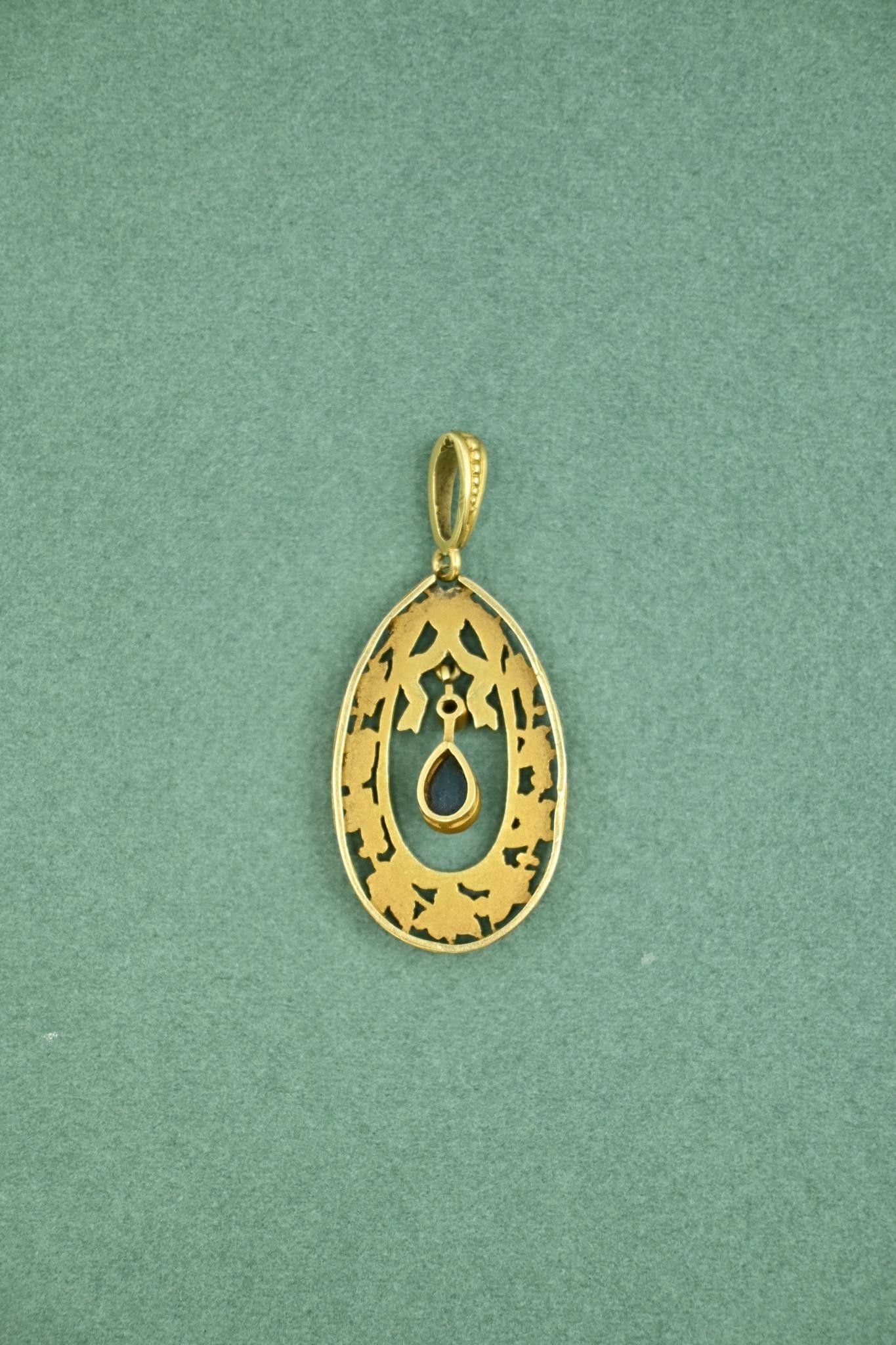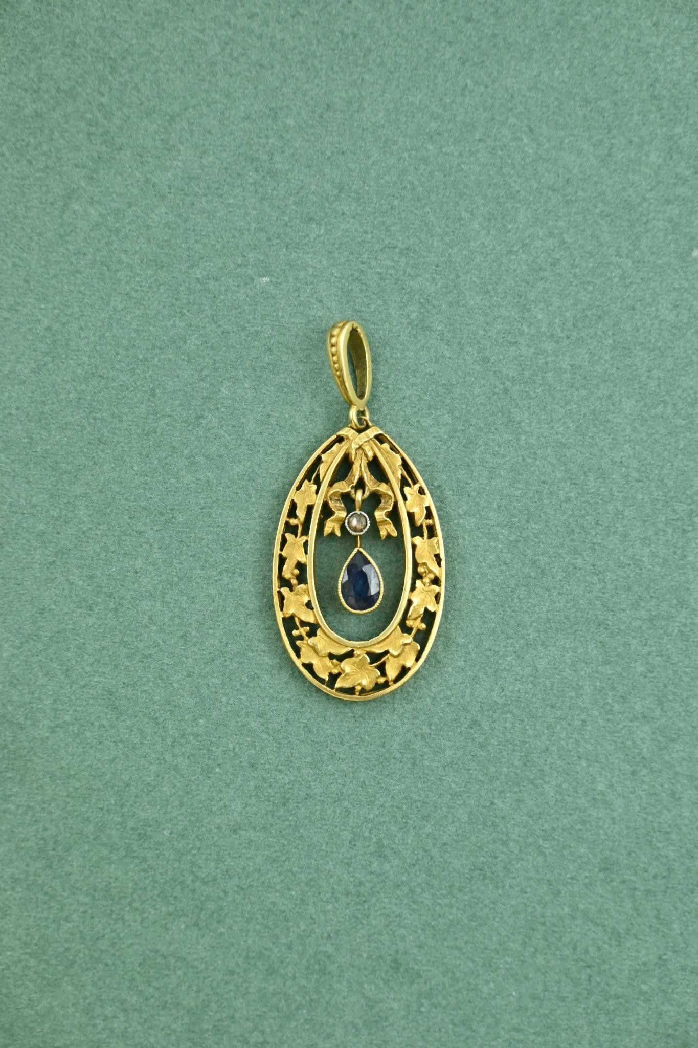 Pendentif ovale en or 18K 750 millièmes à décor de feuilles de lierre et d’une goutte en saphir avec petit diamant.
