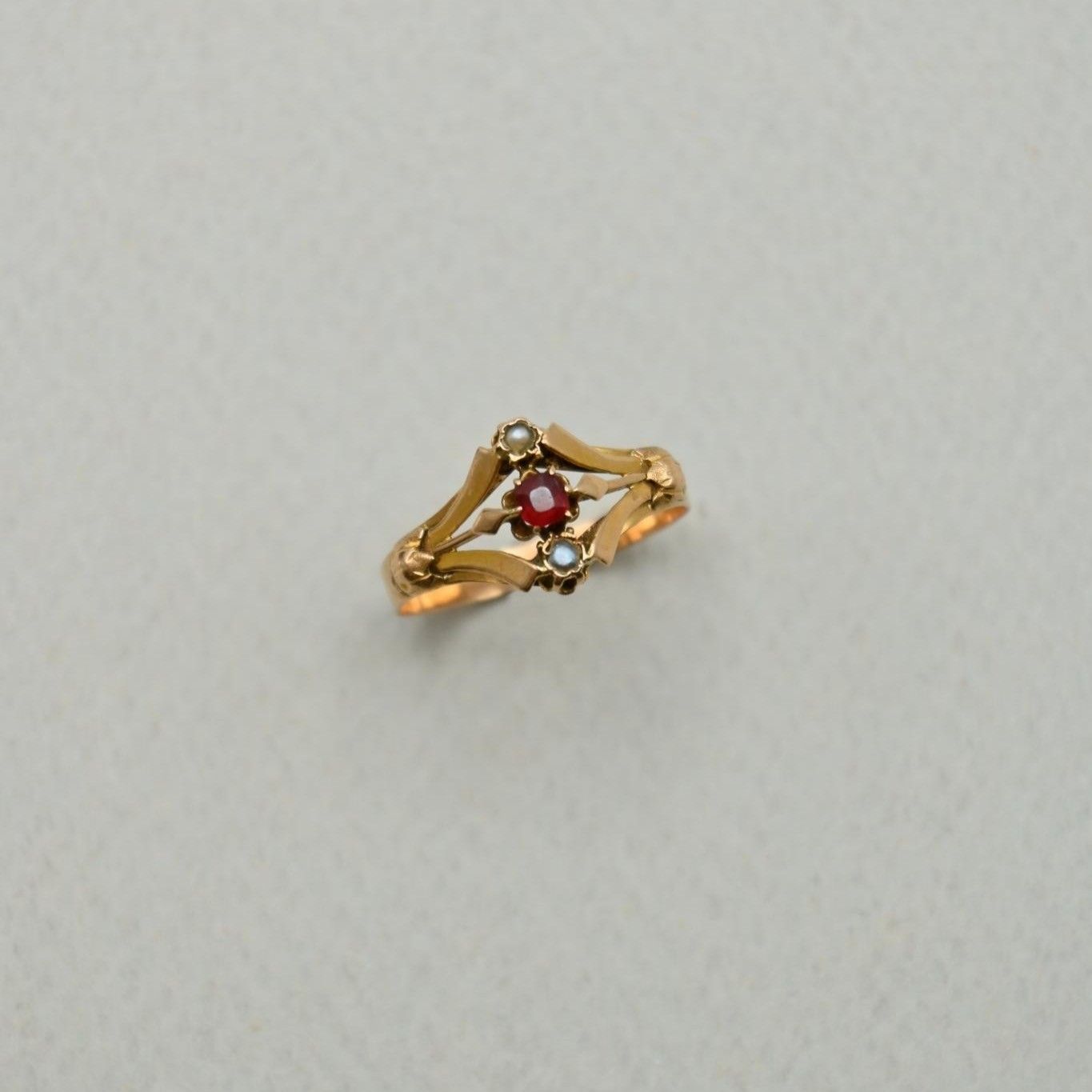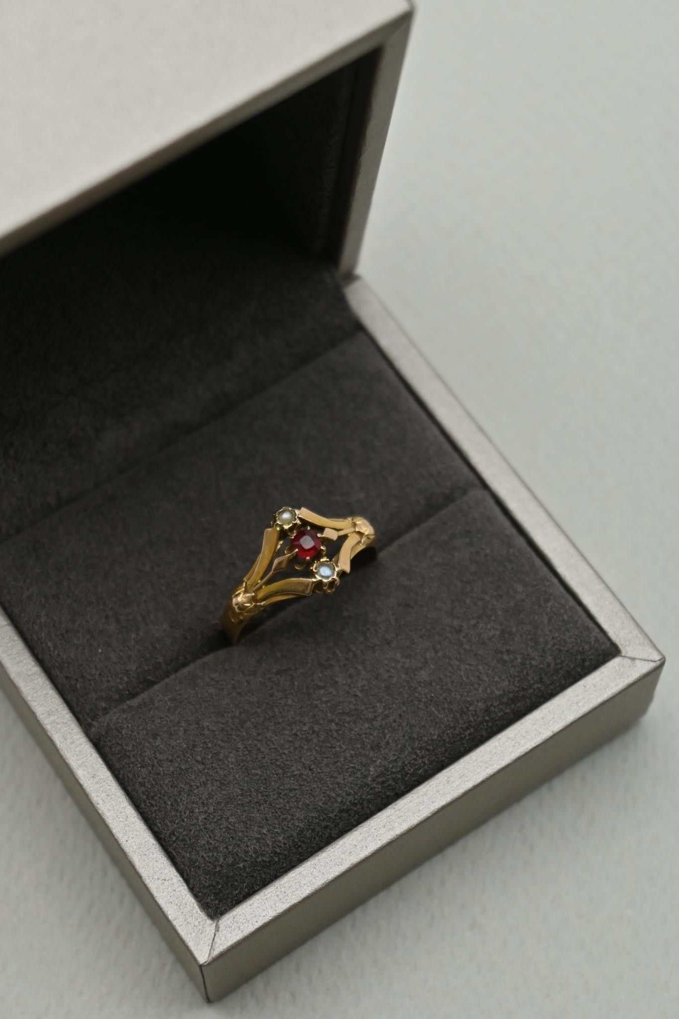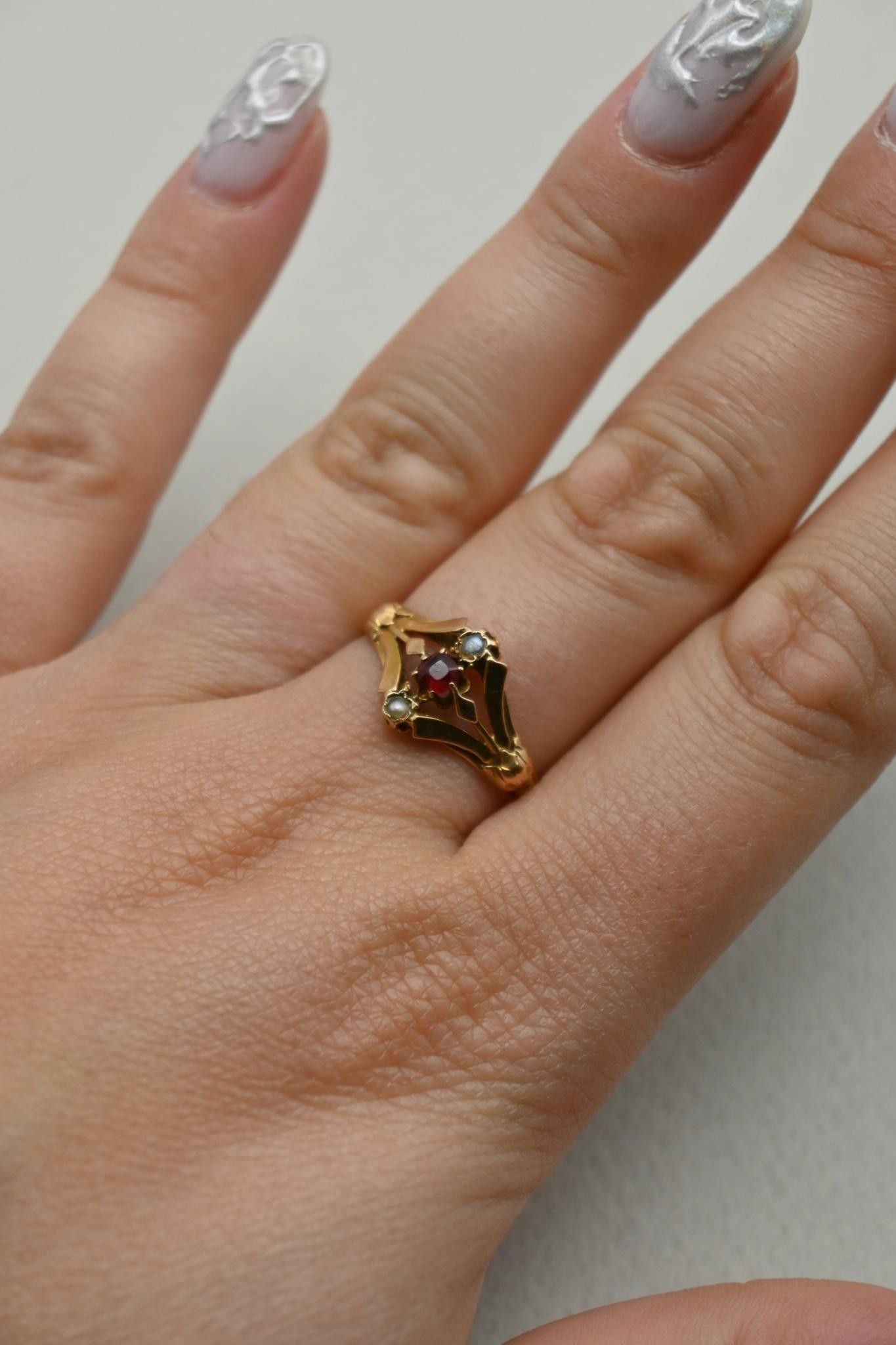 Bague ancienne en or 18K 750 millièmes sertie d’une pierre rouge et de perles.