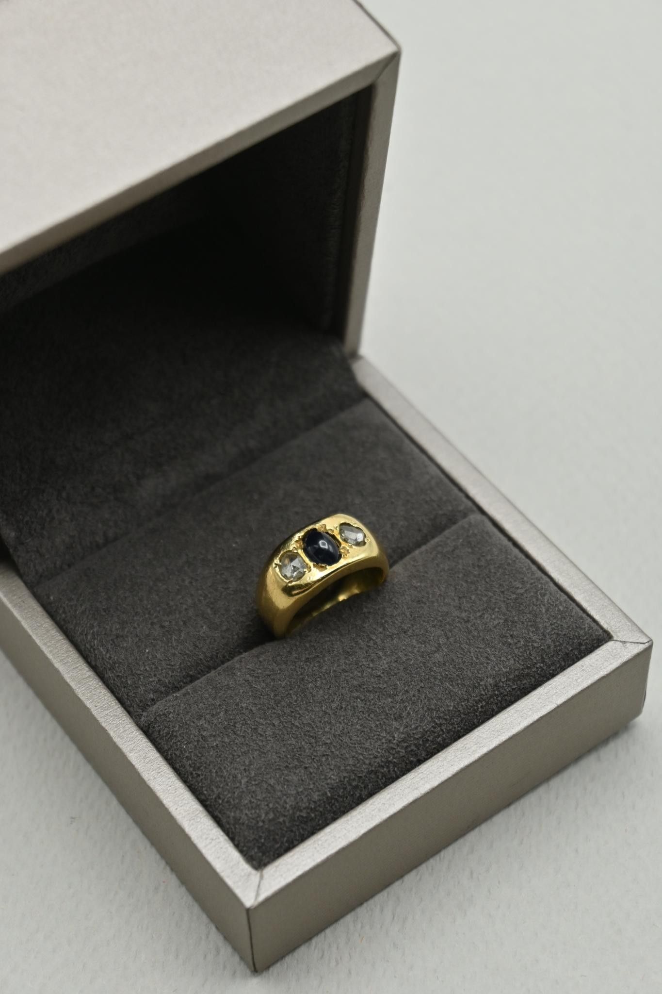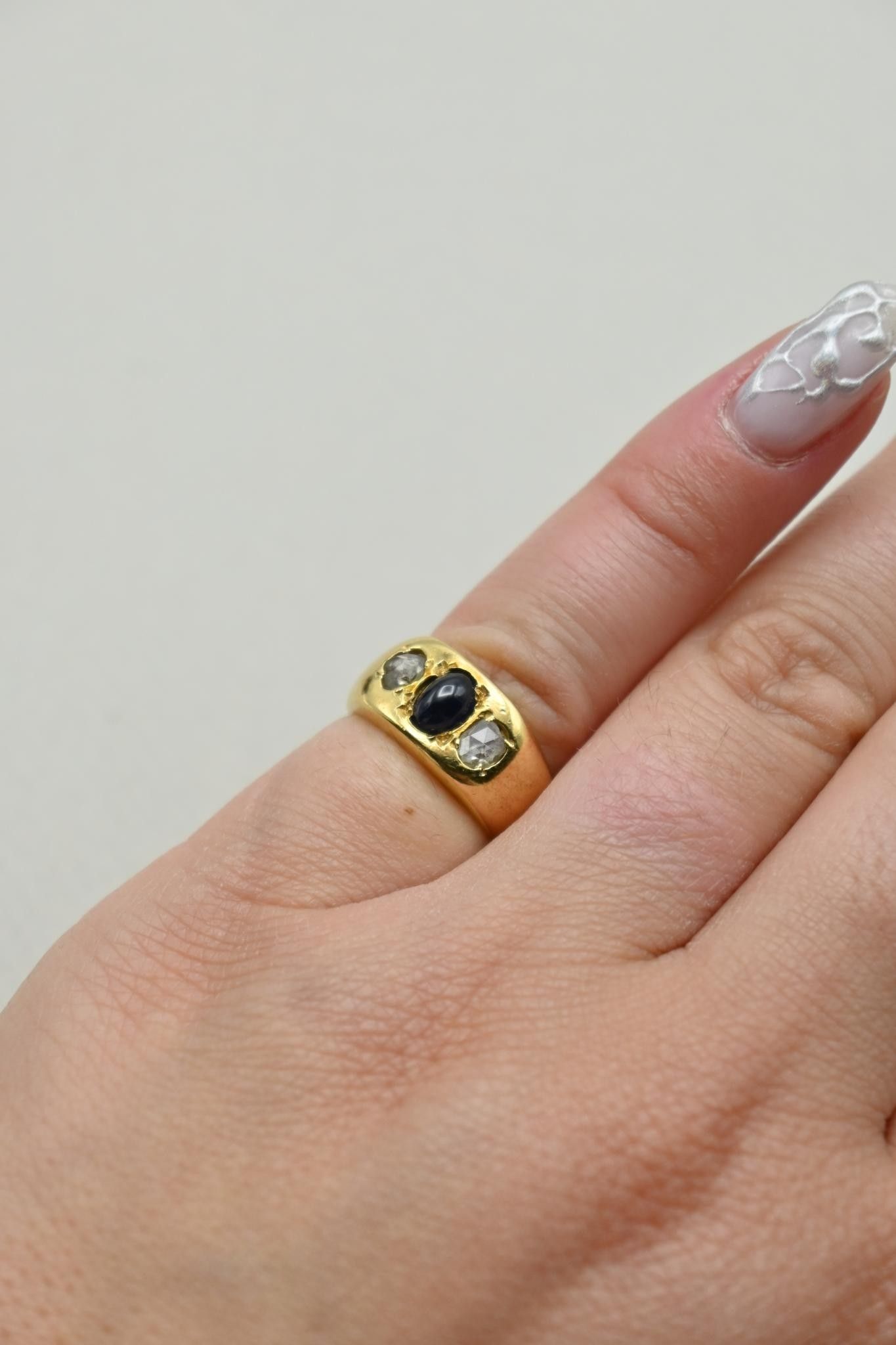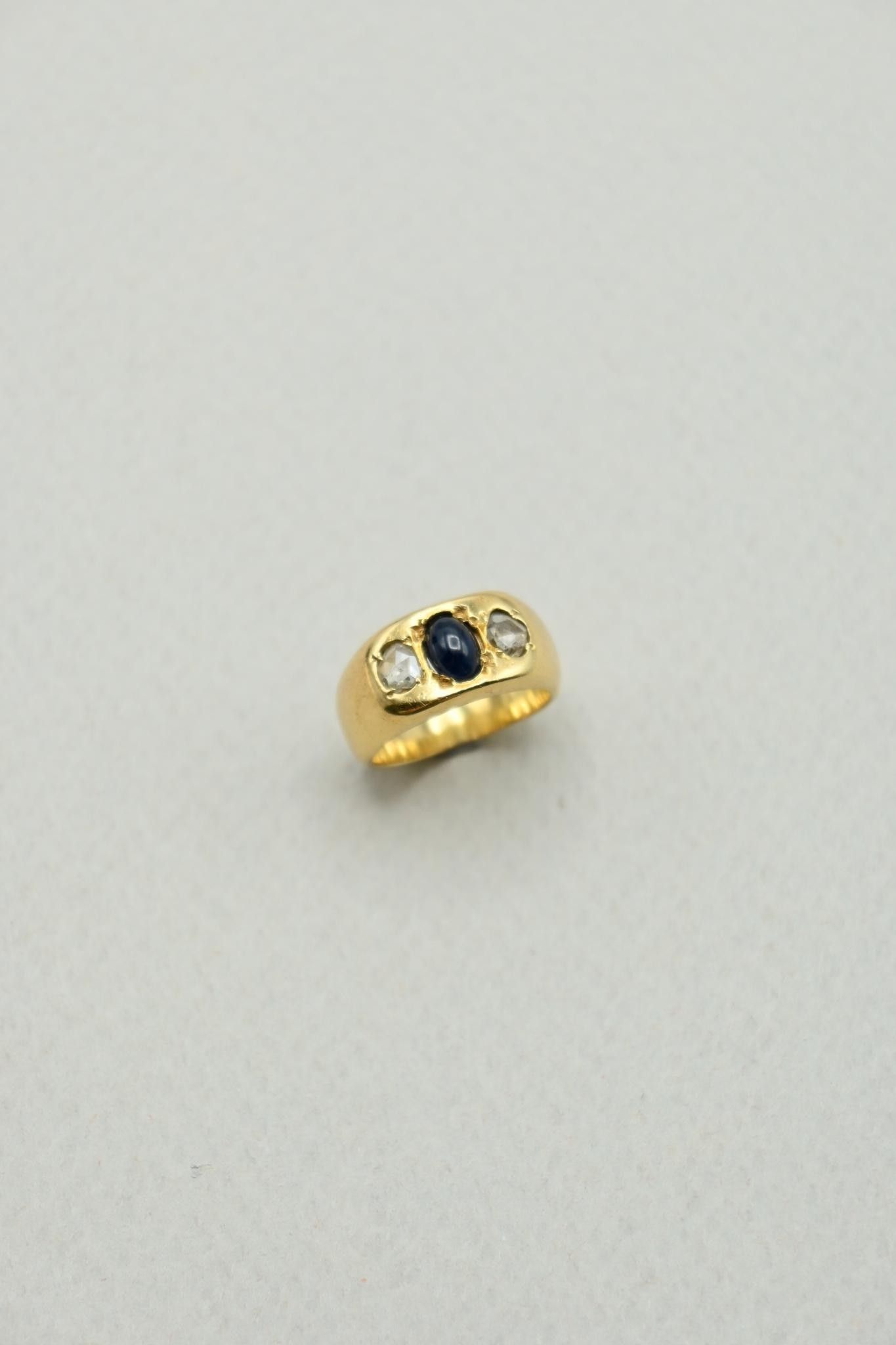 Bague type chevalière en or 18K 750 millièmes centrée d’un cabochon de saphir entouré de deux diamants taille rose.