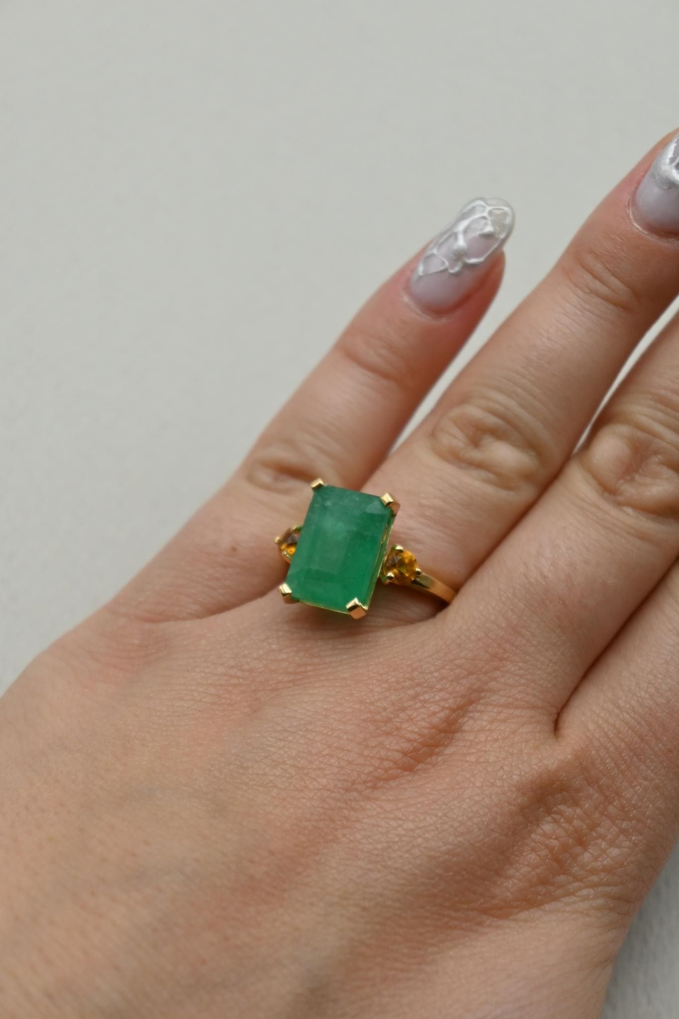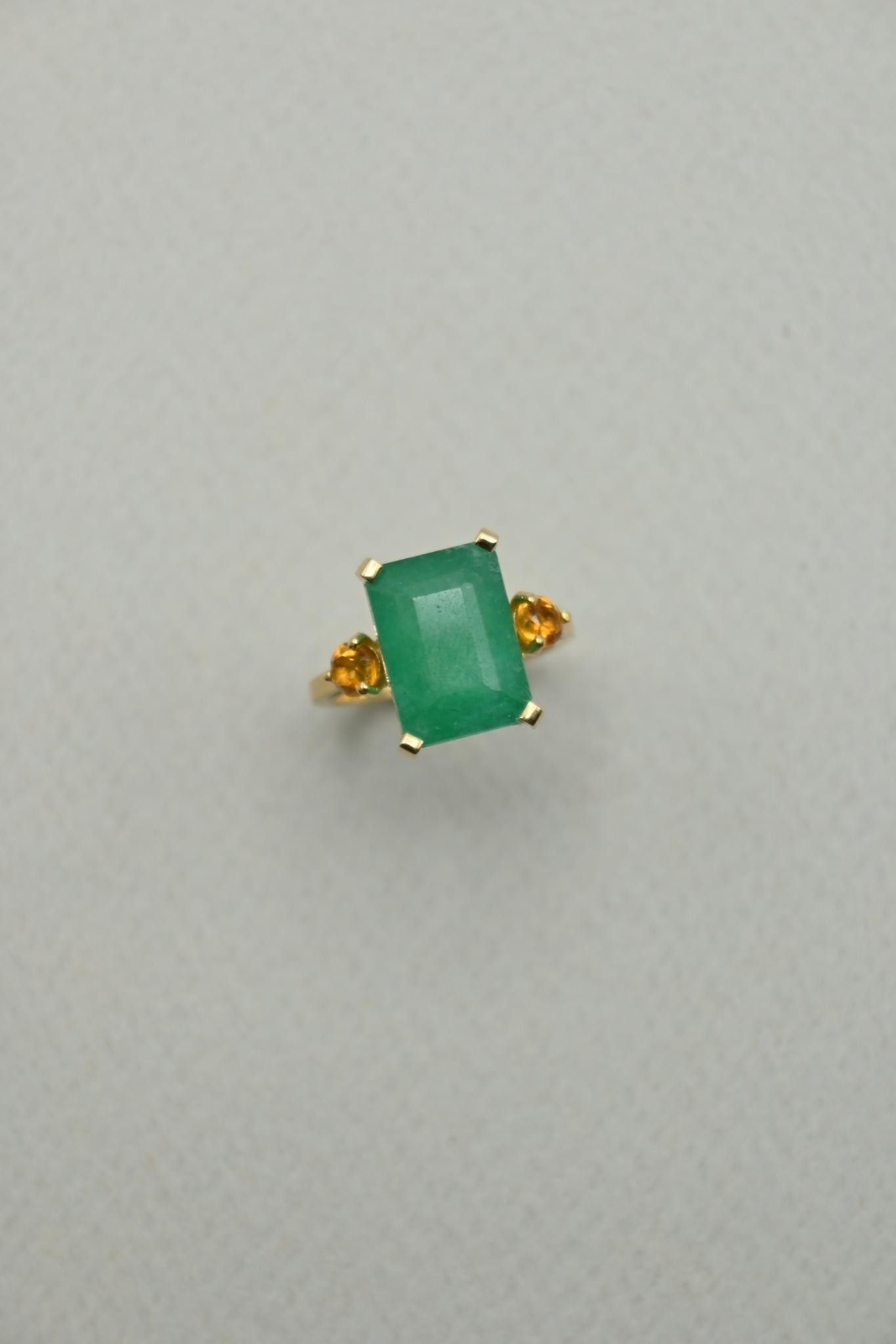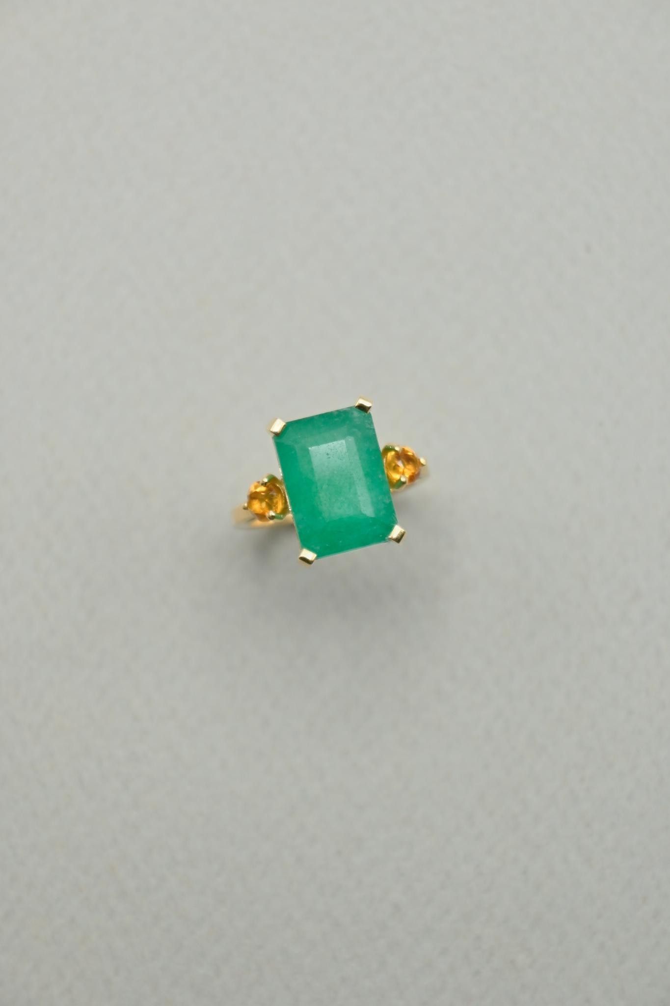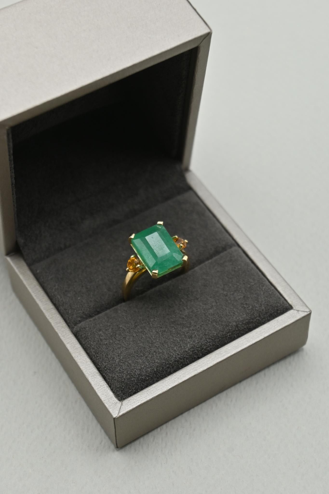 Bague en or 18K 750 millièmes ornée d’une émeraude rectangle (14,10-10,10 x 8,2 mm environ) épaulée de deux saphirs orange synthétiques.