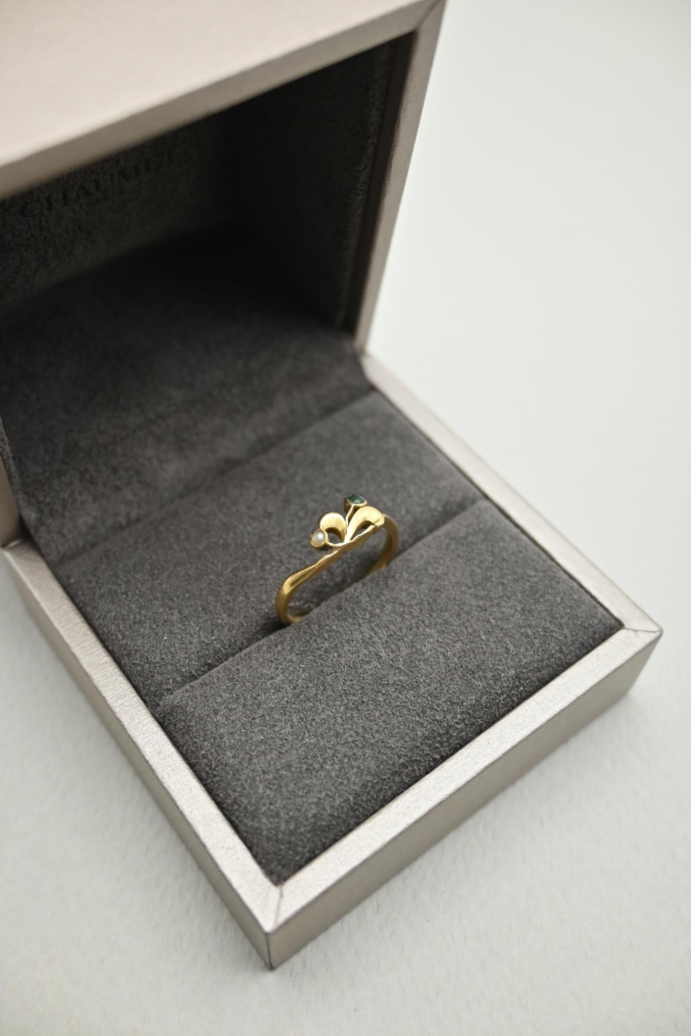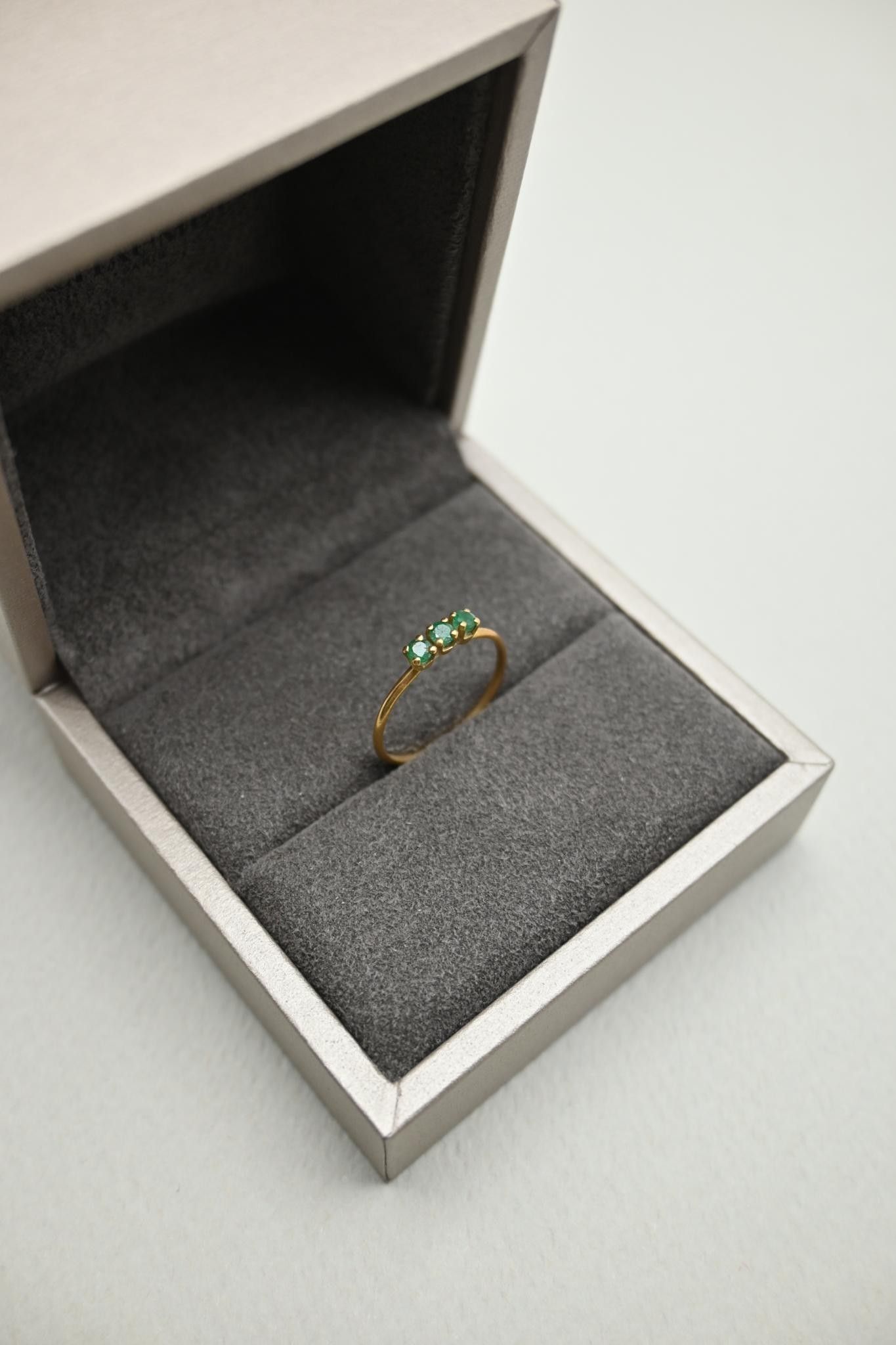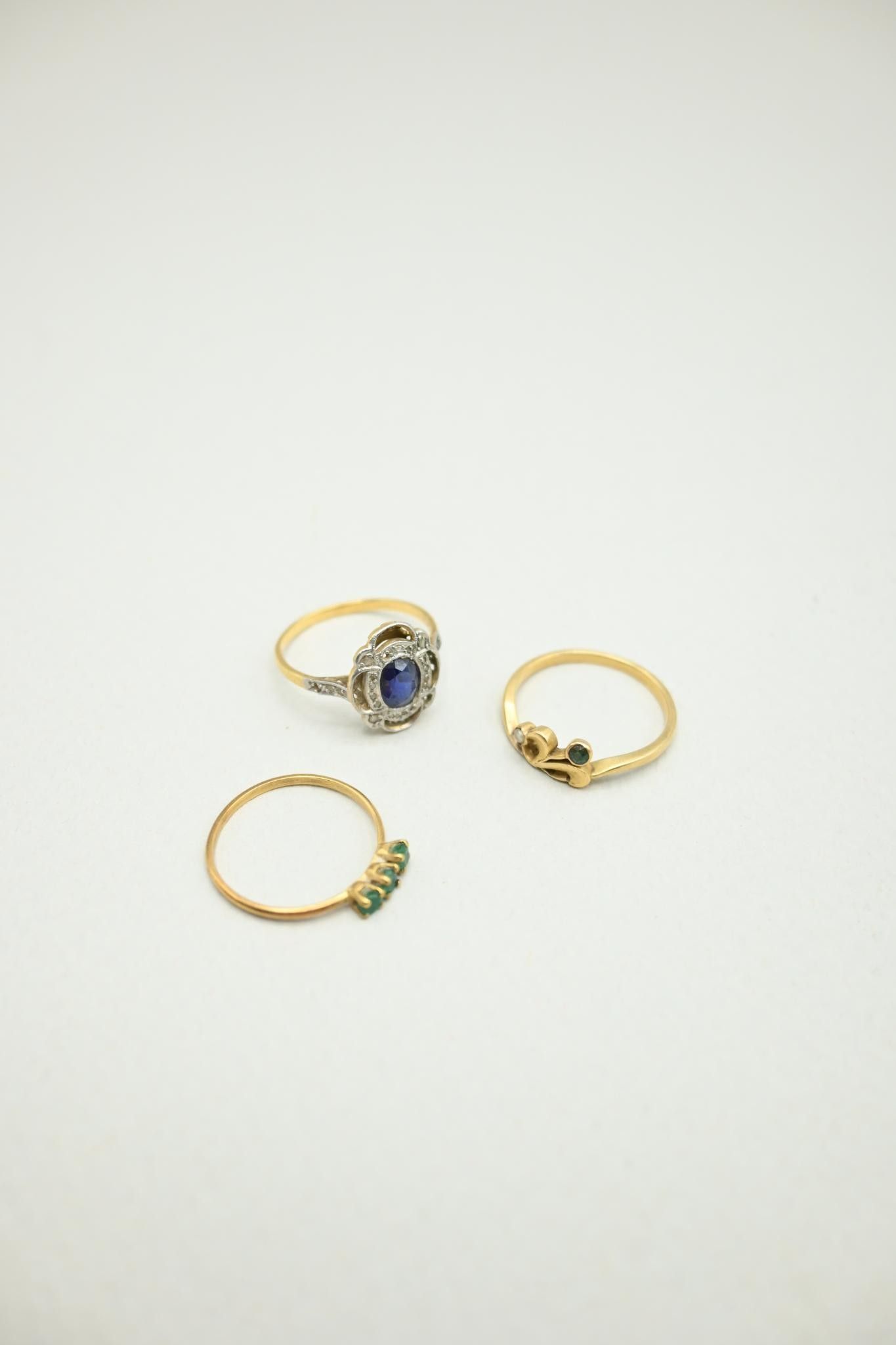 Trois bagues anciennes en or 18K 750 millièmes, l'une avec des émeraudes (tour de doigt : 53), l'une a motif floral avec perle et émeraude (tour de doigt : 54), la dernière centrée d'un saphir synthétique avec éclats de diamants (manque, tour de doigt : 54)