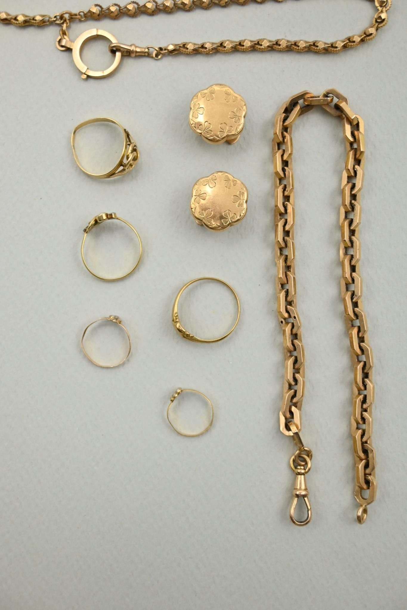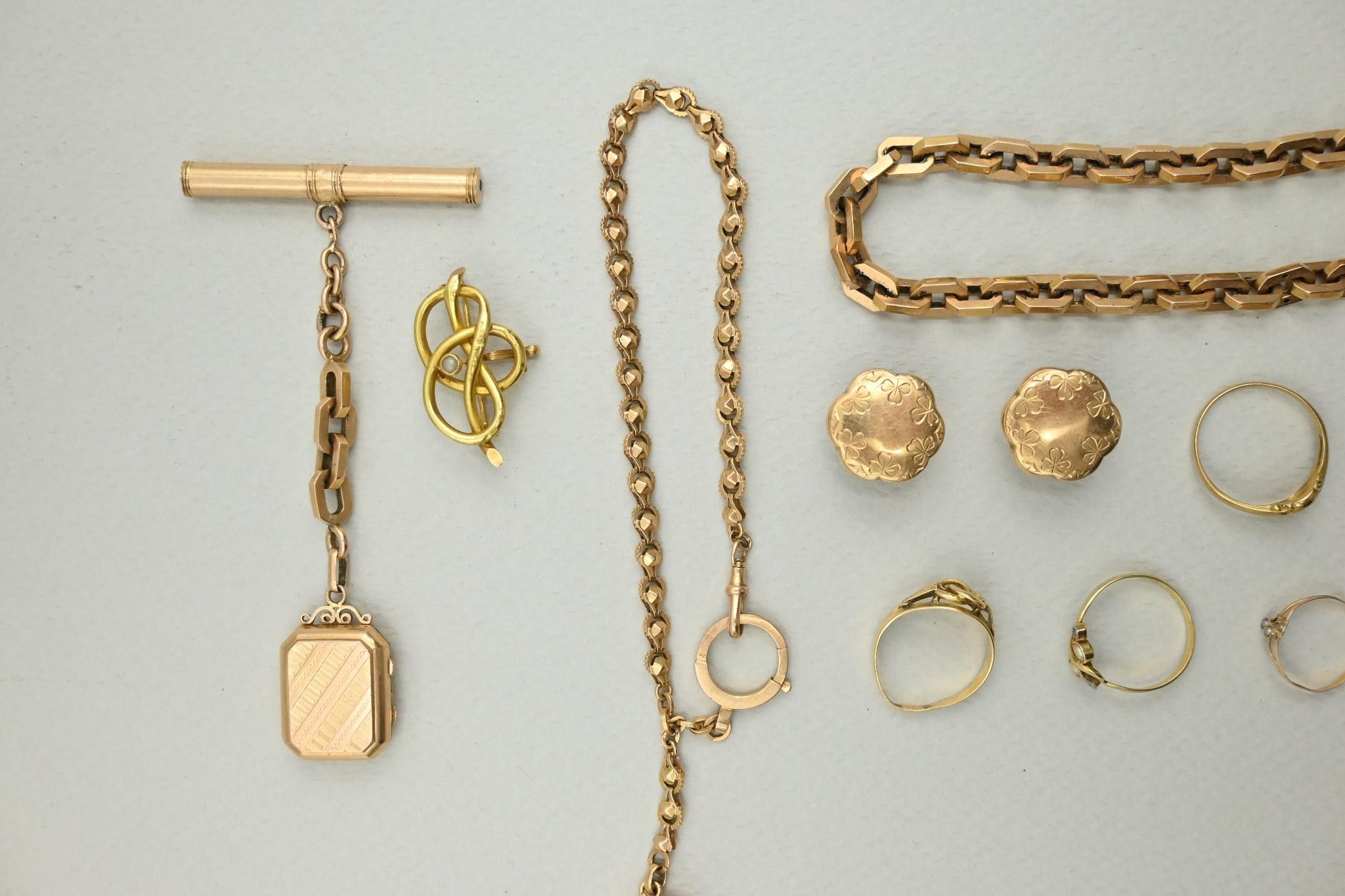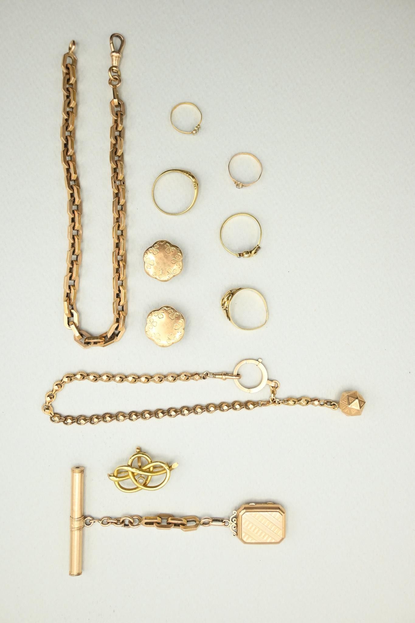Lot de bijoux en or 18K 750 millièmes comprenant : deux chaînes giletières, cinq bagues, une broche, deux boutons de manchette et un élément de chaîne avec clef (or fourré) et médaillon (verre) Poids brut : 53,6 g