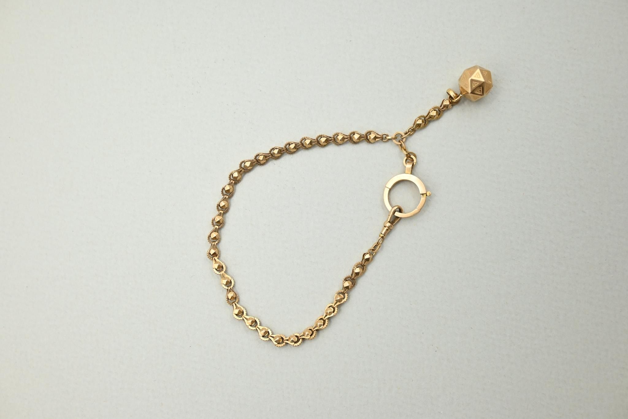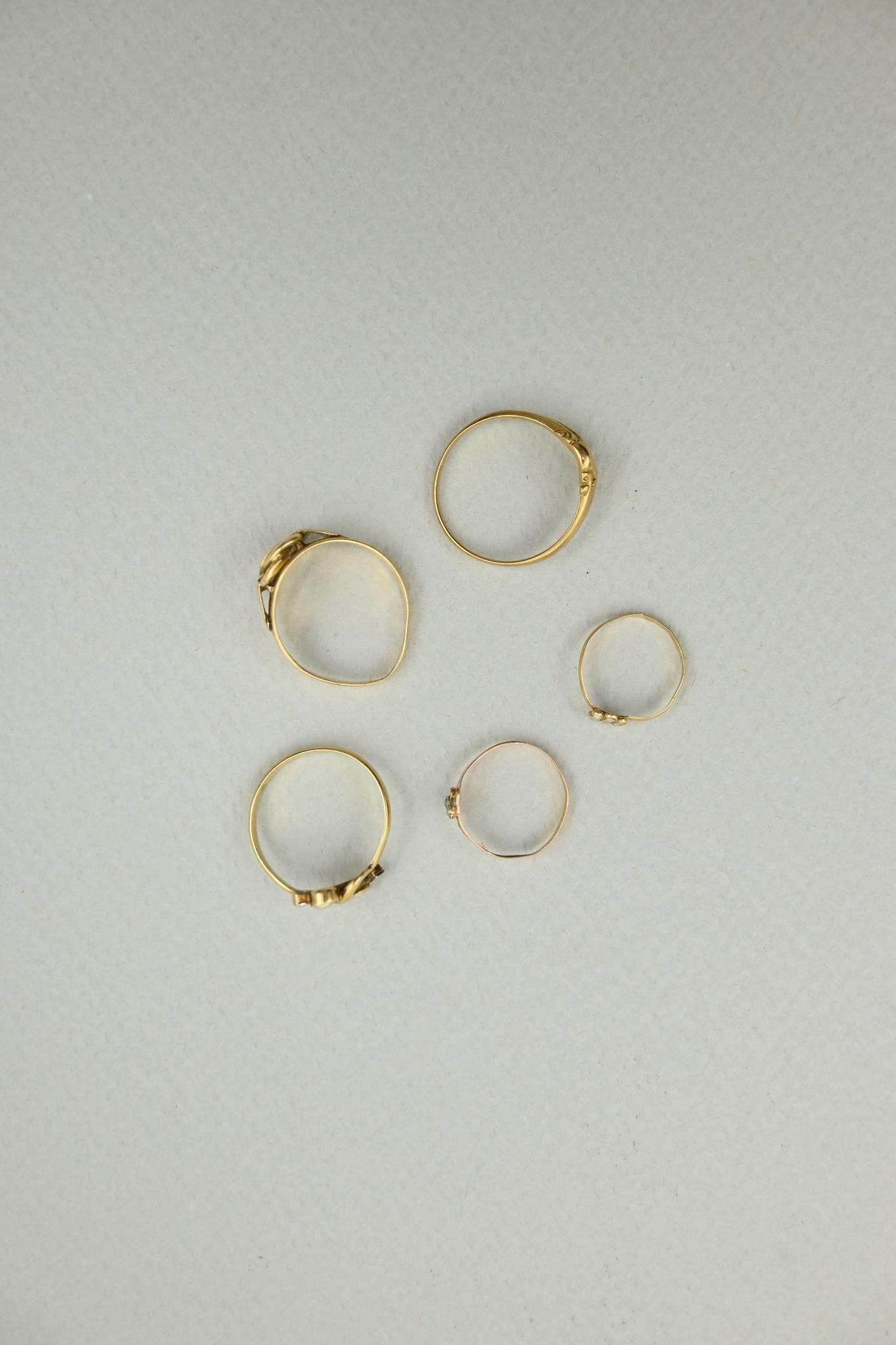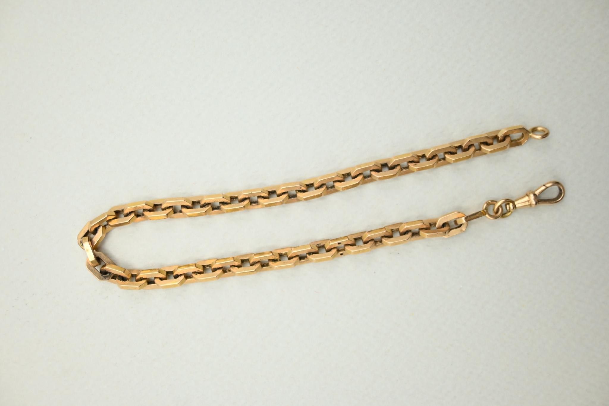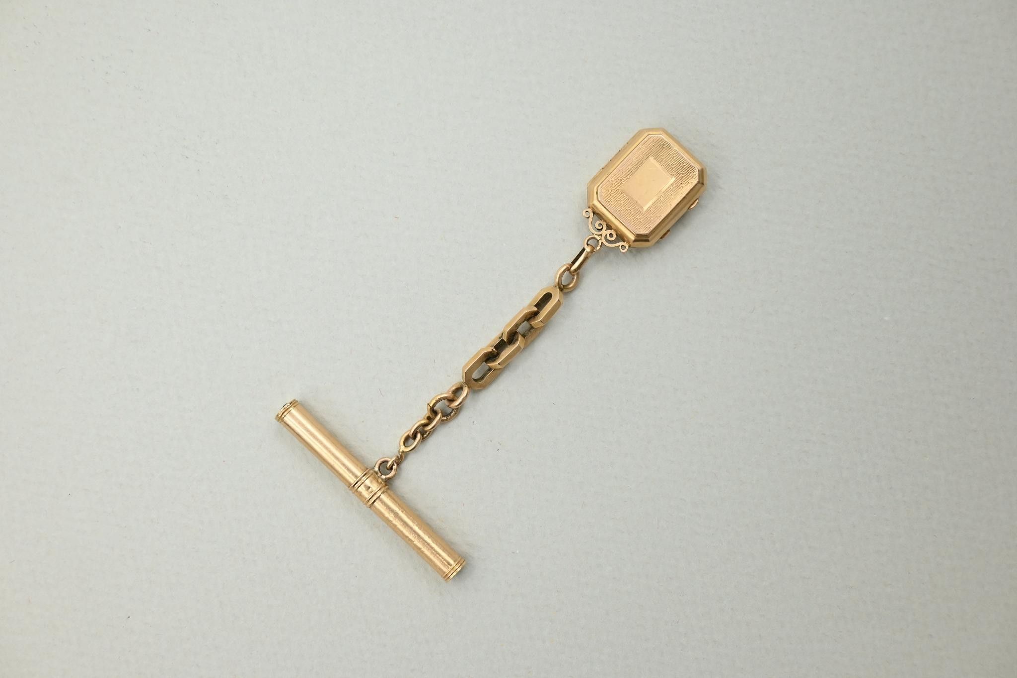 Lot de bijoux en or 18K 750 millièmes comprenant : deux chaînes giletières, cinq bagues, une broche, deux boutons de manchette et un élément de chaîne avec clef (or fourré) et médaillon (verre) Poids brut : 53,6 g