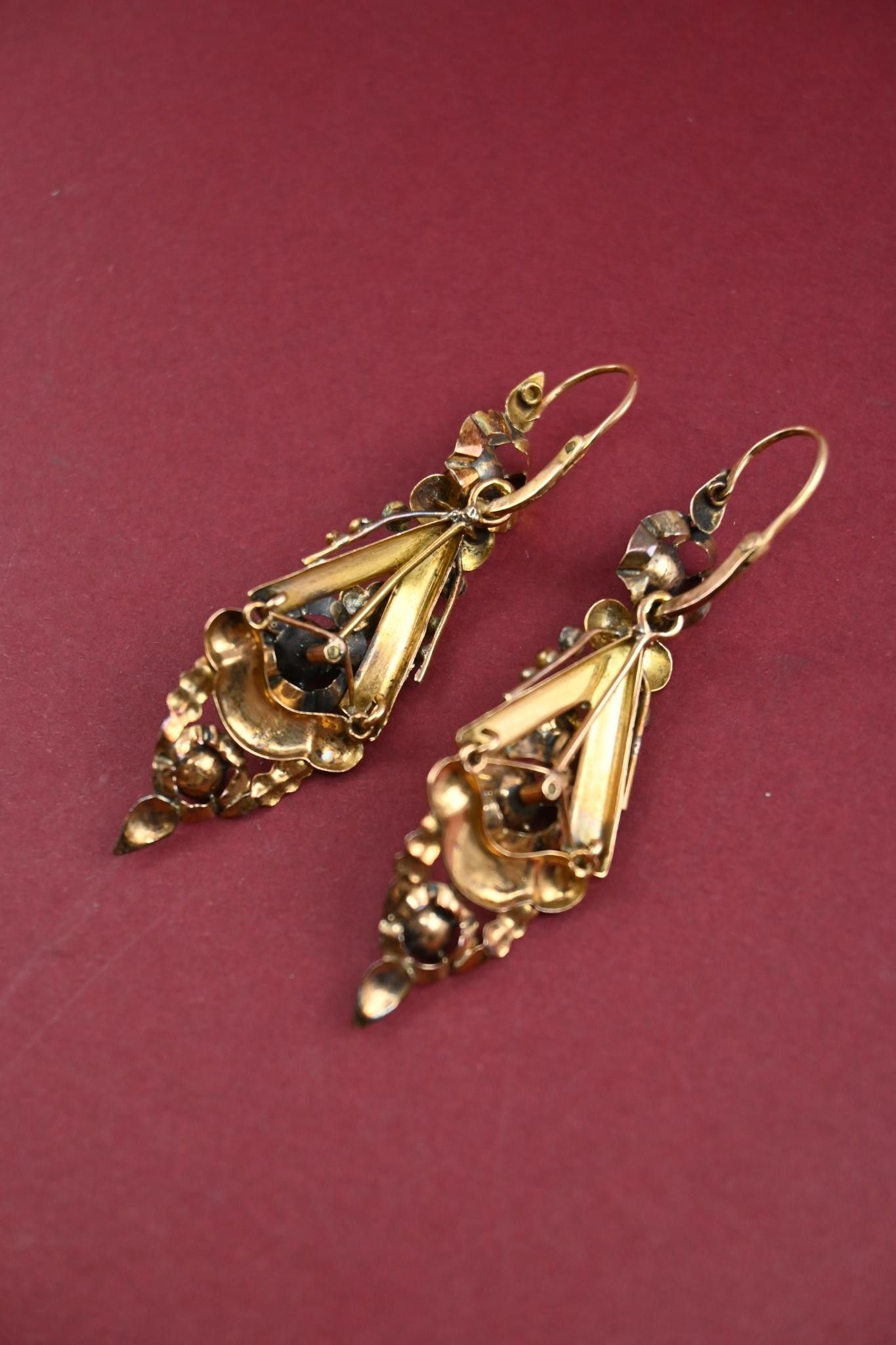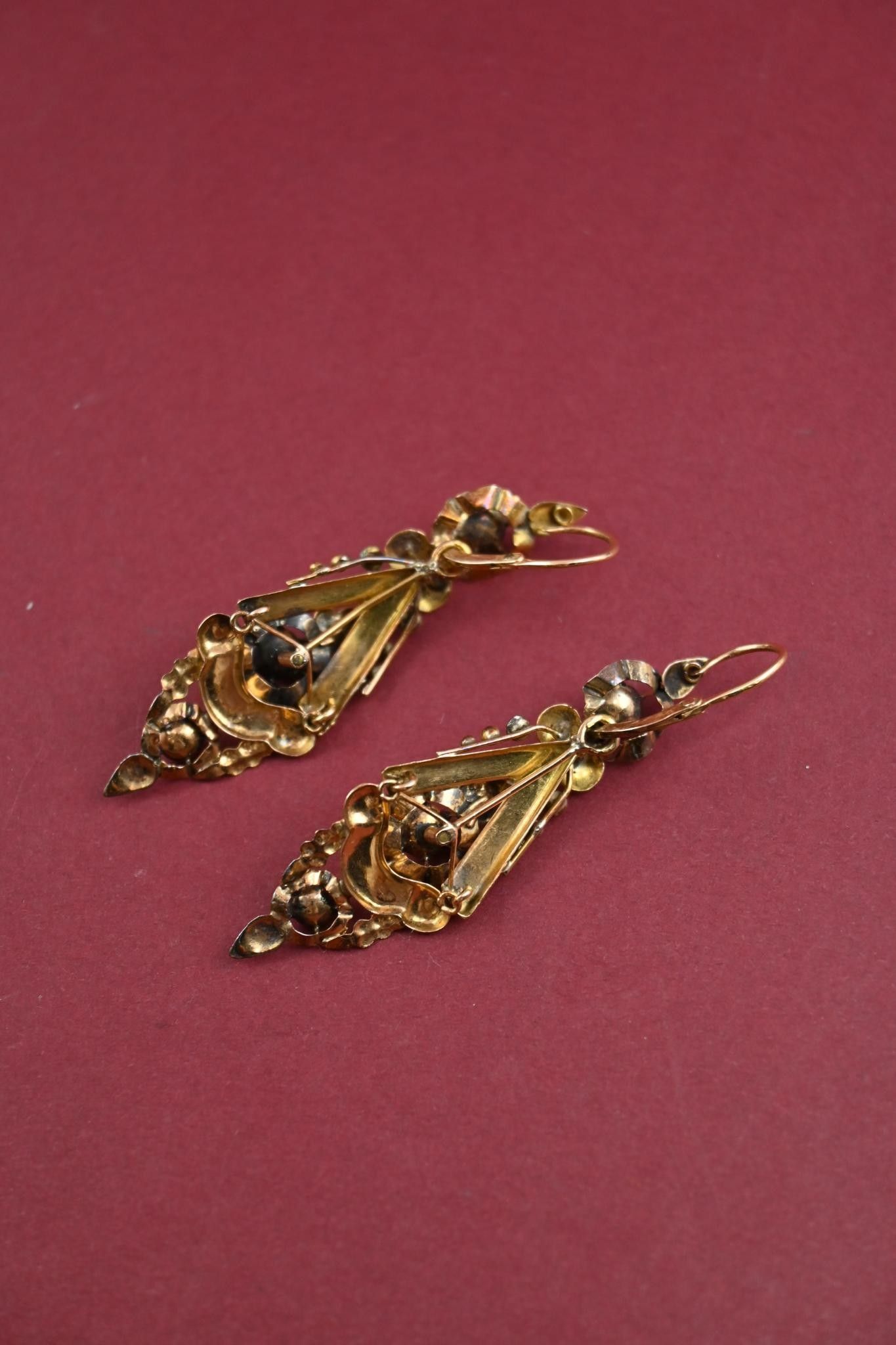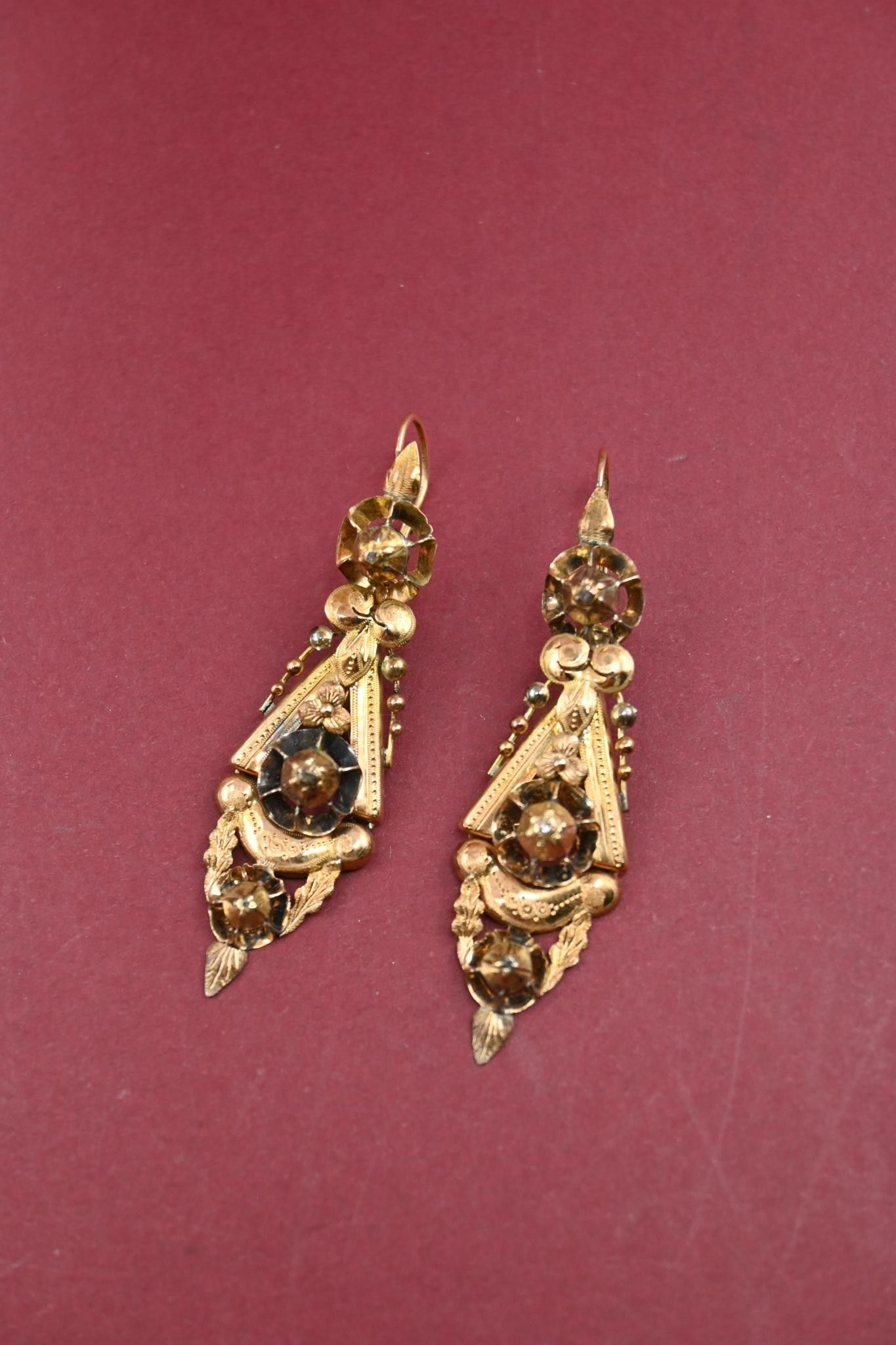 Paire de pendants d'oreilles en or 18K 750 millièmes et éclats de diamants. Traces de soudure. Peuvent être séparées.