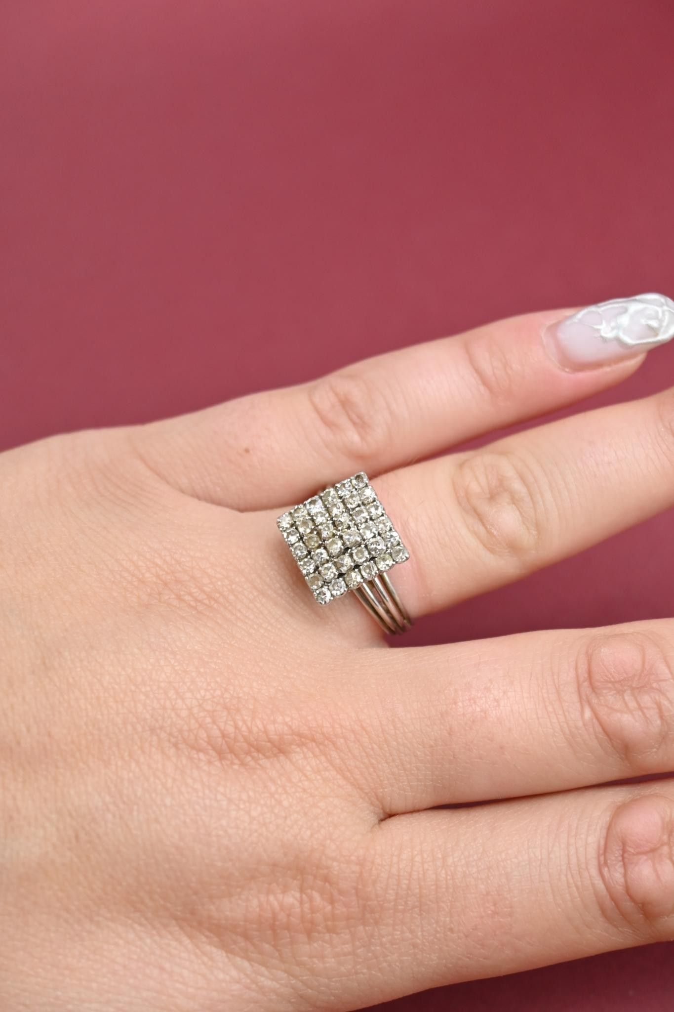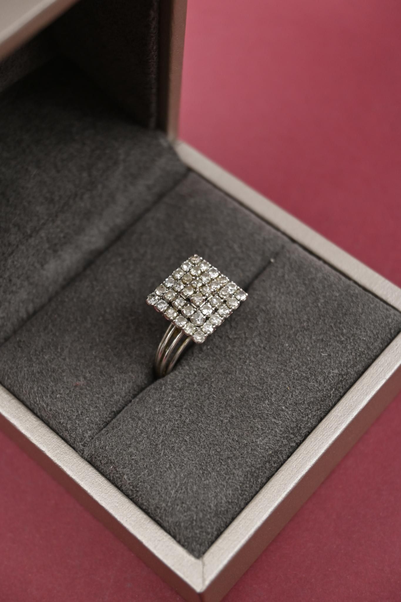 Bague en or gris 18K 750 millièmes à plateau carré pavé de diamants taille 8/8. Monture en escalier.