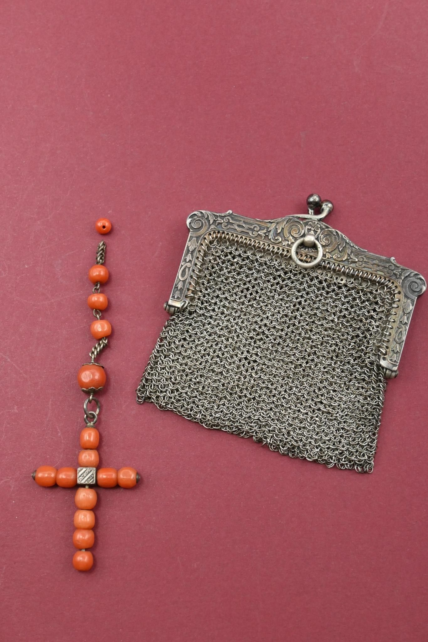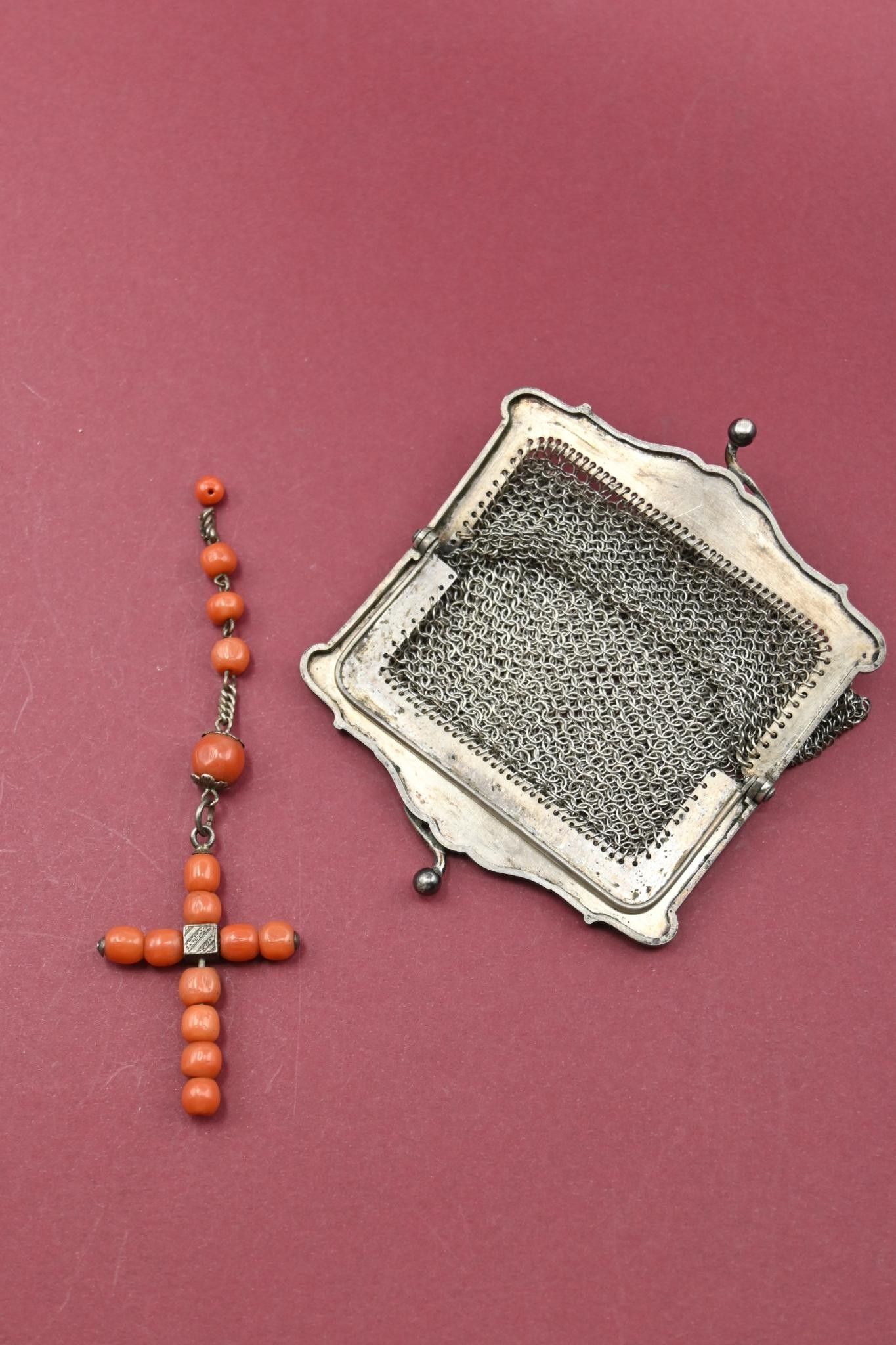 Lot de bijoux anciens en argent comprenant une bourse et un pendentif croix avec morceau (perles de corail).