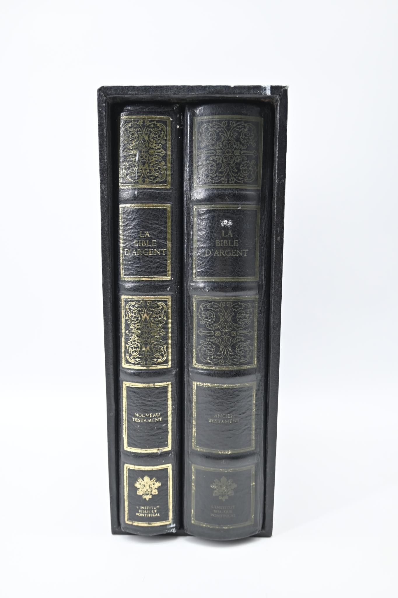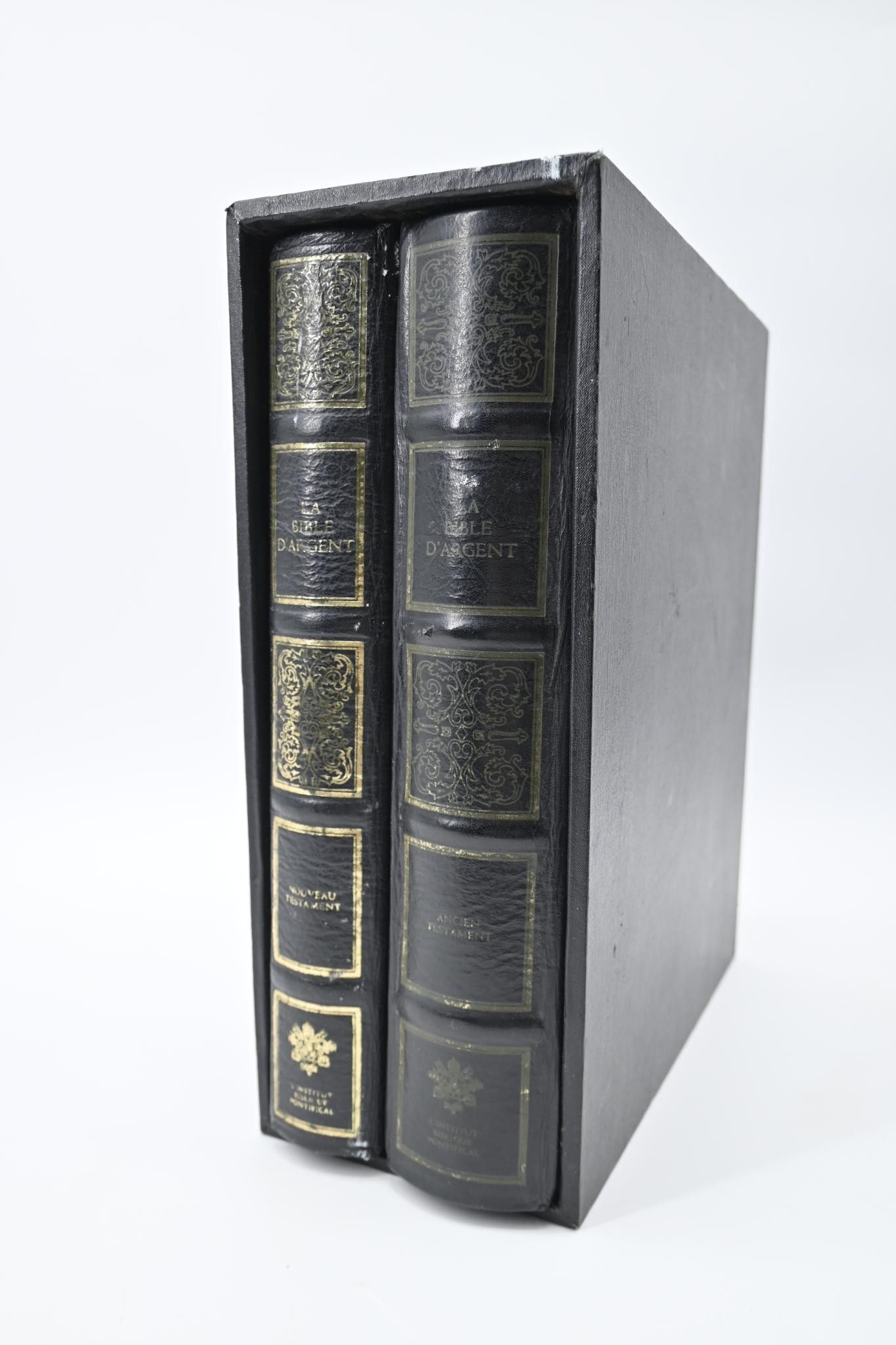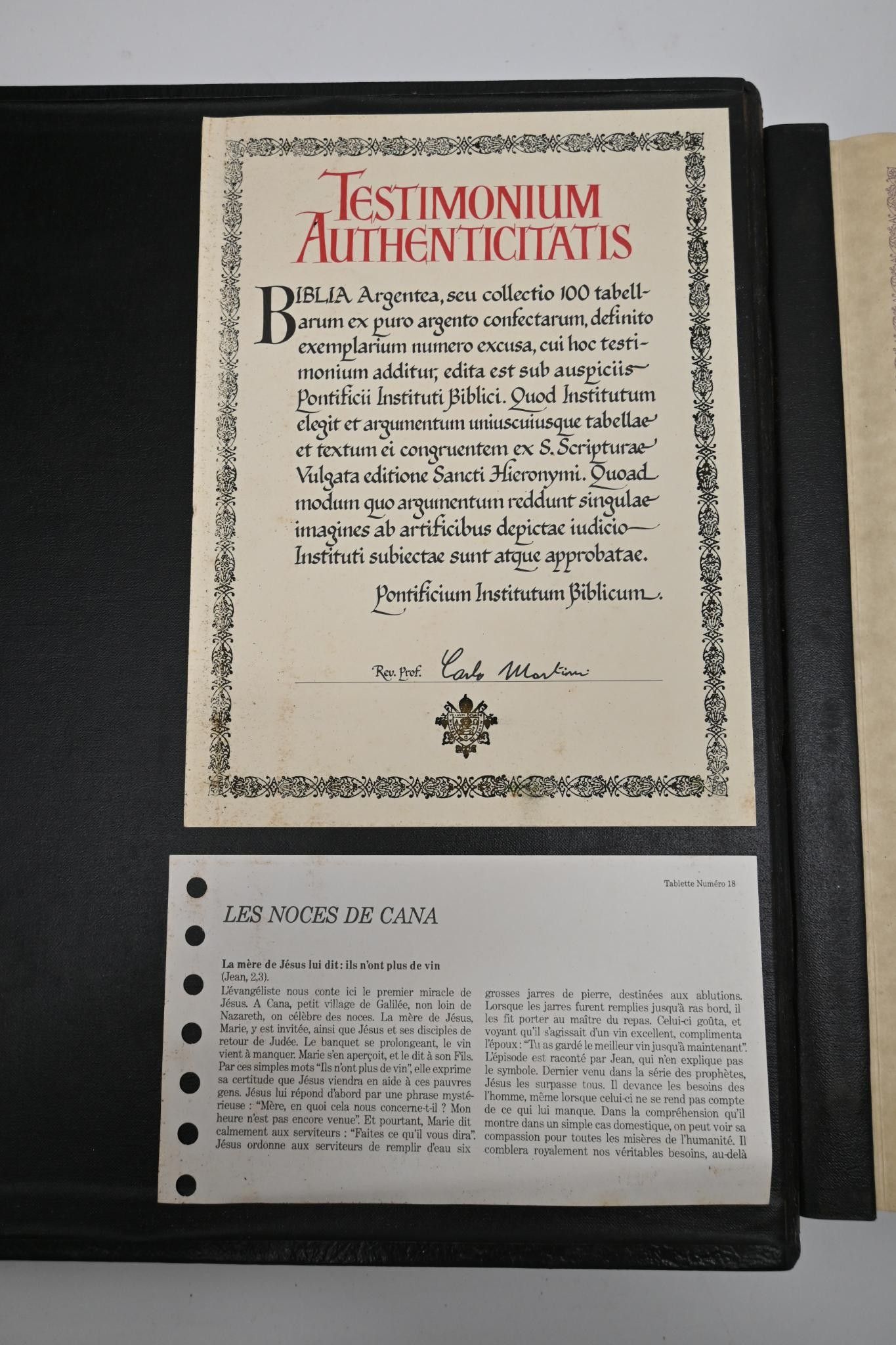 La Bible en argent - Sous le patronage de l'institut biblique pontifical, l'Ancien et le Nouveau Testaments illustrés par 100 lingotins en argent (999/1000) accompagnés de textes, chaque lingotin pesant plus de 25 g, dans deux albums reliure cuir doré aux petits fers, sous emboîtage, très bon état