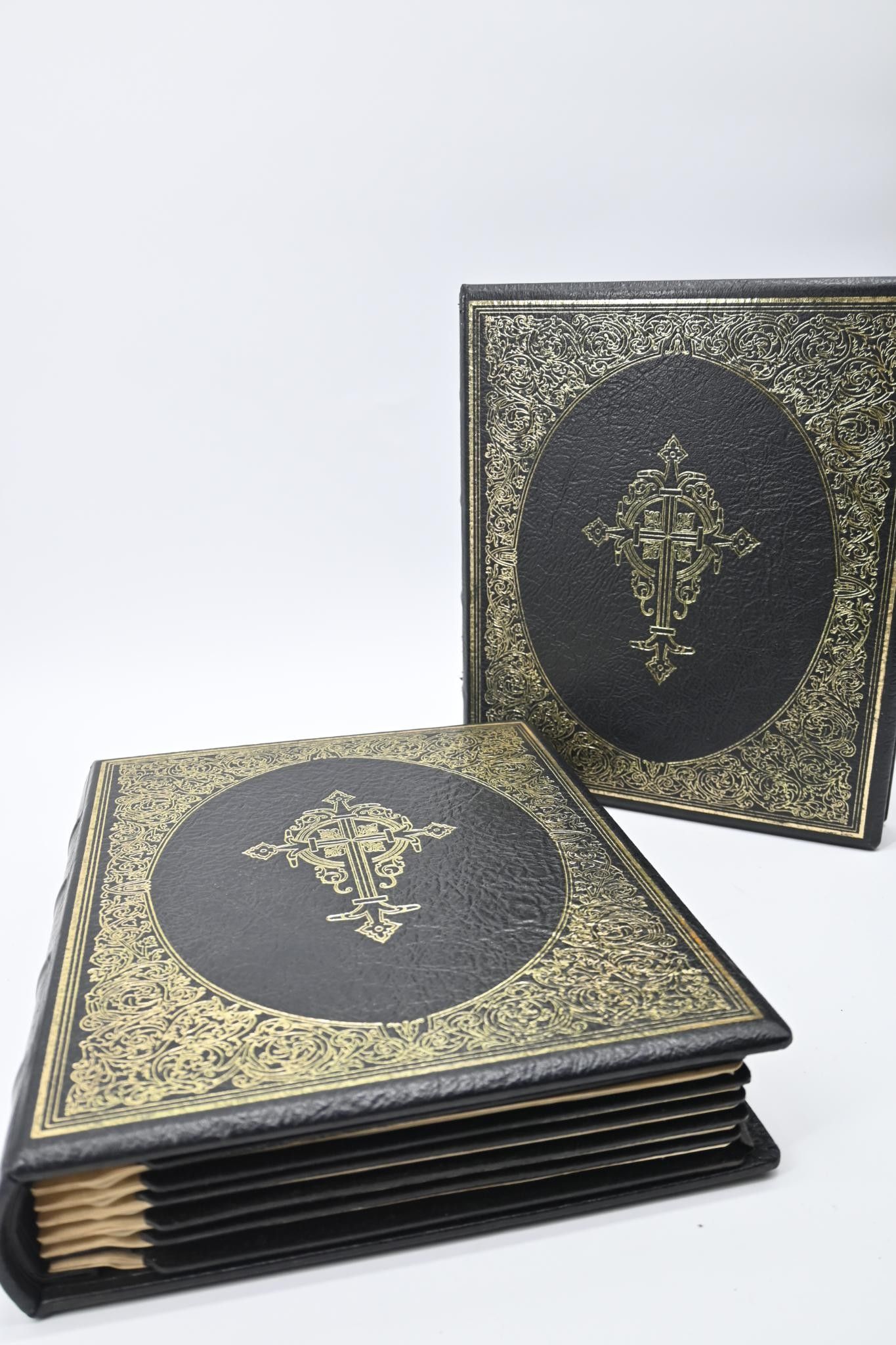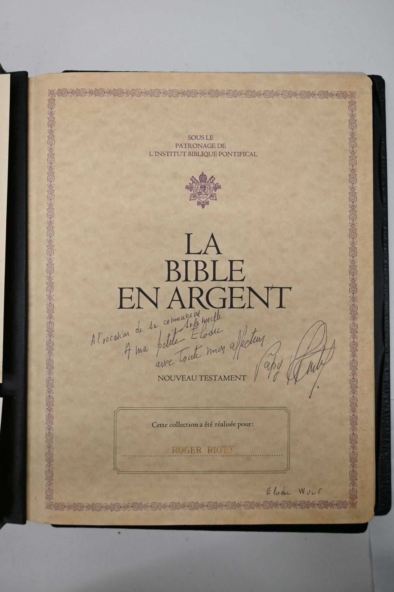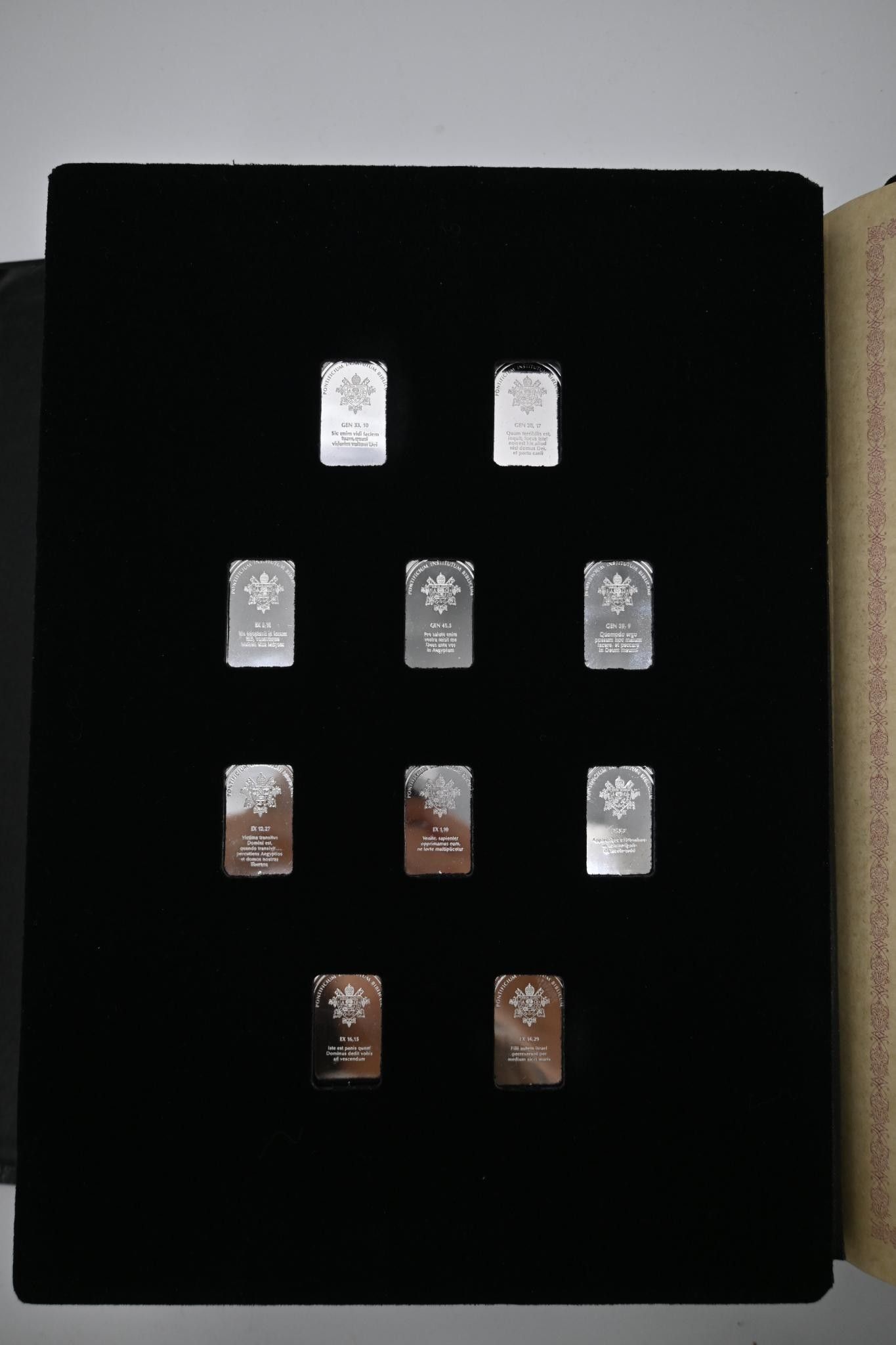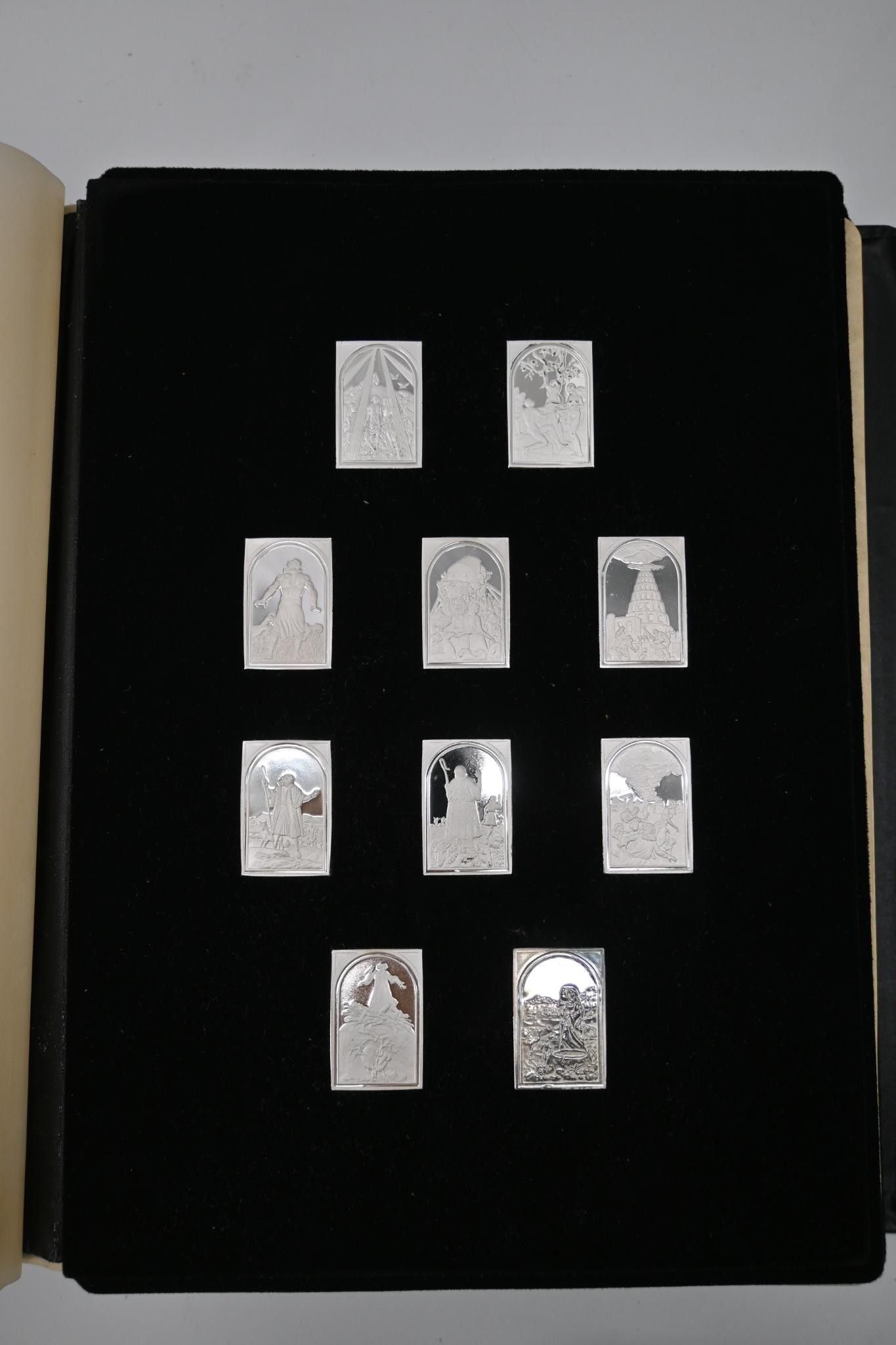 La Bible en argent - Sous le patronage de l'institut biblique pontifical, l'Ancien et le Nouveau Testaments illustrés par 100 lingotins en argent (999/1000) accompagnés de textes, chaque lingotin pesant plus de 25 g, dans deux albums reliure cuir doré aux petits fers, sous emboîtage, très bon état