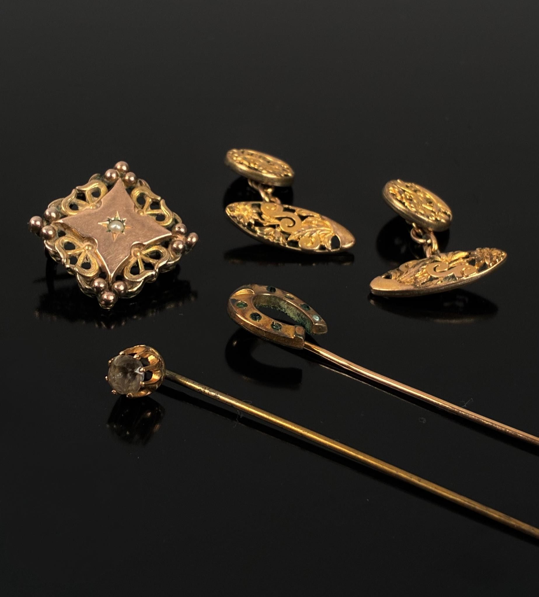 Deux épingles de cravatte l'une en or doublé abec un fer à cheval orné de pierres vertes, l'autre avec une pierre blanche