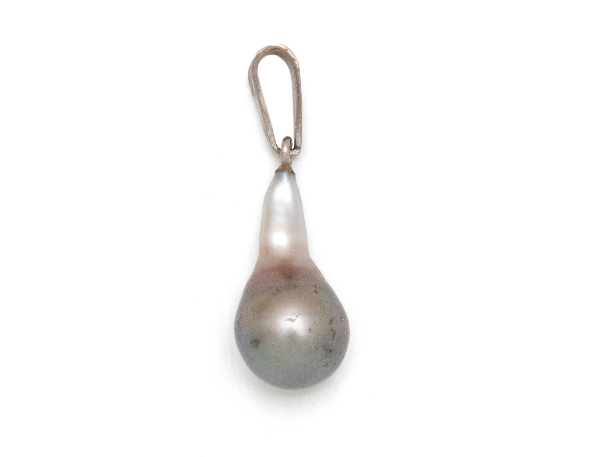 Pendentif en or gris 750 millièmes retenant une goutte de perle de Tahiti.