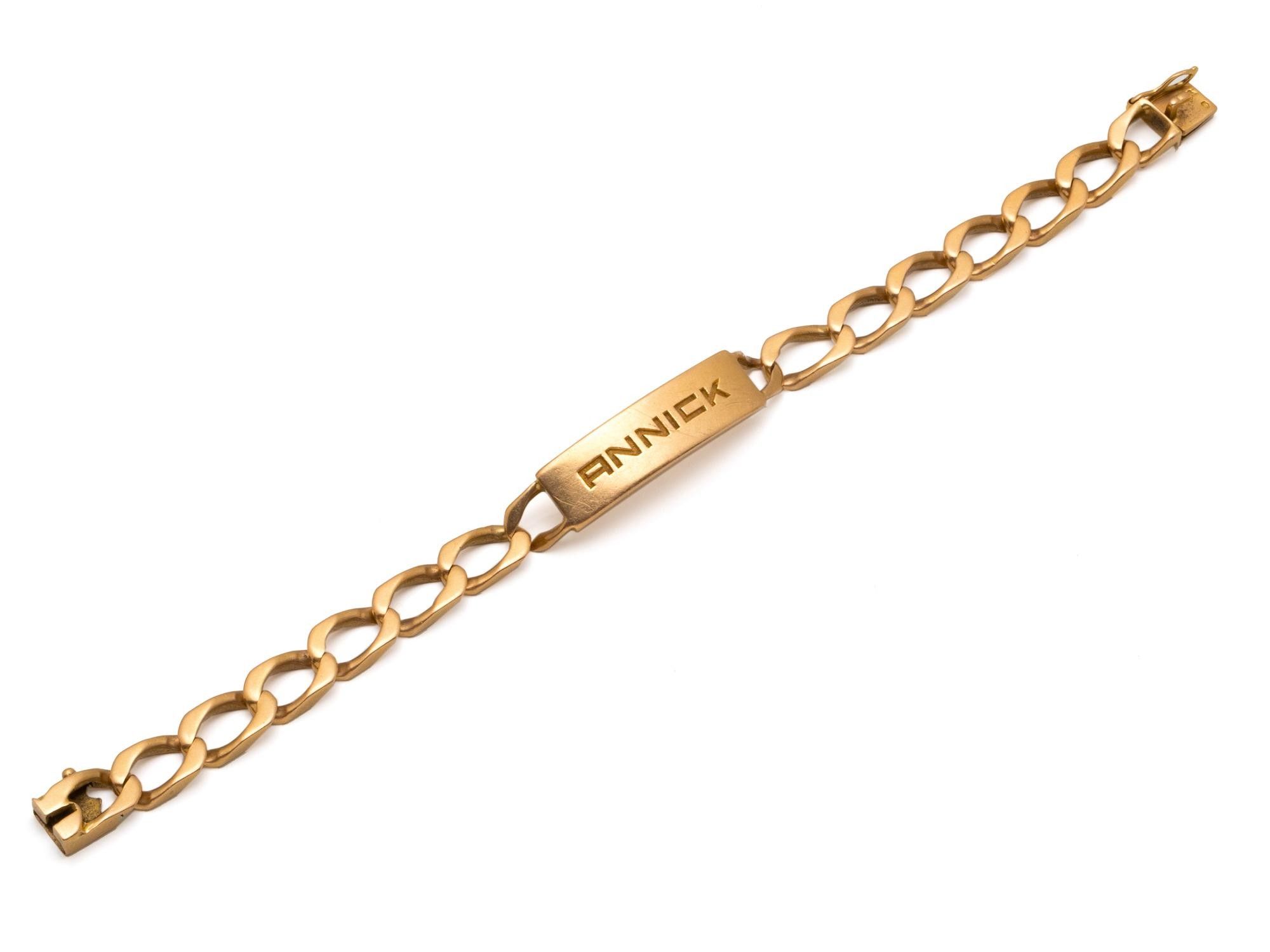 Bracelet articulé en or 750 millièmes, maille gourmette, décoré d'une plaque d'identité gravée ANNICK datée 3.9.40.