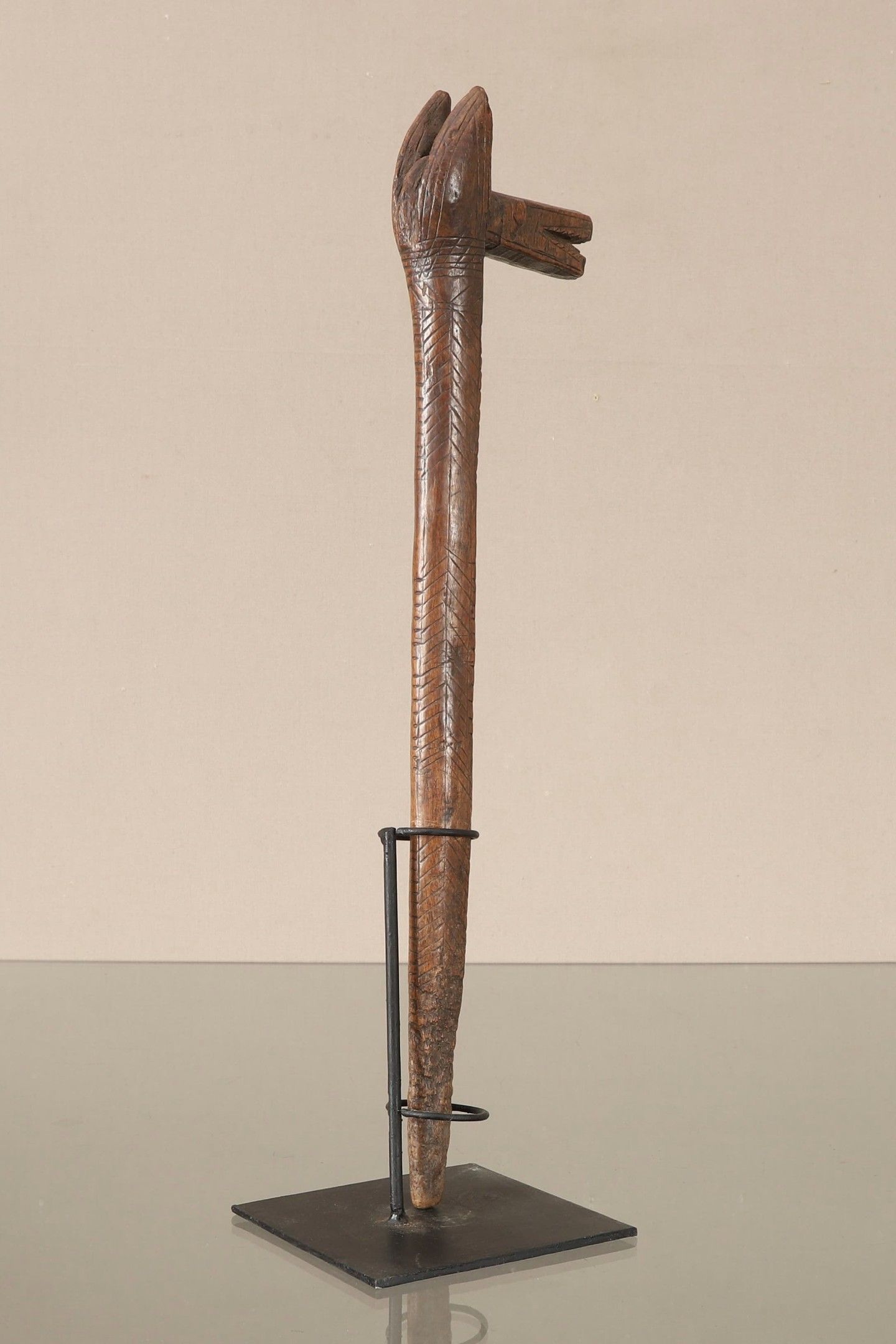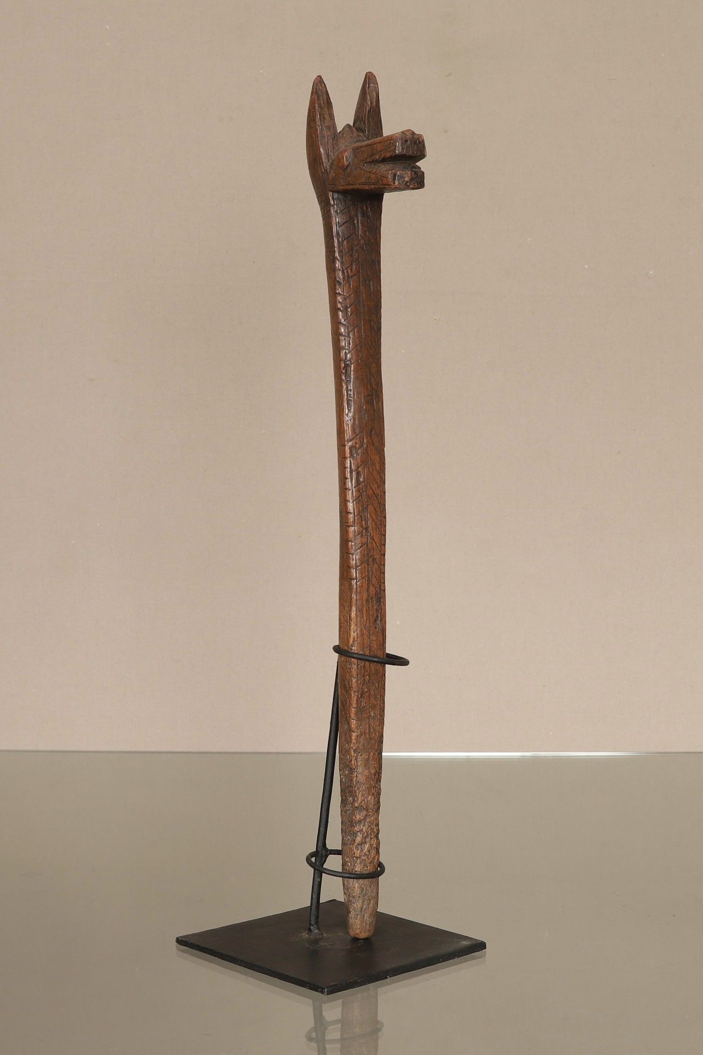 Afrique de l’Ouest Casse-tête hyène En bois dur sculpté et incisé, belle patine avec beau grip H. 59 cm L. 4 cm P. 12 cm Provenance : > Collection de M. B, ingénieur, entrepreneur et chevalier de la Légion d'honneur actif en Afrique subsaharienne depuis plus de 40 ans