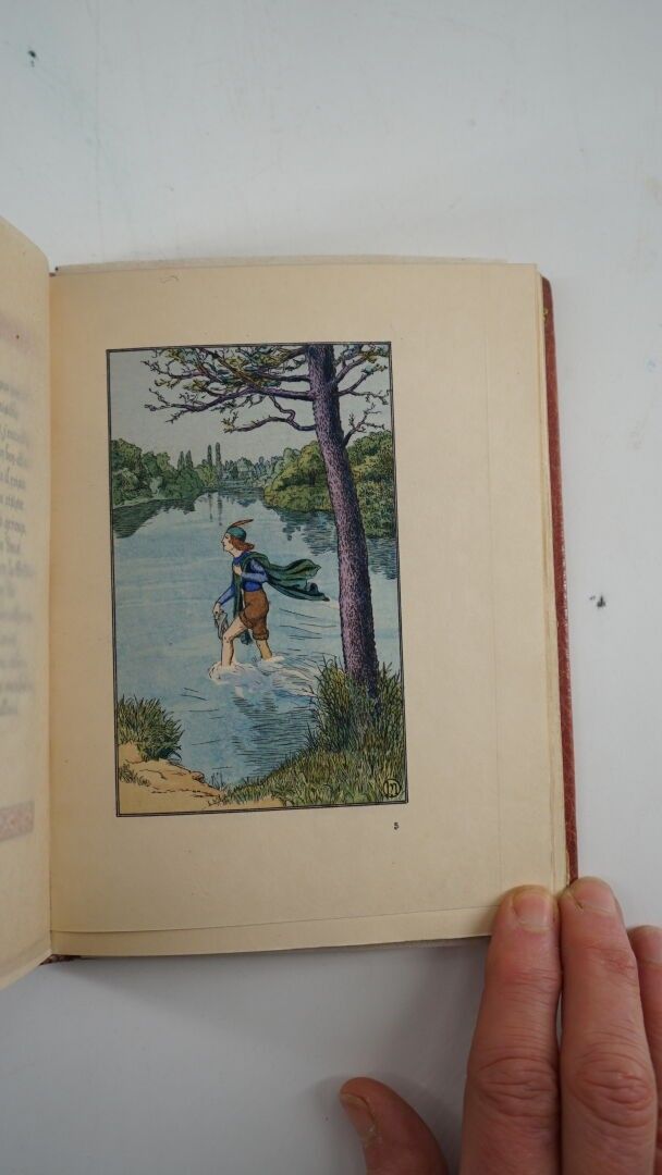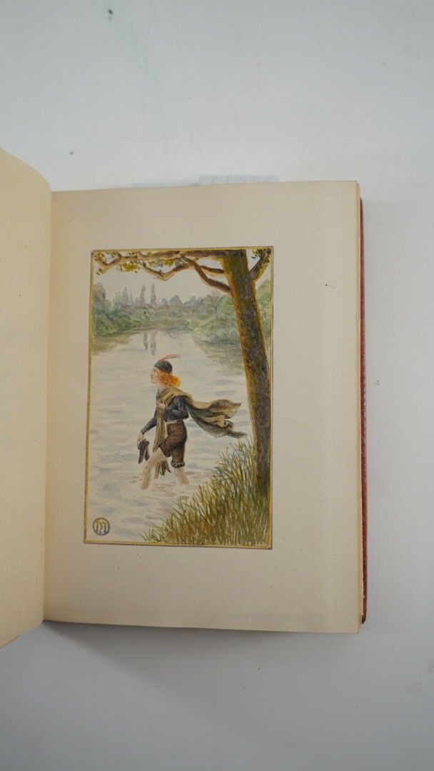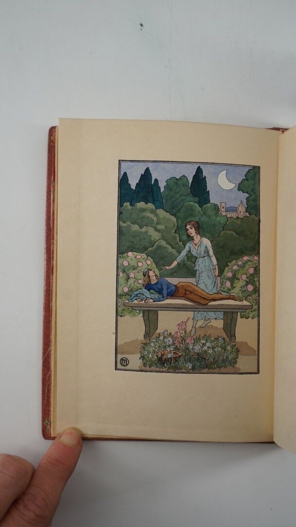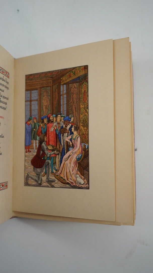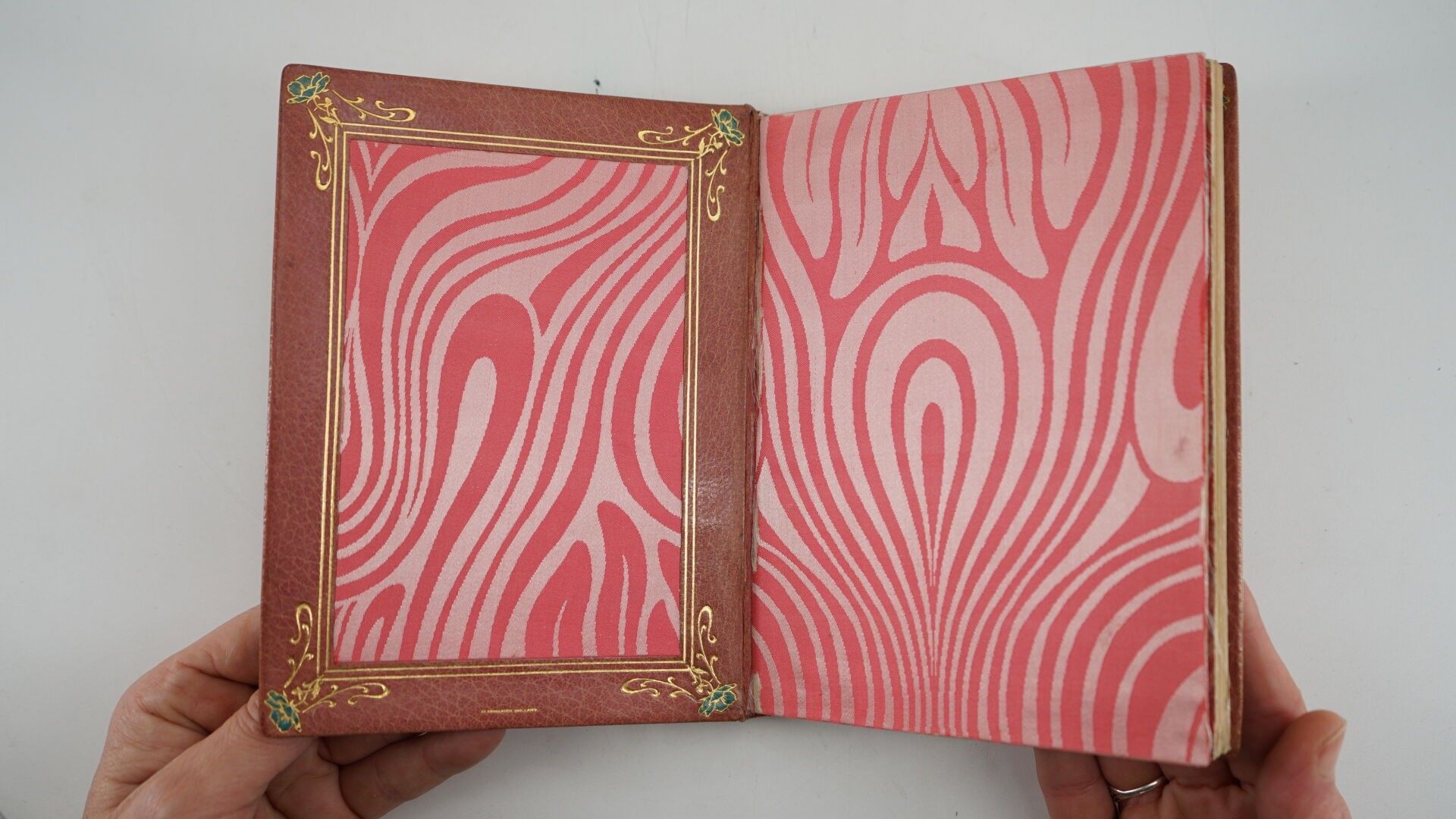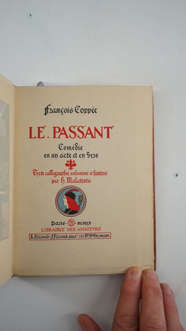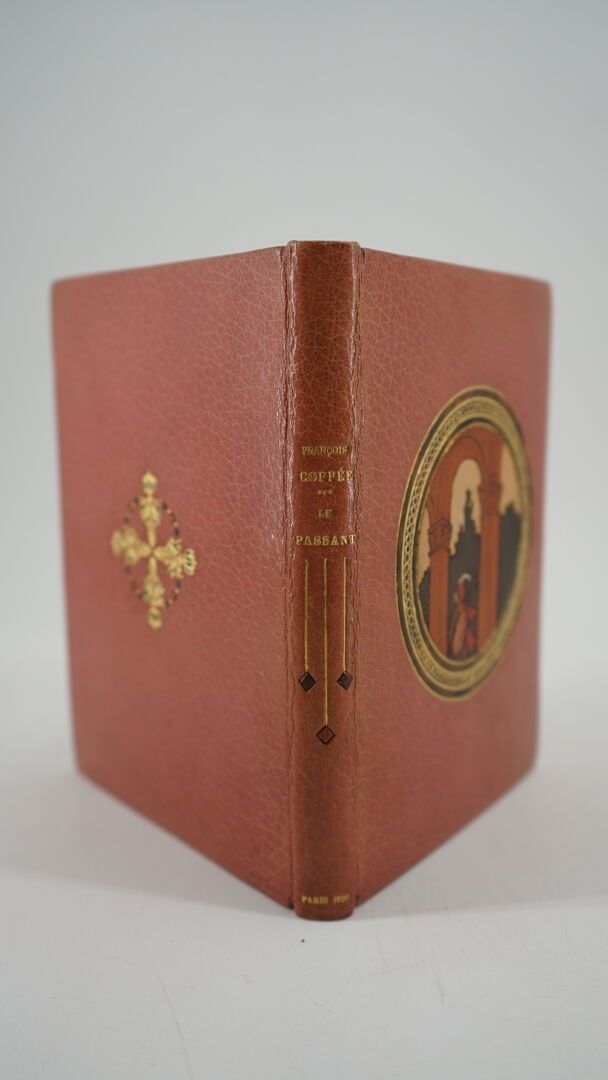 COPPÉE (François) - Le passant. Comédie en un acte et en vers - Paris ; Librairie des Amateurs A. Ferroud, F. Ferroud, successeur, 1920 - 1 volume In-12° - Texte calligraphié, enluminé et historié par H. Malatesta - Belles compositions en couleurs in et hors texte dont 4 à pleine page - Très belle reliure maroquin rose signée Flammarion Vaillant - 1er plat richement mosaïqué de maroquin roux, beige, havane, et brun figurant 1 musicien adossé à 1 arcade sur fond de végétation, le tout dans 1 médaillon de cuir havane marbré et doré au 1er plat, 2nd plat orné d'1 motif géométrique cruciforme doré entouré d'1 alternance de points dorés et de ronds mosaïqués de maroquin orange et vert - Pointillés aux coupes - Couvertures illustrées couleurs et dos conservés - Contre plats joliment encadrés d'1 double filet avec fleurons angulaires se terminant par des fleurs mosaïquée de maroquin vert, contre plats et gardes doublés de soie au motif rose pâle et rose vif - Dos lisse (légèrement titré, localisé et daté or, orné de 3 filets verticaux se terminant par de petits losanges mosaïqués bruns et havane - Tête dorée - Très bel exemplaire numéroté sur Japon (n°19 sur les 30 exemplaires de tête, tirage total : 1500 + 25 sur Hollande), avec et 1 aquarelle originale de Malatesta à pleine page et 3 suites des illustrations : 1 en couleurs, 1 en bleu et 1 en noir, toutes avec remarques.