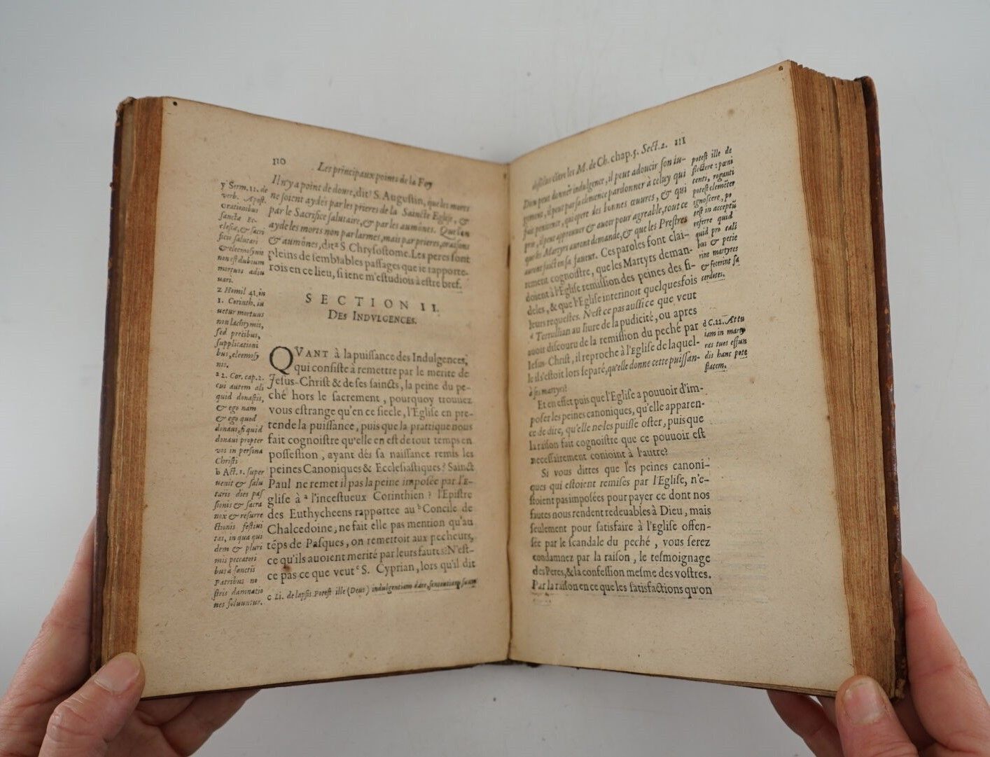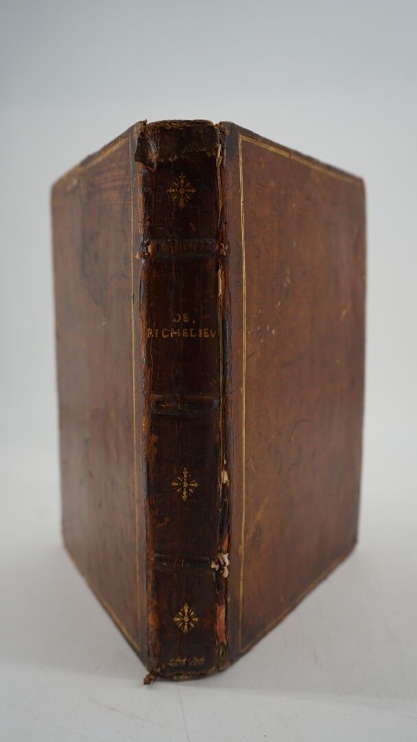 [RELIGIOSA] - RICHELIEU (Armand Jean Duplessis, Evêque de Luçon) - Les principaux poincts de la foy de l'église catholique. Défendus contre l'éscrit addressé au Roy par les quatre Ministres de Charenton - Poitiers ; Antoine Mesnier, 1617 - 1 volume petit In-4° (22,80x 16,50 cm) - [3] feuillets blancs, [6] feuillets, 262 pages avec quelques erreurs de numérotation, [3] feuillets blancs - Trou de ver à tête d'épingle à l'angle supérieur des 67 premiers feuillets, petit manque en marge supérieure du feuillets des pages 169-170, papier jauni - Reliure de l'époque veau havane(1er mors malhabilement restauré fendu, le 2nd restauré, coins usés, quelques frottements et éraflures aux plats) - Double filet d'encadrement aux plats - Dos à nerfs orné de 3 fleurons et titré or (coiffes malhabilement restaurées élimées, papiers des contre plats et gardes refaits au XIXe siècle) - Tranches mouchetées de rouge - Étiquette au 1er contre plat avec la mention : « Cum consummaverit homo, tunc incipiet » - Très rare édition originale de l'1 des premiers écrits du Cardinal de Richelieu après la Harangue prononcée en la salle du Petit-Bourbon le 23 février 1615.