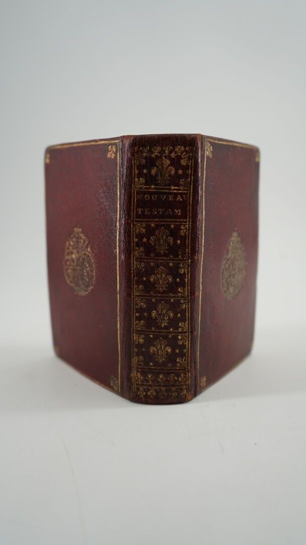 [RELIURE AUX ARMES ROYALES] - AMELOTE - Version du nouveau testament selon la vulgate - Paris ; Veuve Mazières & J. B. Garnier, 1741 - 1 volume In-18° - Reliure de l'époque maroquin bordeaux - Filet d'encadrement, fleurs de lys angulaires et armes centrales d'alliance de de la reine Marie Leszczynska, épouse de Louis XV, au centre des plats - Dos lisse fleurdelisé et titré or - Tranches dorées - Bon exemplaire.
