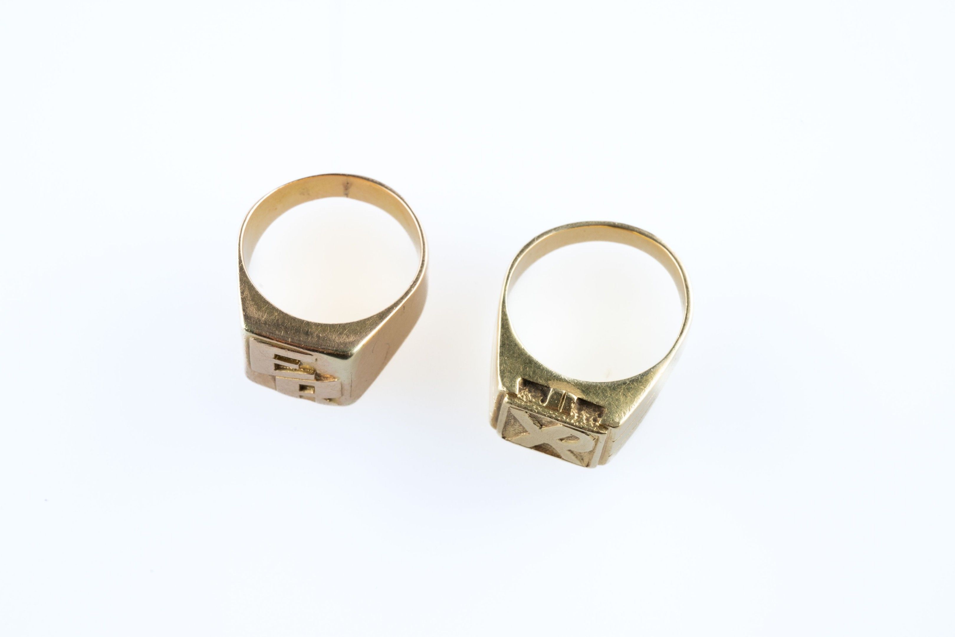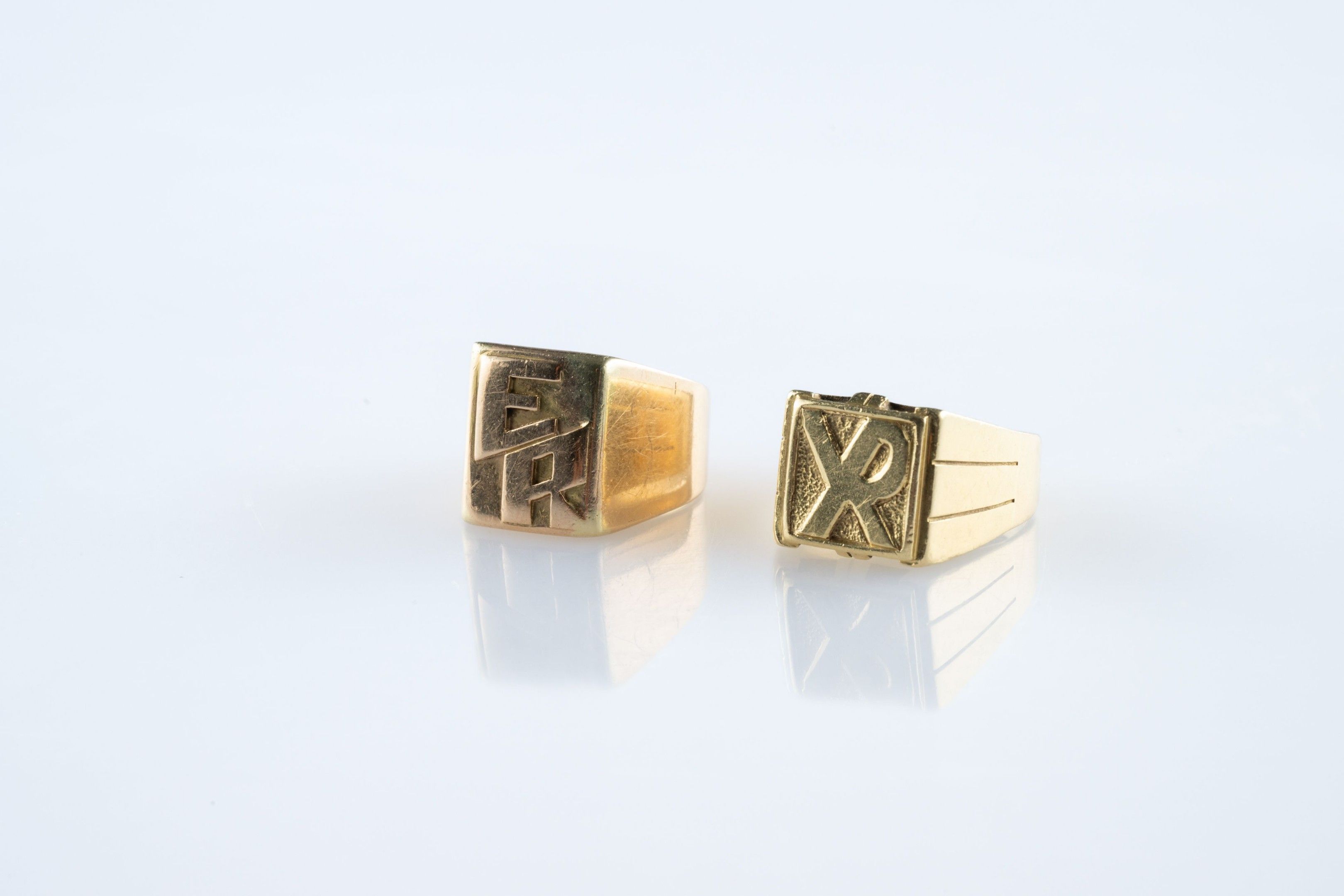 Ensemble de deux chevalières d'homme en or jaune 18k (750 millièmes) à chaton carré monogrammé "ER" et YR".