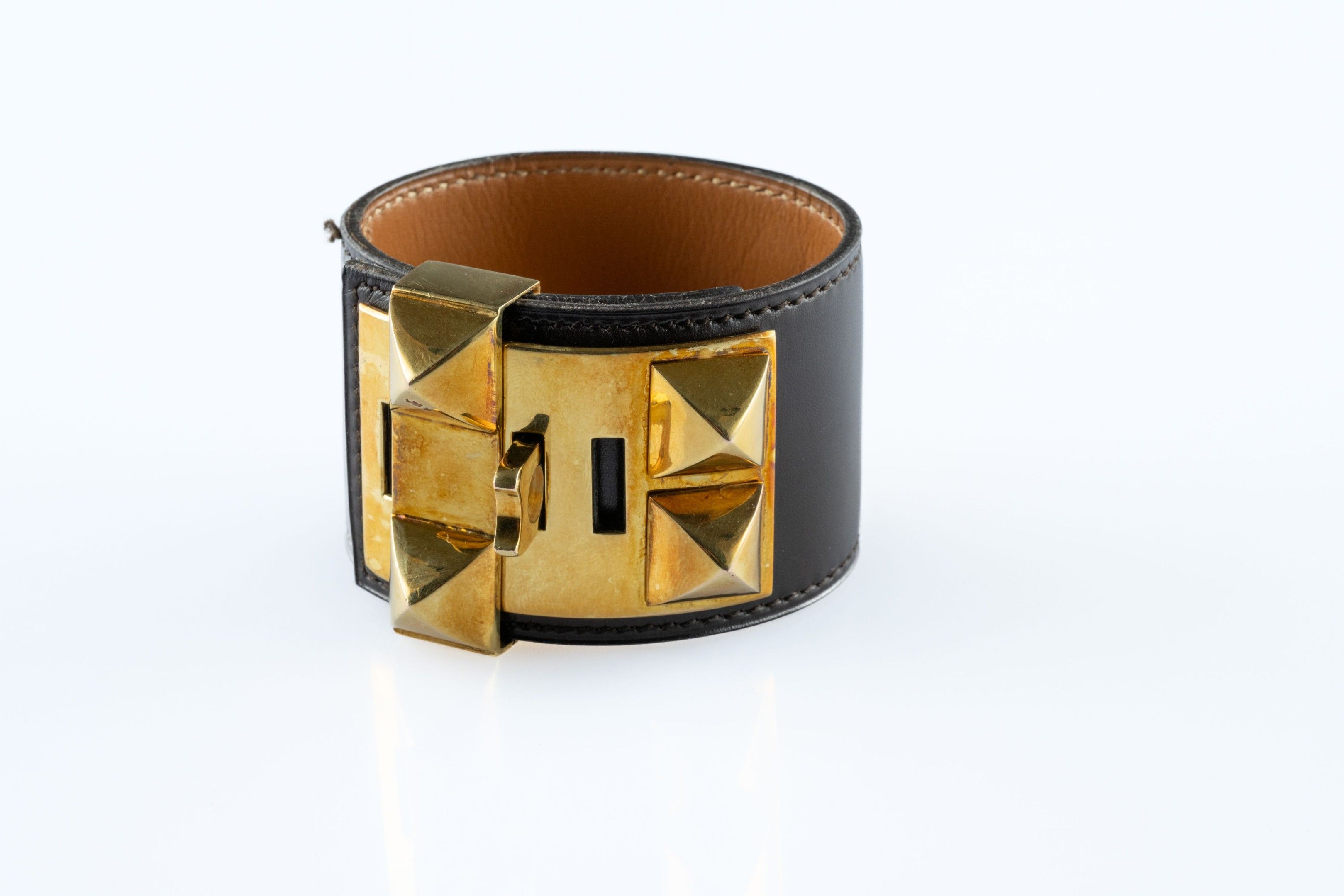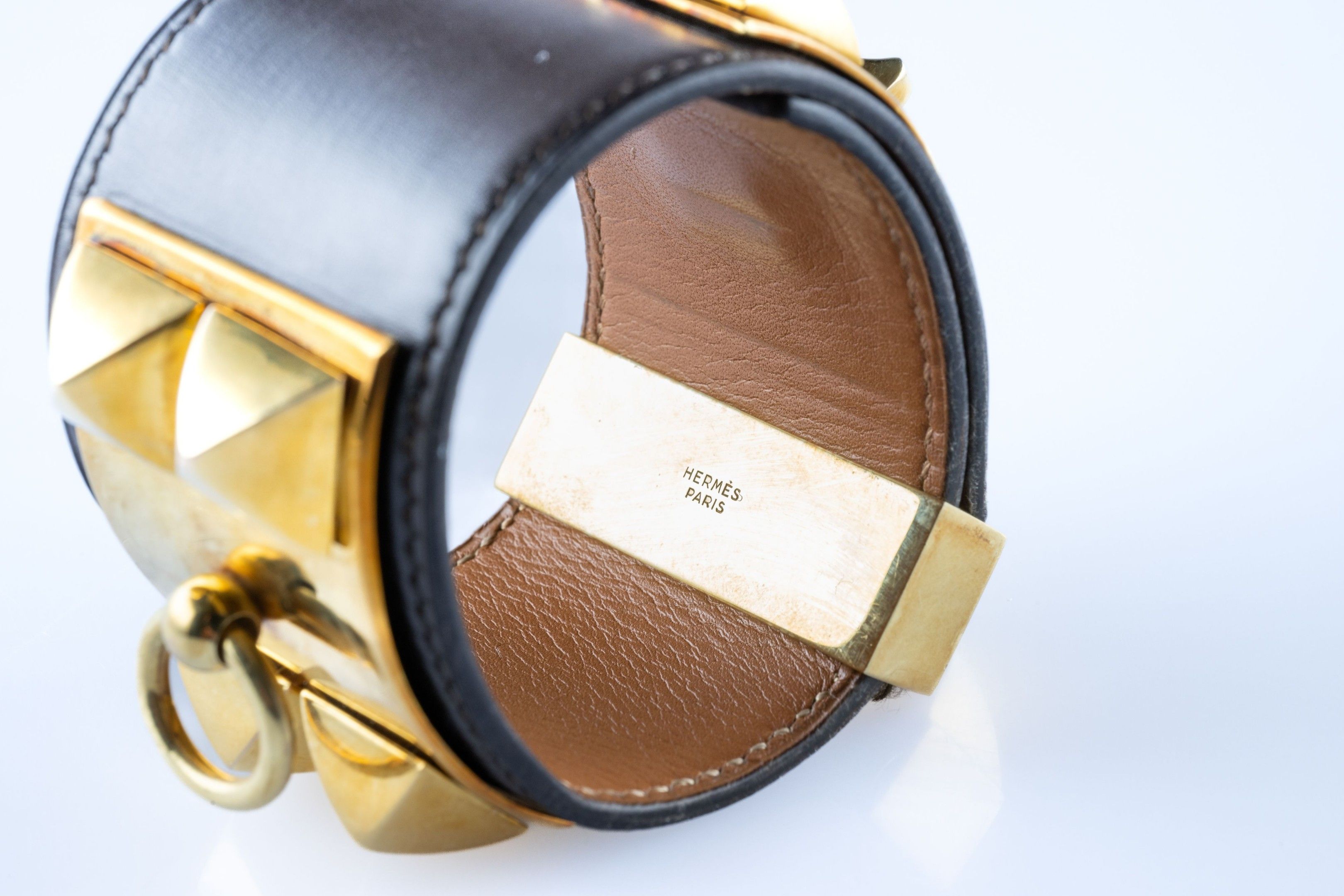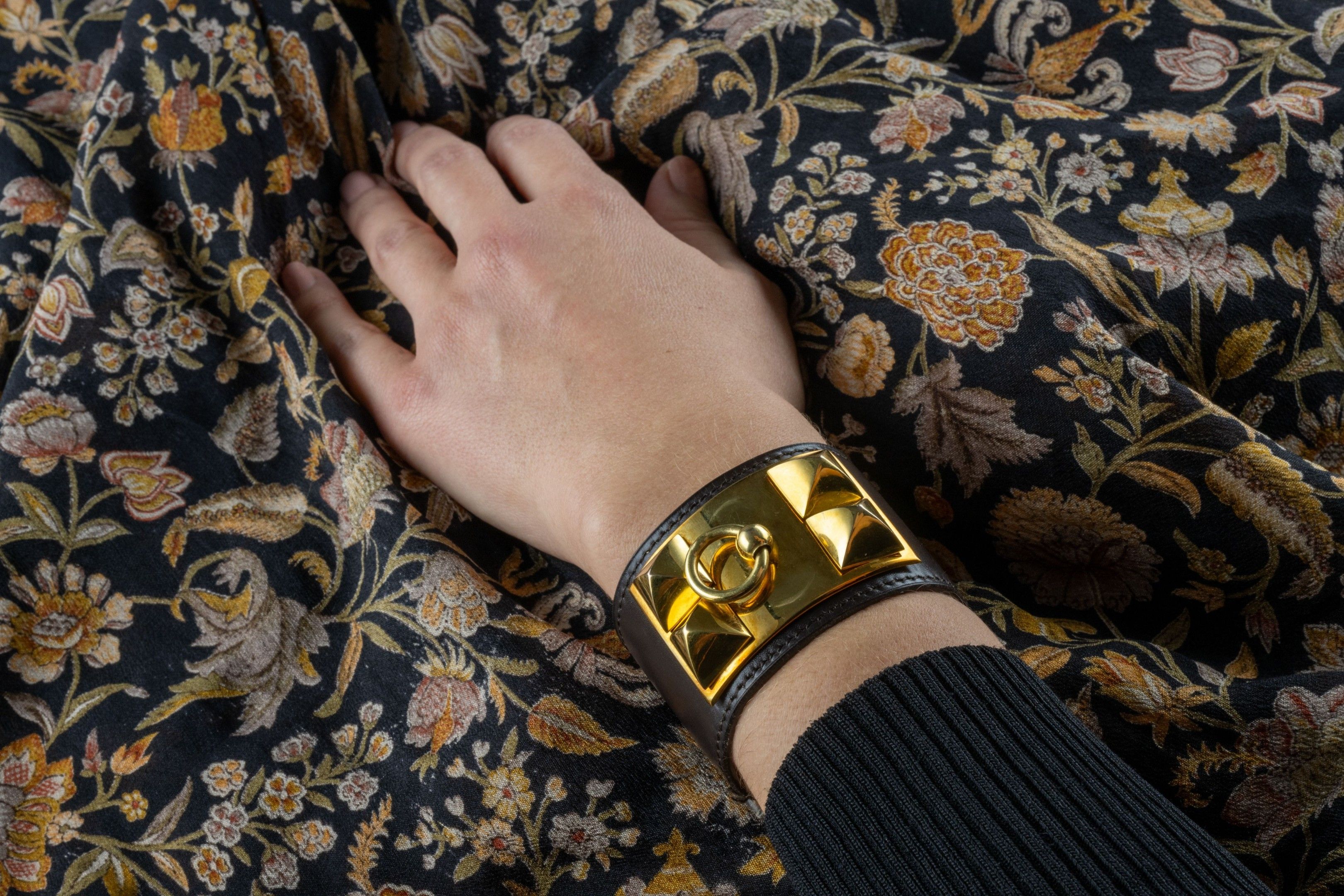 Bracelet modèle "Collier de chien" en veau box brun chocolat et apprêts en métal doré. Signé.
