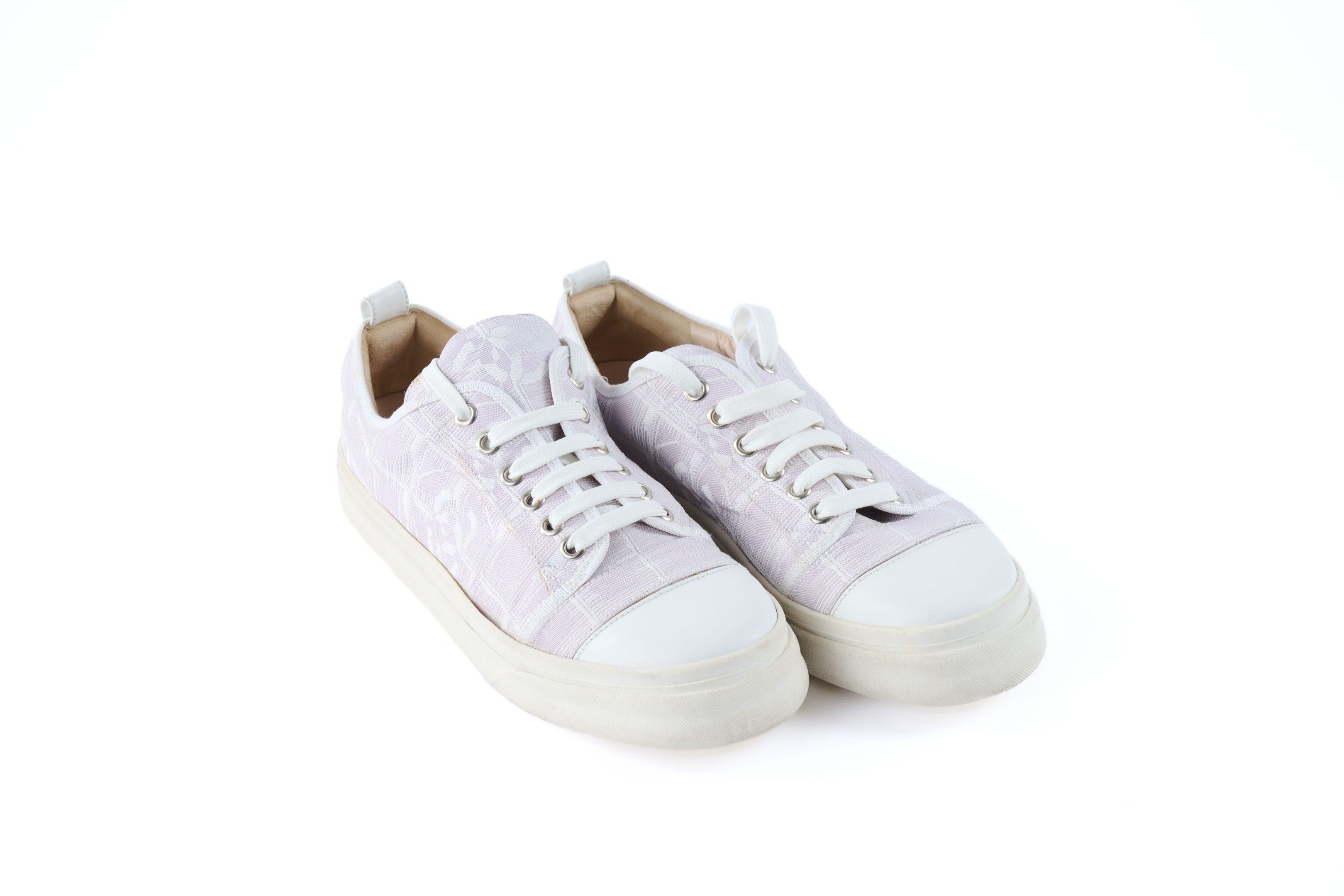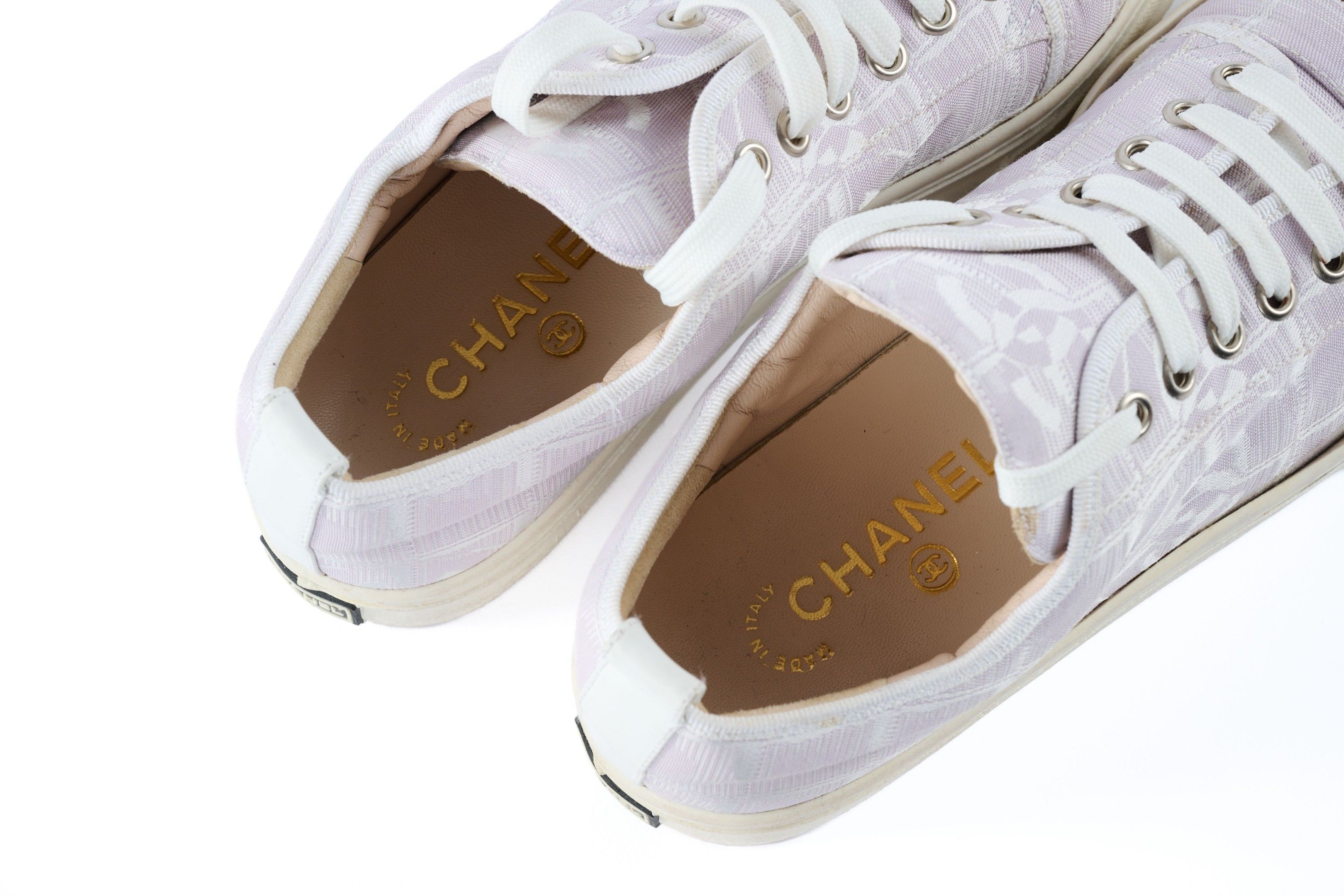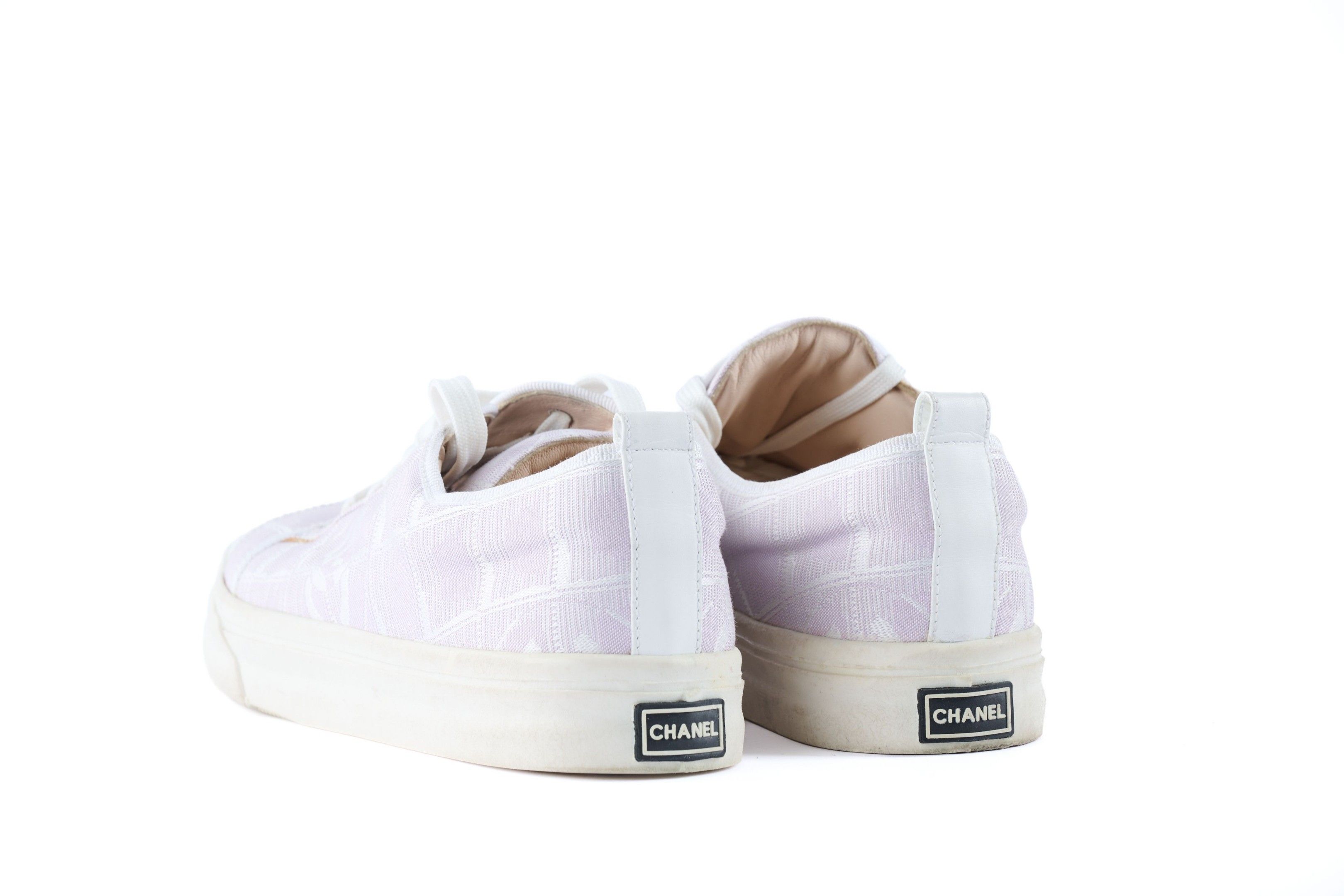 Premium CHANEL. Paire de tennis en toile mauve siglée à lacets blanc…