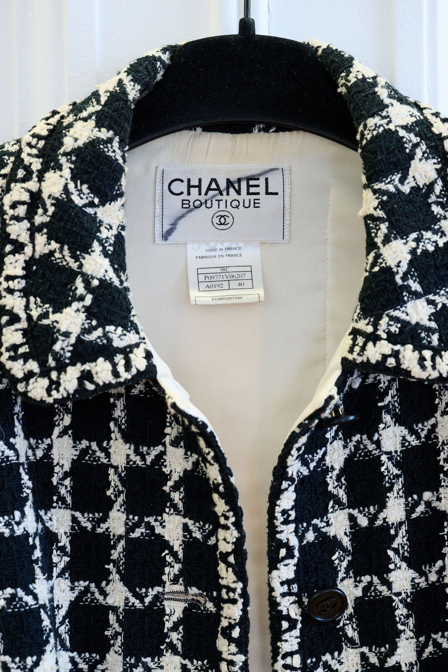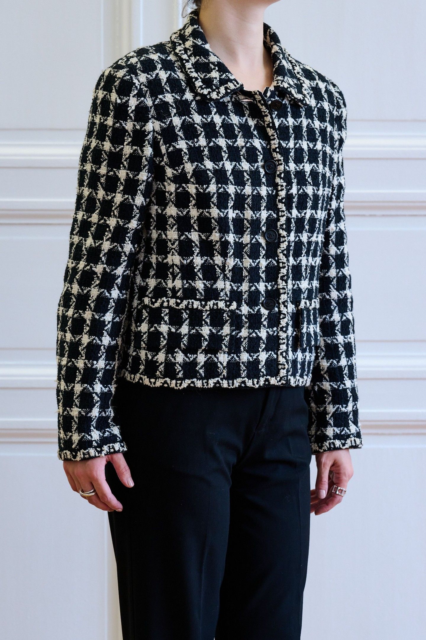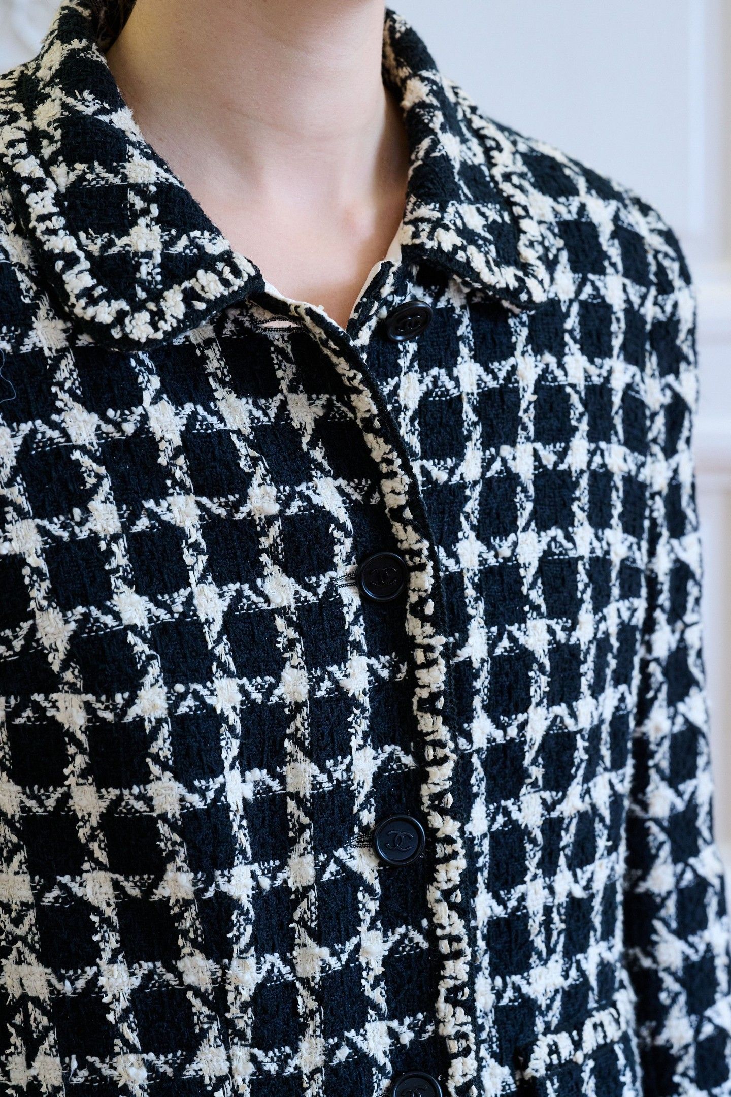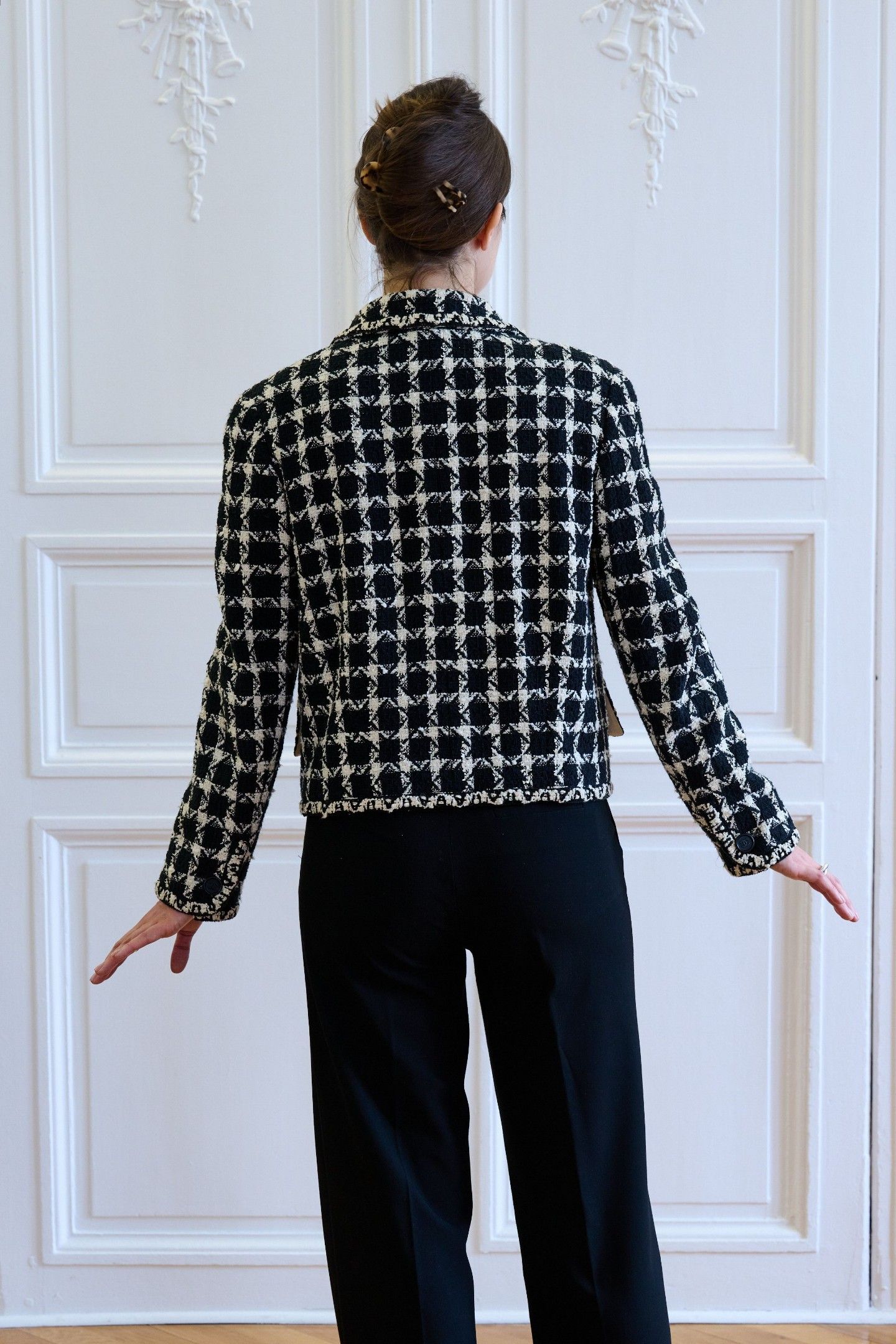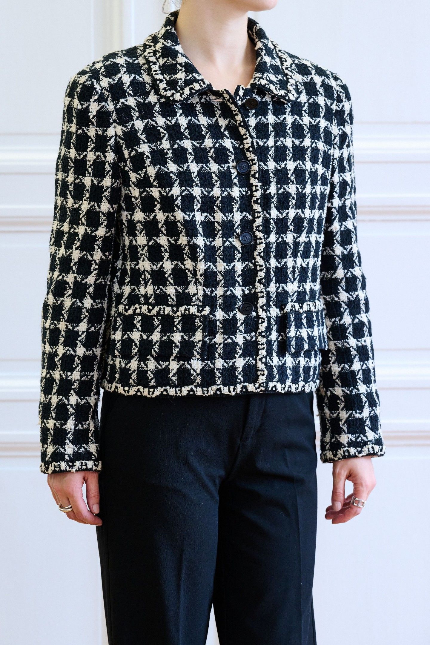 Veste de la ligne "Boutique" en tweed de coton mélangé noir et blanc, petit col, simple boutonnage, deux poches à rabats sur le devant et chaine de lestage.
