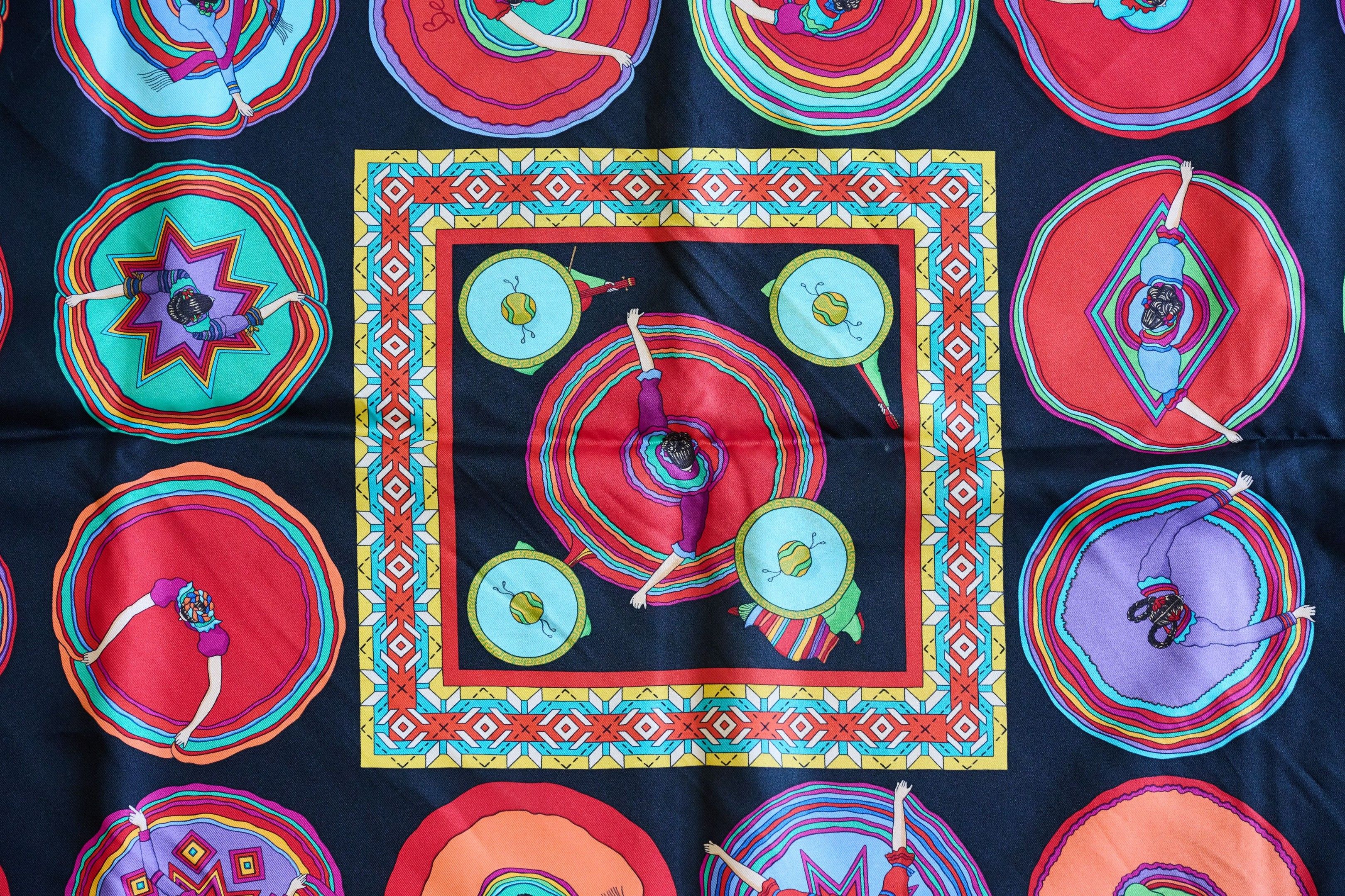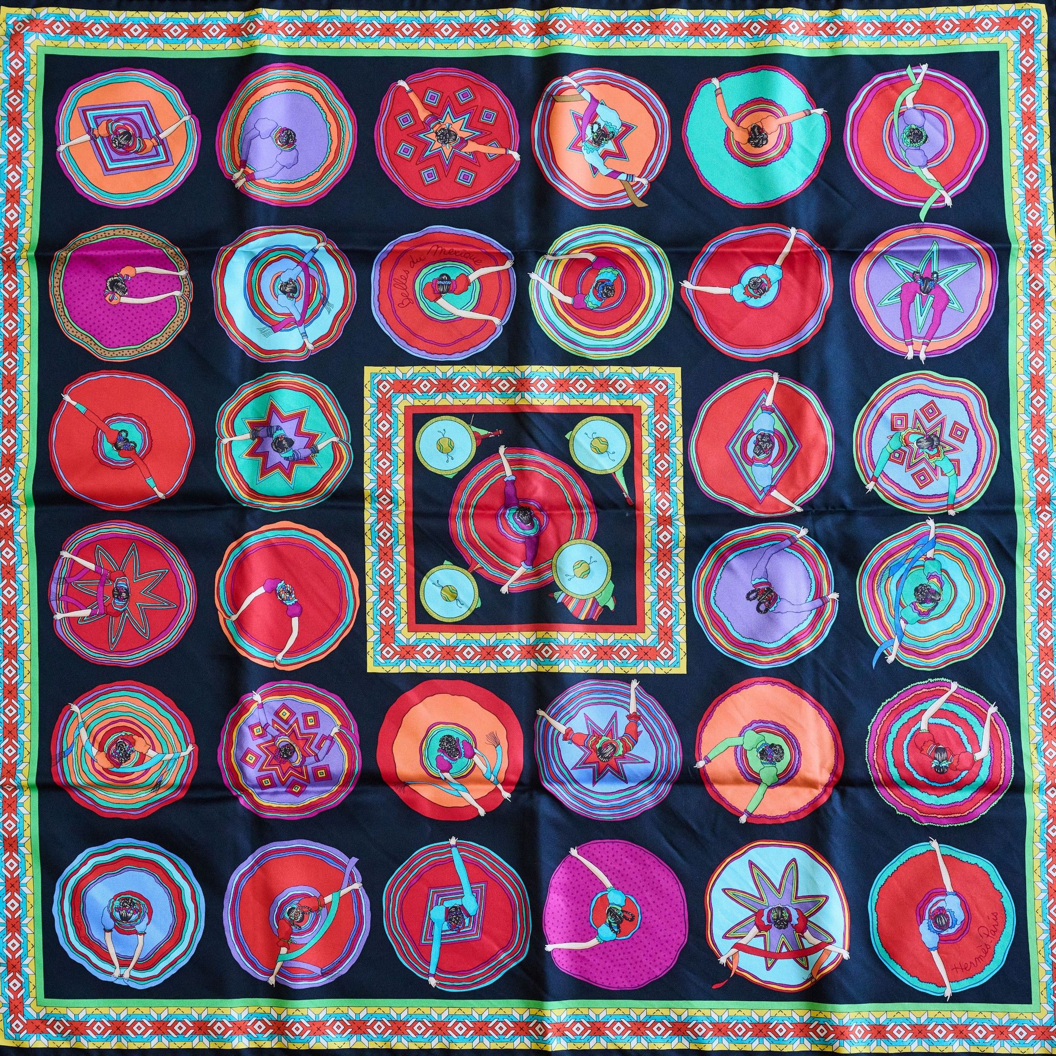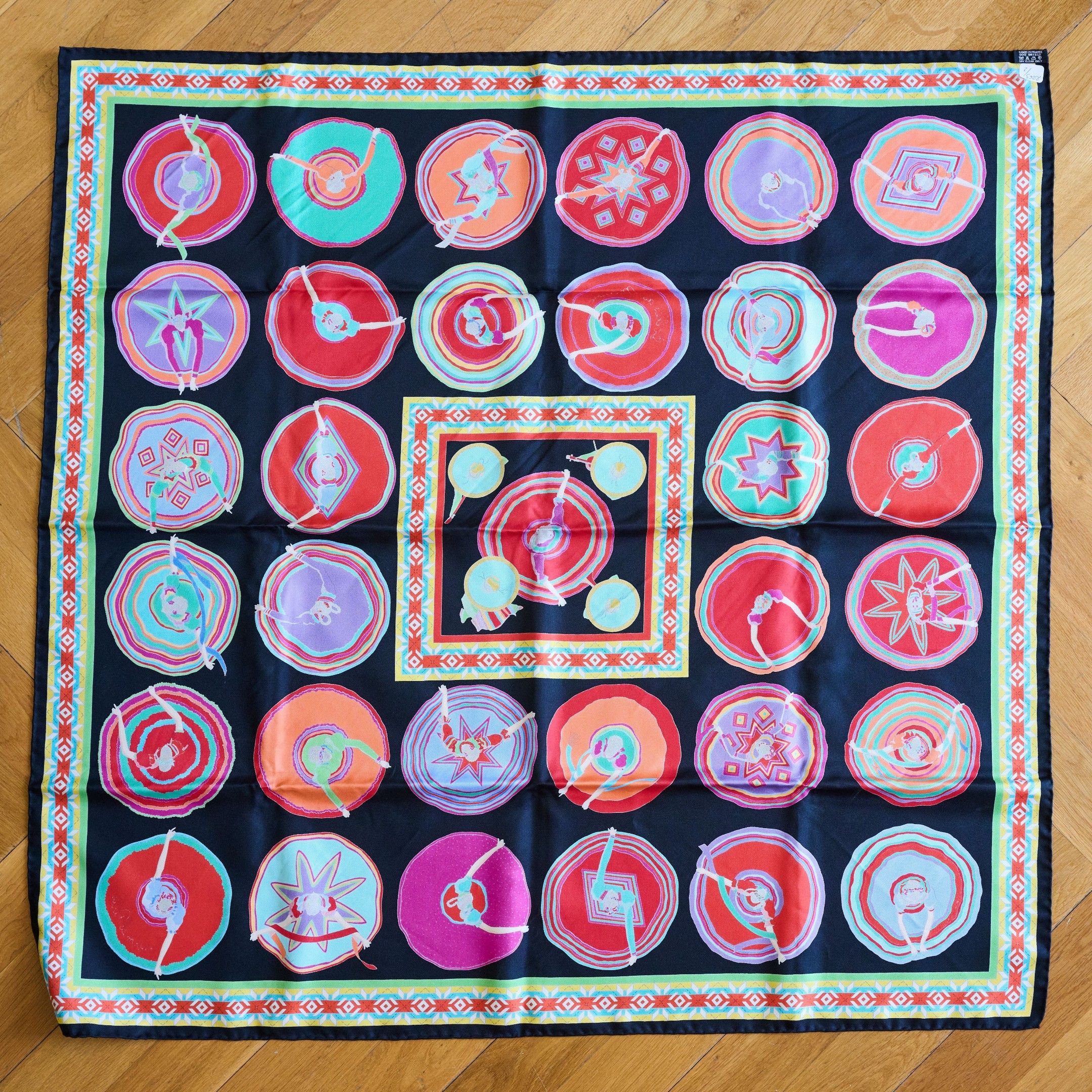 Carré en soie modèle "Belles du Mexique" à décor polychrome sur fond noir.