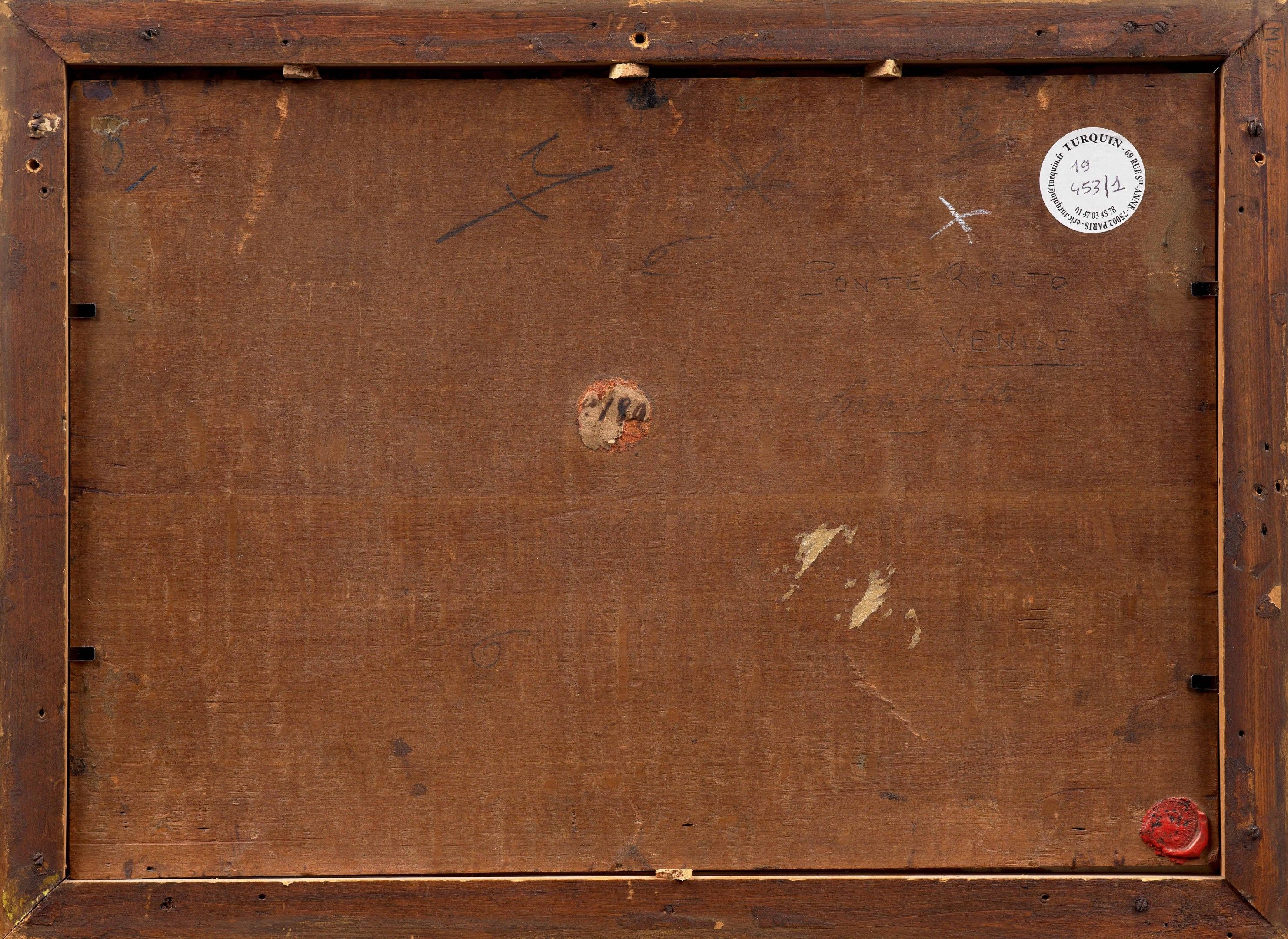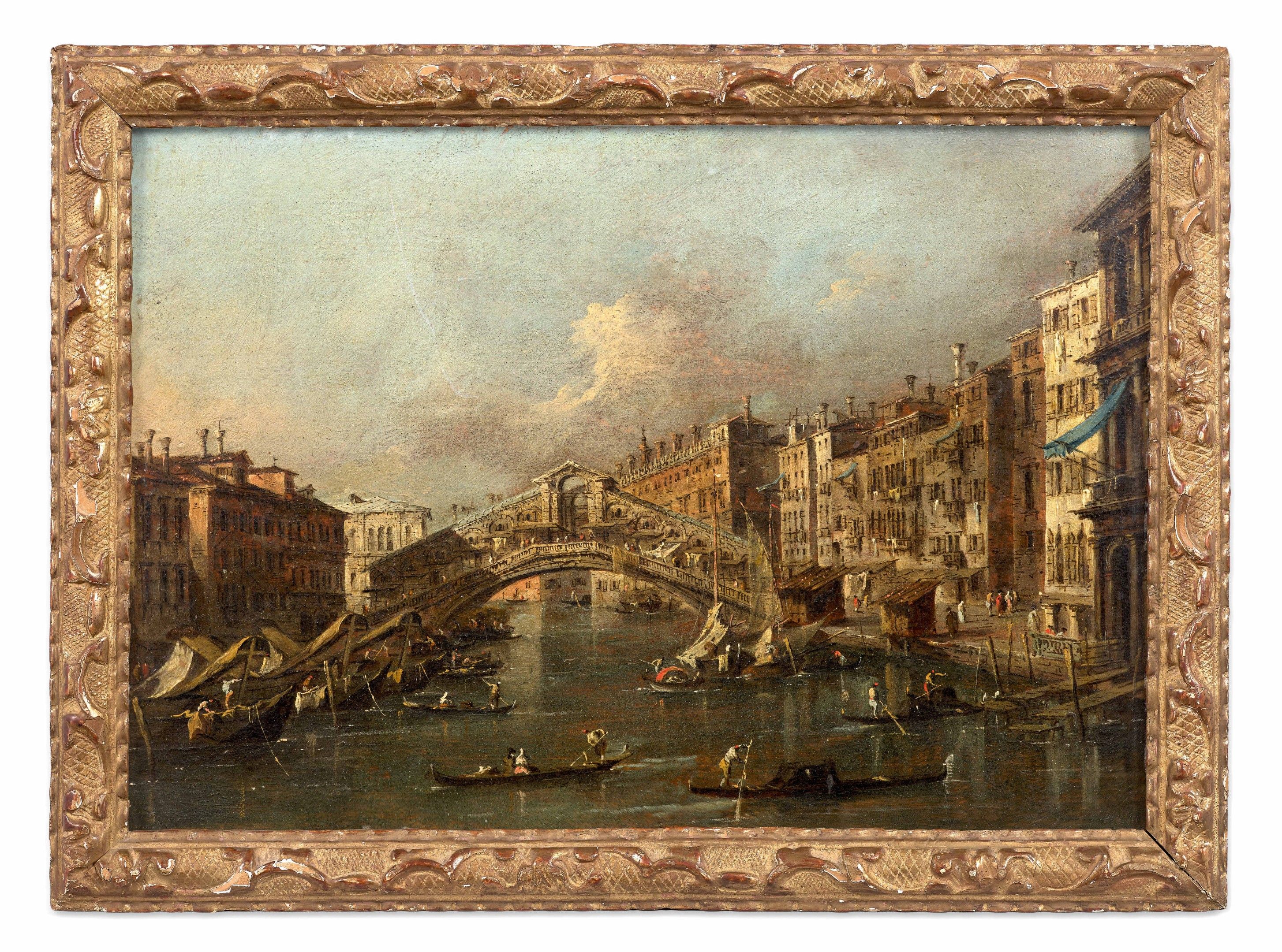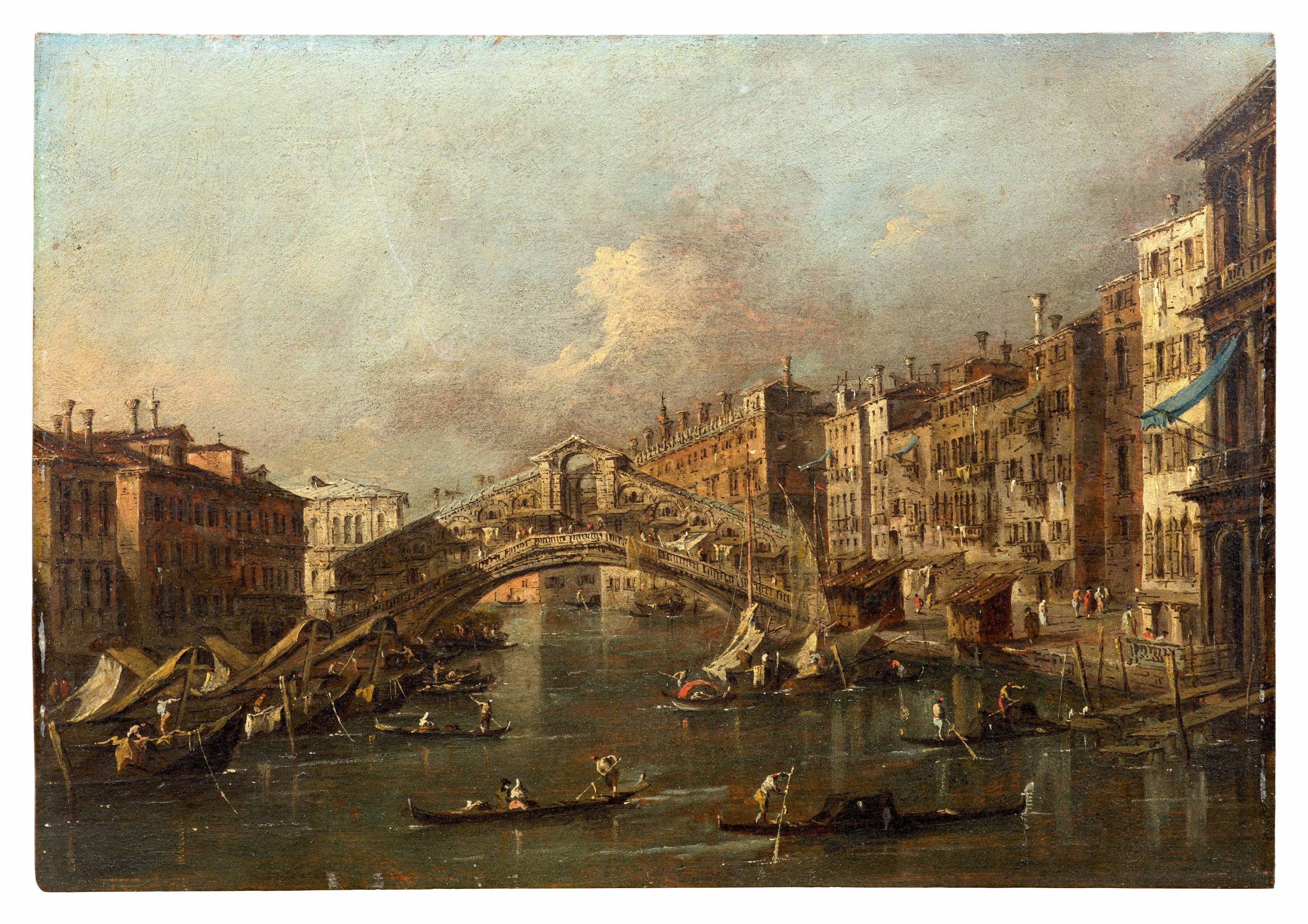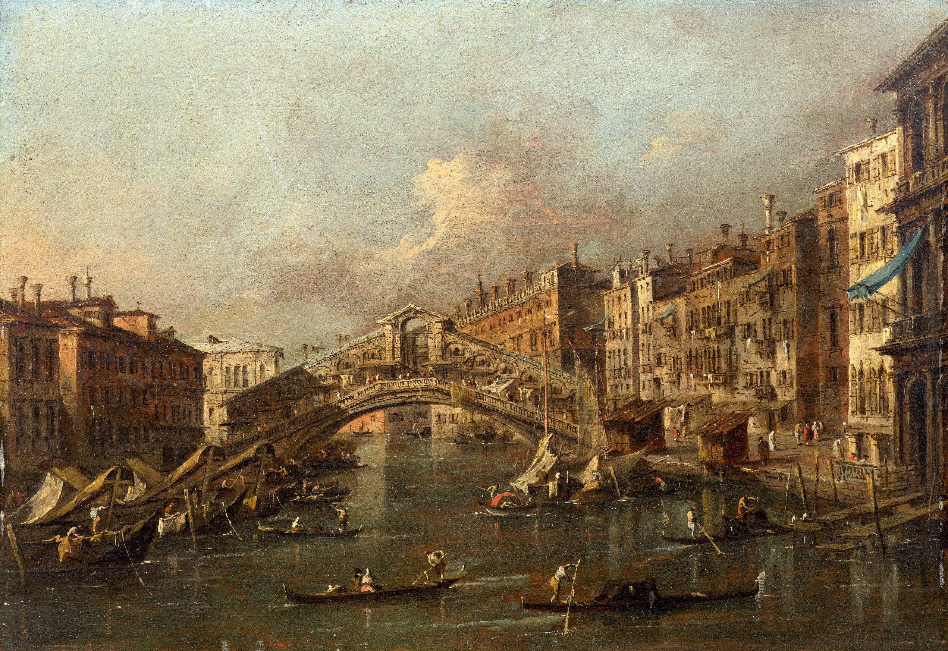 Le célèbre pont du Rialto, seul point de passage entre l'Est (Sestieri de San Polo) et l'Ouest (quartier de San Marco) est un sujet de prédilection de Francesco Guardi. Il l'a représenté une cinquantaine de fois sous divers angles. Concernant le point de vue choisi pour notre composition, Morassi en répertorie huit versions1 et Succi en ajoute trois autres dans son catalogue des inédits, dont la nôtre [op. cit]. Parmi elles, citons celle du musée du Louvre, datée vers 1780 (R-F 1961-44, fig.1)2. De part et d’autre du pont au centre, la Riva del Vin est à gauche et la Riva del Ferro sur l’autre rive du Grand Canal. Sur ce même côté droit, on découvre une partie ombragée de la façade du palais Dolfin-Manin. A l'arrière-plan, on aperçoit le palais des Camerlenghi et le Fondaco dei Tedeschi.