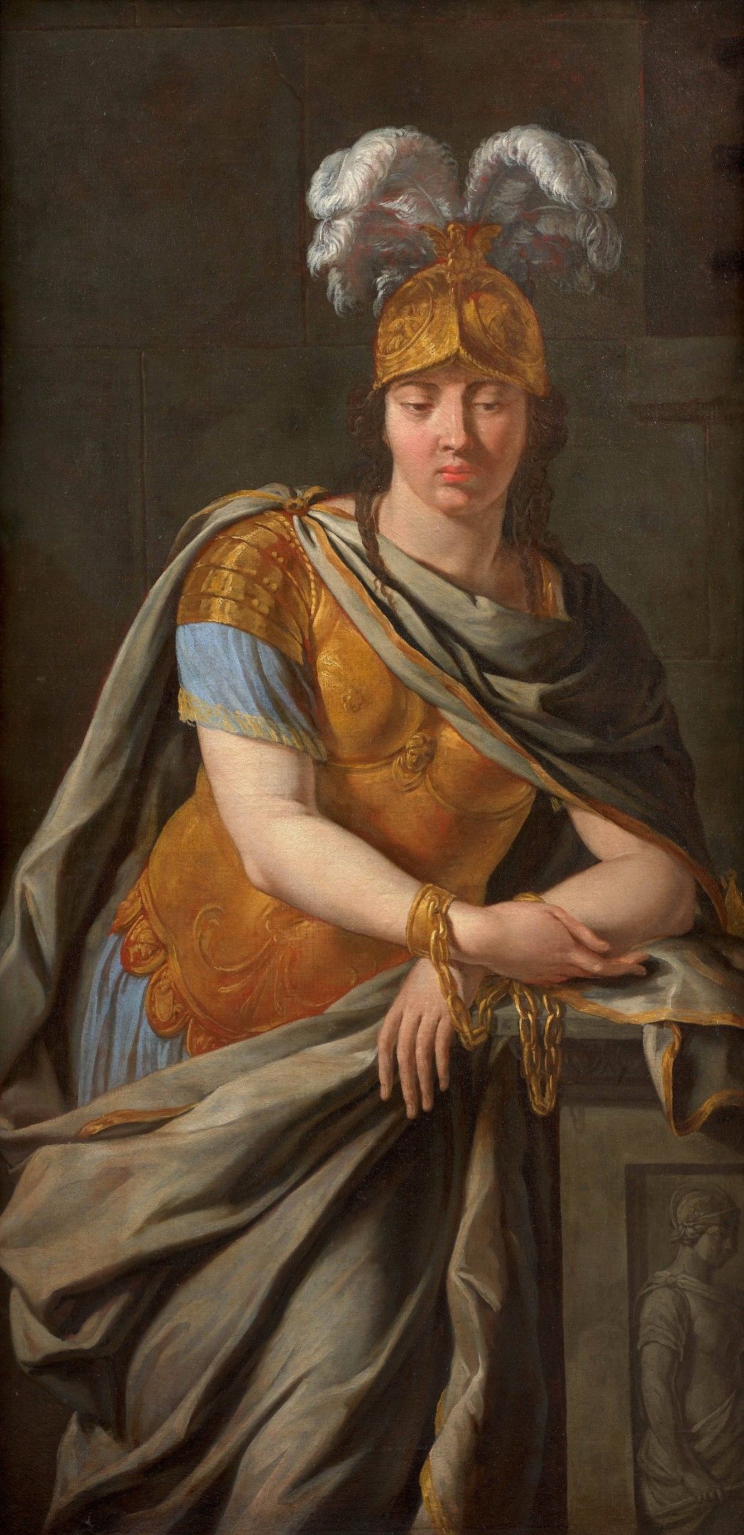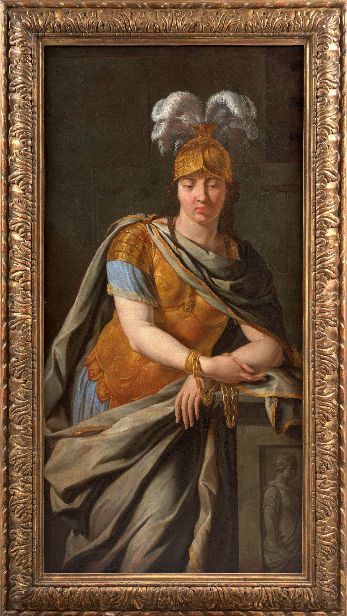 Légendes ou réalités ; ces récits fantasques ne correspondent parfois pas à la vérité scientifique. Au XVIIe siècle, les cycles décoratifs, mais aussi la littérature, mettent sur le devant de la scène les femmes fortes. Les décors de Nicolas Prévost dans l’appartement de la reine au château de Richelieu, ou ceux de Simon Vouet au Palais Cardinal sont parmi les plus célèbres. Nous ne savons à quel lieu était destiné notre tableau qui représente la reine avec ses chaines, mais son format pourrait être celui d’une entre-fenêtre, dans une pièce où le décor serait dédié aux plus excellentes figures des femmes.