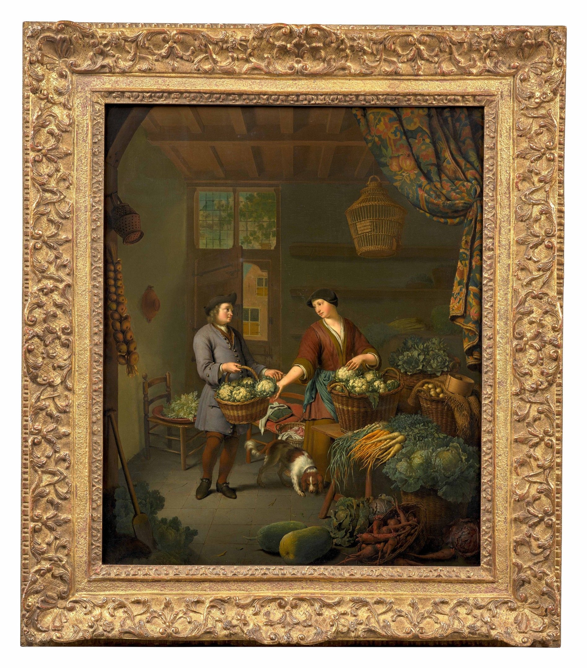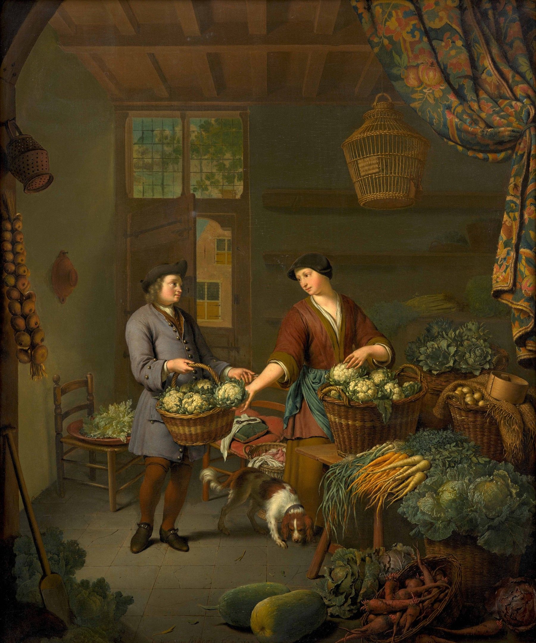 Les œuvres de Willem van Mieris étaient par ailleurs très recherchées et se vendaient pour des sommes importantes. Cette grande renommée, Willem van Mieris la doit en partie à ses tableaux représentant des scènes d’intérieur flanquées de piliers en pierre agrémentés en partie inférieure d’un bas-relief richement sculpté aux motifs de putti. Il en va ainsi du tableau de Willem van Mieris de la Wallace Collection réalisé en 1731 (n° P220, fig. 1). Ce n’est pas le cas de notre panneau dans lequel le peintre s’est affranchi de ce procédé qu’il avait emprunté à son maître Gerrit Dou. Mais ne nous y trompons pas, la représentation de cette marchande de légumes plaçant un chou-fleur supplémentaire dans le panier du jeune homme en échange de la pièce de monnaie qu’il lui tend comporte vraisemblablement un contenu implicite. Peintre savant et lettré, Willem van Mieris semble avoir eu une importante collection de livres qu’il a léguée à son fils Frans et qui fut vendue lors de la vente après décès de ce dernier en 1764. Il connaissait sans nul doute les travaux de Jacob Cats, poète moraliste, qui inspirèrent de nombreux peintres hollandais du XVIIe siècle.