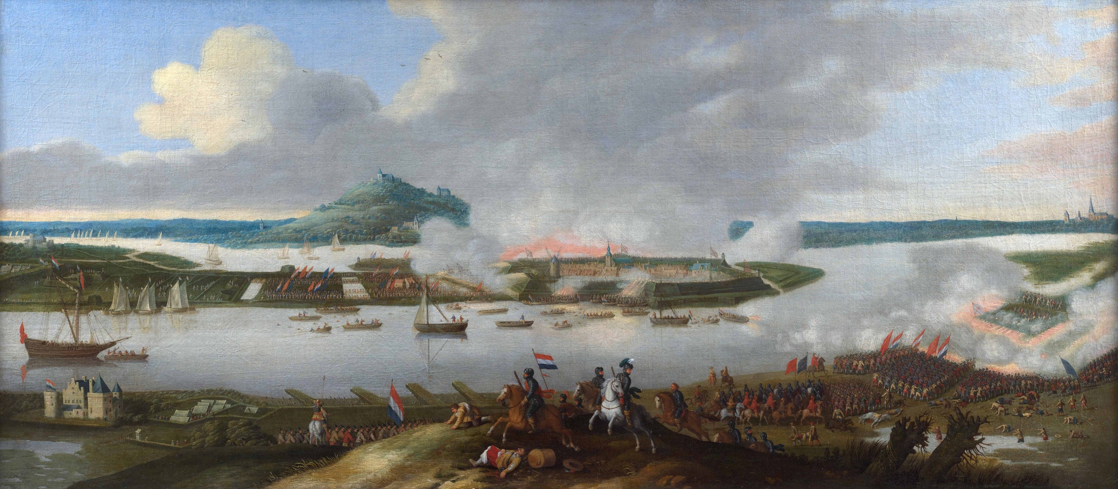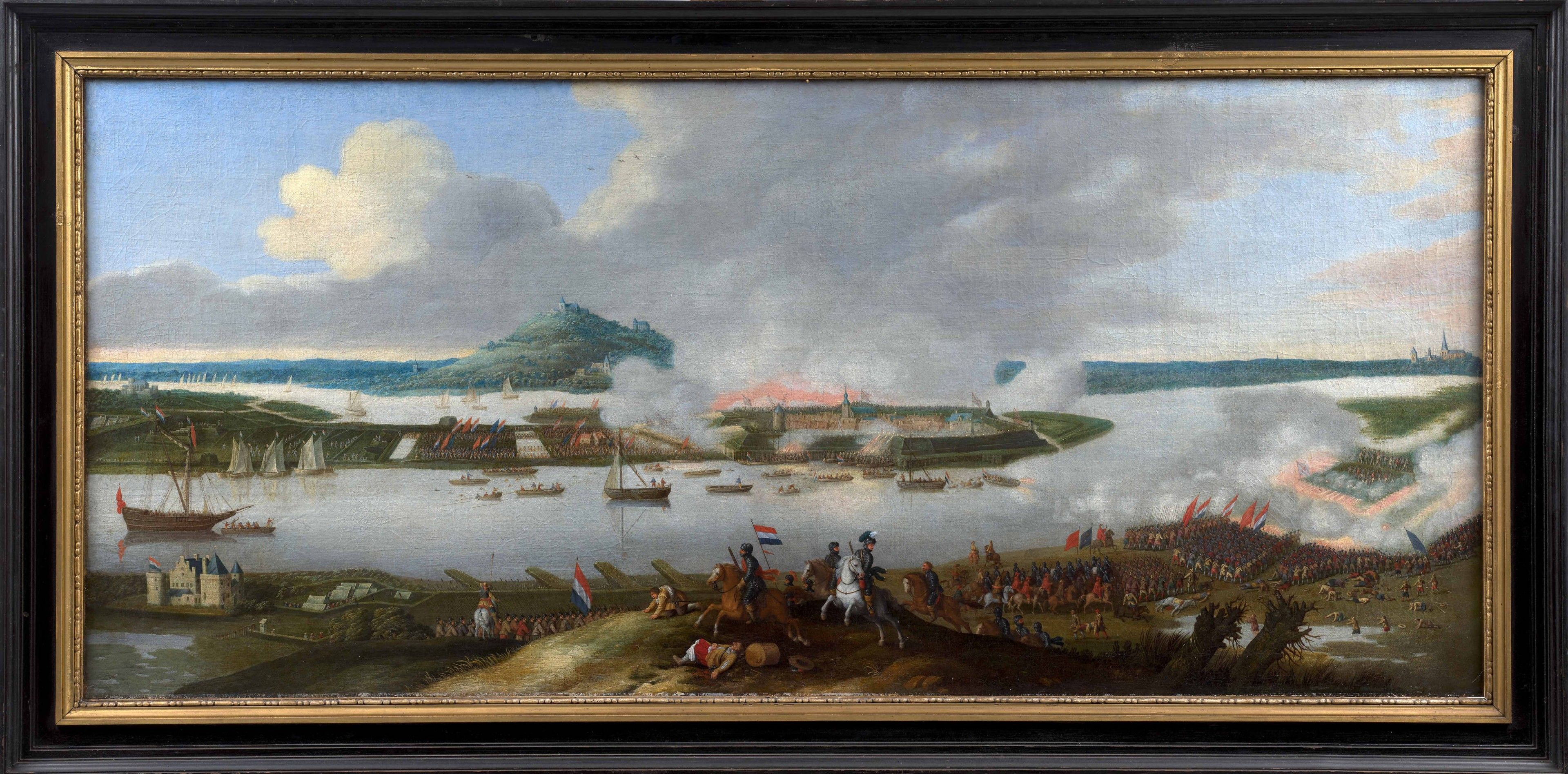 La France, alors associée aux Provinces-Unies, semble prendre l’avantage durant la campagne de 1635 mais, par d’habiles manœuvres, un bataillon de cinq cents Allemands sous les ordres du colonel Adolf van Eyndhouts, s'empare de la place délaissée, et tenue par une garnison de 150 soldats hollandais. A l’automne, Frédéric-Henri d’Orange Nassau (1584-1647) entame le siège de la place et fait immédiatement creuser des sapes d'approche. Le siège dure et au printemps, en face de l'écluse, un pont de navires que l’on voit dans notre toile est installé et permet de couper les voies d'approvisionnement de Schenkenschans. Les tentatives espagnoles de briser la ligne de bateaux échouent. Les assiégés perdent tout espoir de secours et la faim et la maladie commencent à frapper. À partir de ce moment-là, les alliés parviennent à s'emparer des défenses espagnoles. Une reddition est proposée dans des conditions favorables, celle-ci est acceptée et les Espagnols se rendent le 29 avril 1636. Les forces néerlandaises conduites par le prince Frédéric-Henri parviennent ainsi à prendre la ville aux Espagnols le 29 avril 1636