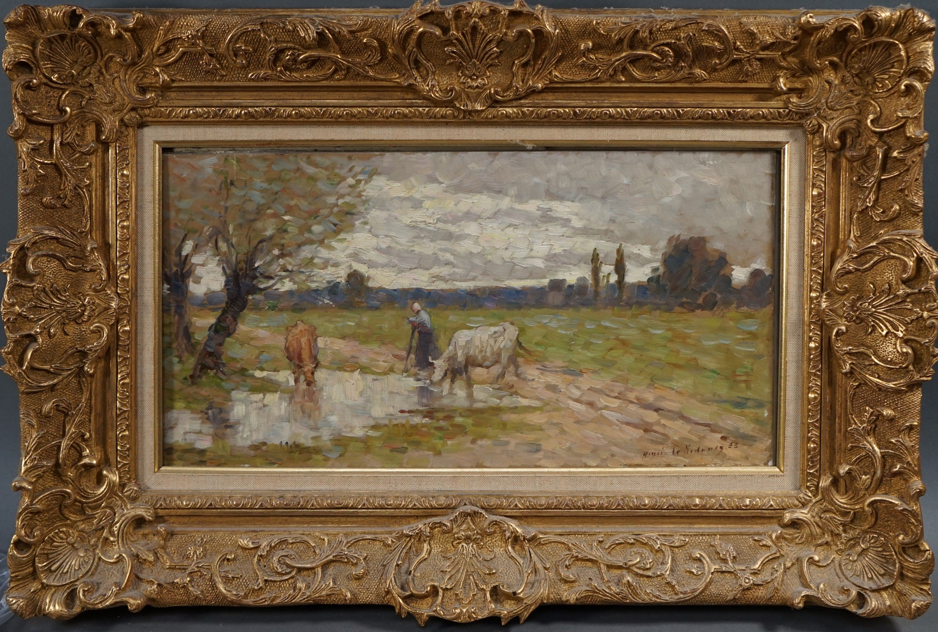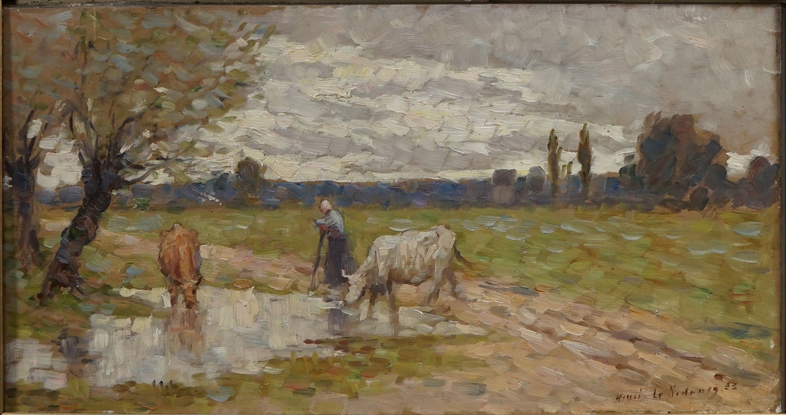Henri LE SIDANER (1862-1939). Paysanne et ses vaches s'abreuvant. Huile sur panneau de bois signée et datée '23' en bas à droite. 26 x 50 cm.