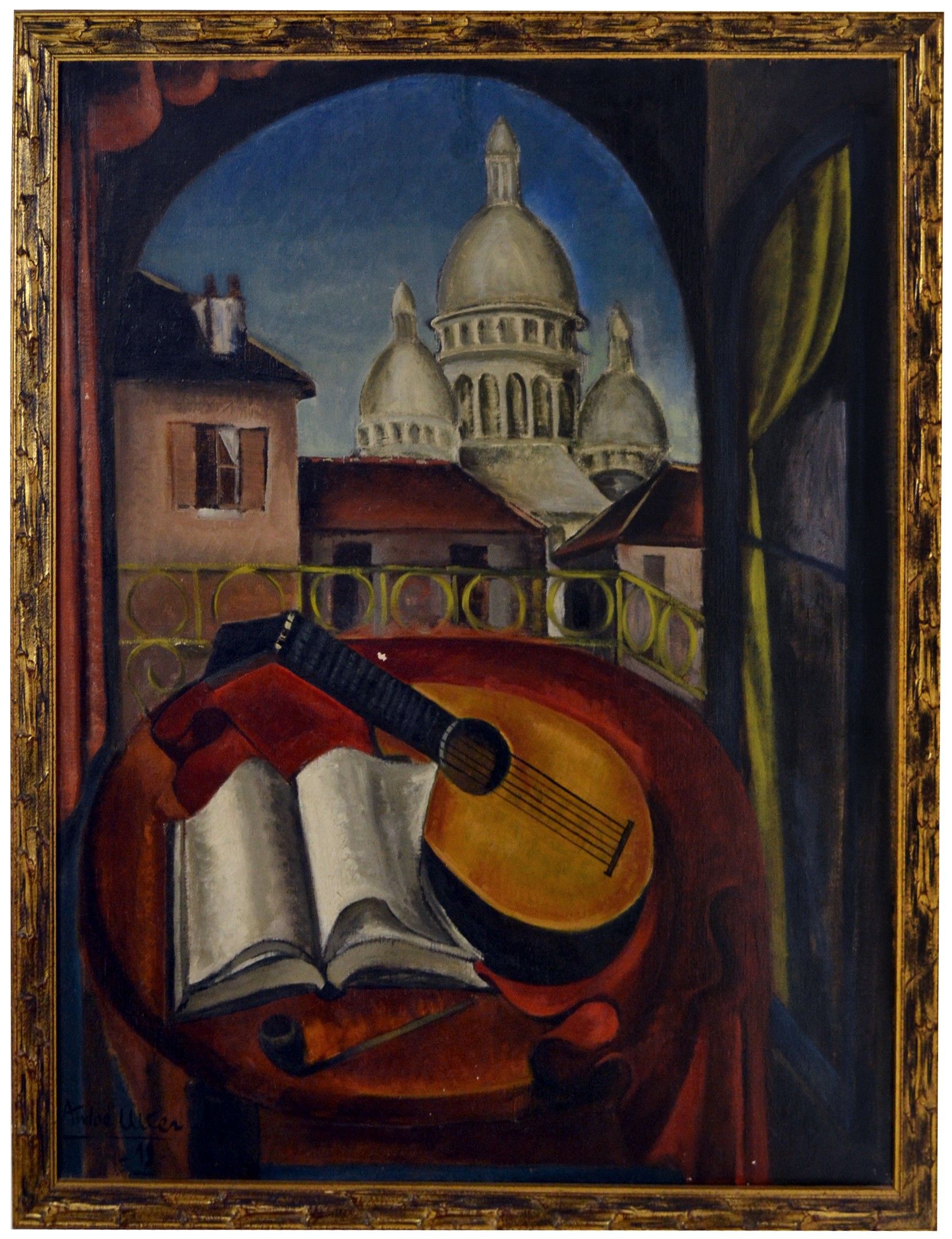 André UTTER (1886-1948) Nature morte à la mandoline, pipe et livre sur un guéridon, le Sacré Choeur au second plann 1919. Huile sur toile signée et datée 19 en bas à gauche. 92 x 73,5 cm petits manques