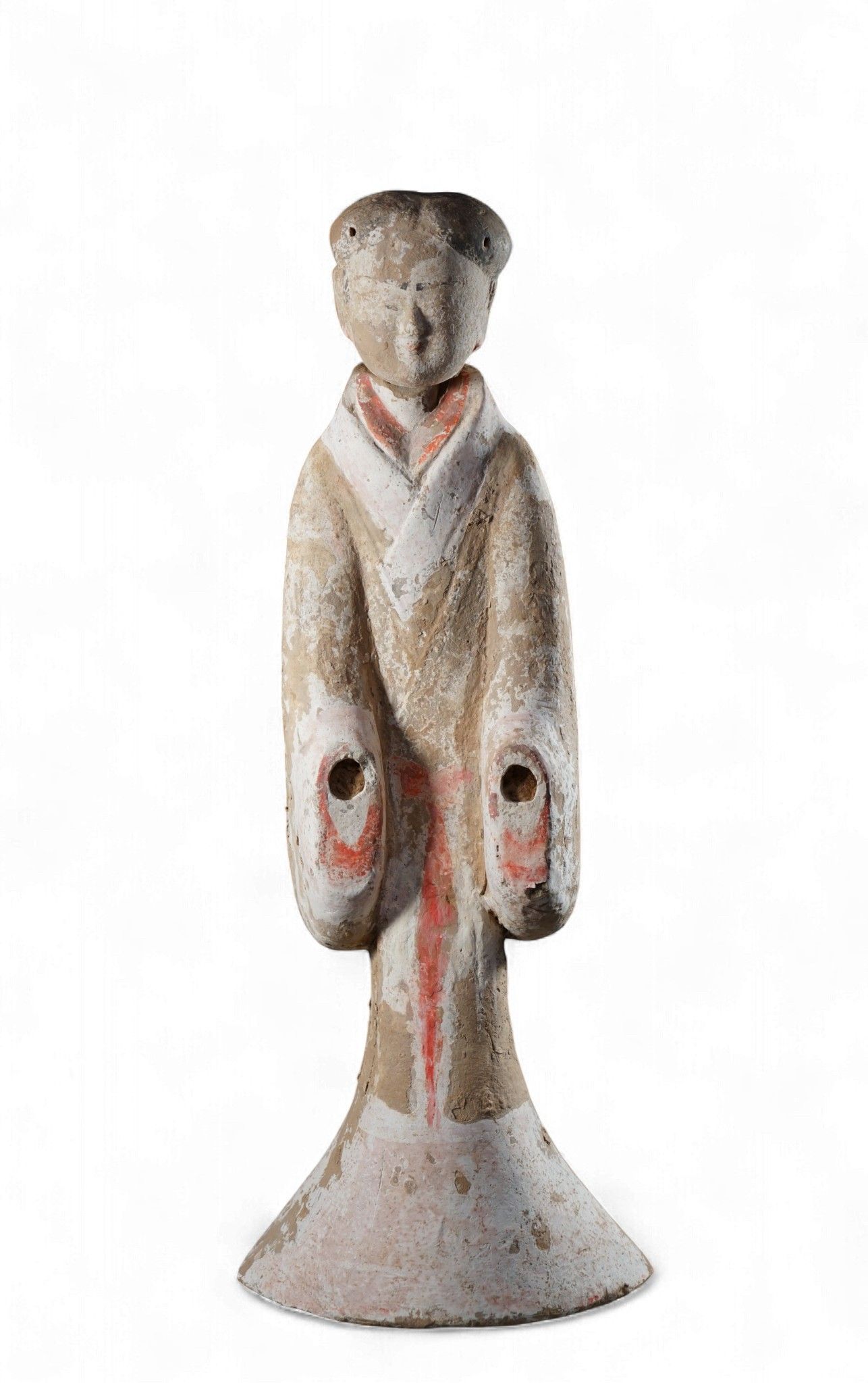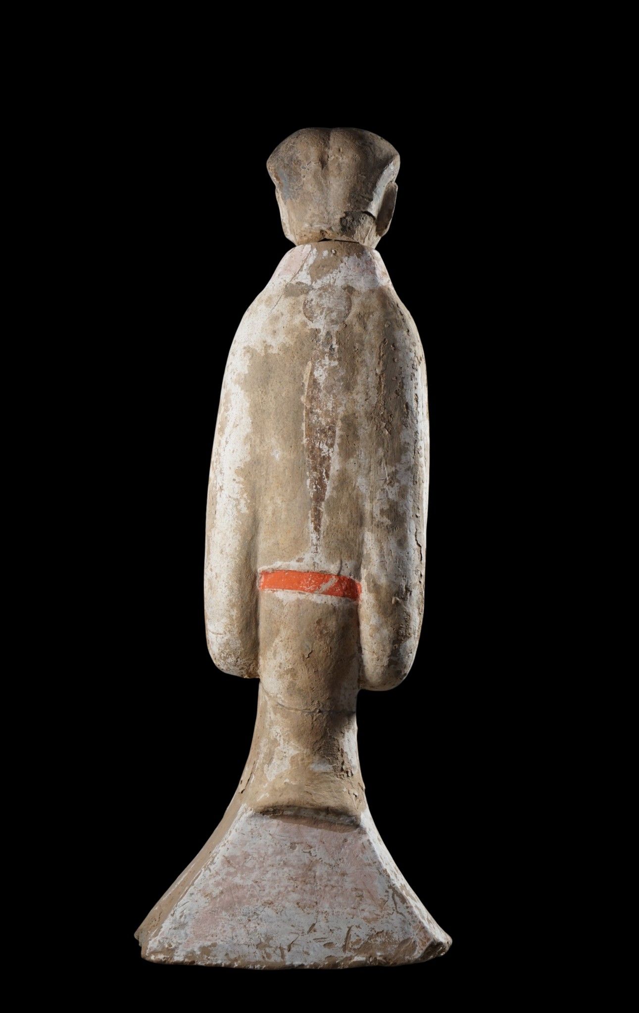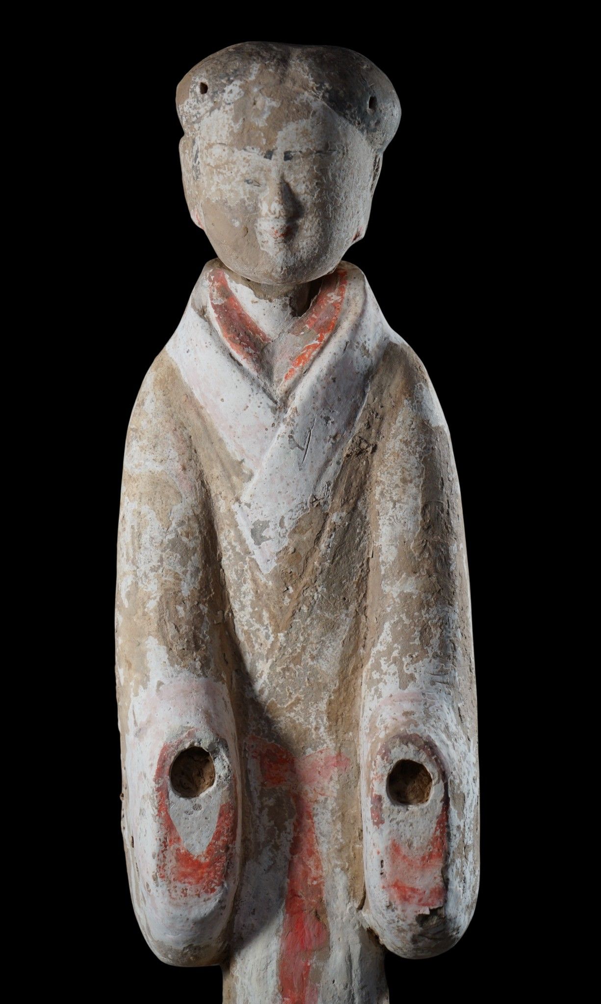 CHINE - Dynastie HAN (206 av. JC - 220 ap. JC) Important MINGQI, dame de cour en terre cuite à traces de polychromie rouge et blanc, debout, la robe s'évasant vers le bas, la tête amovible. (Accidents et bras manquant). H. 66,4 cm