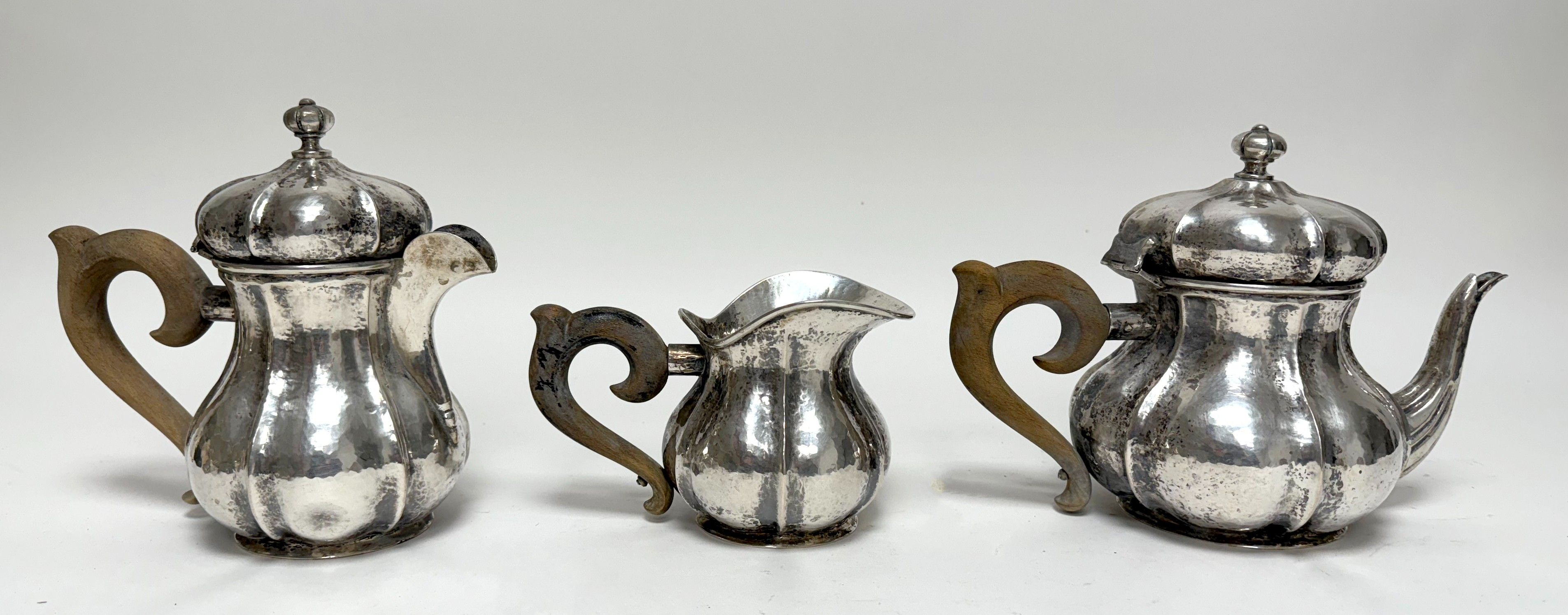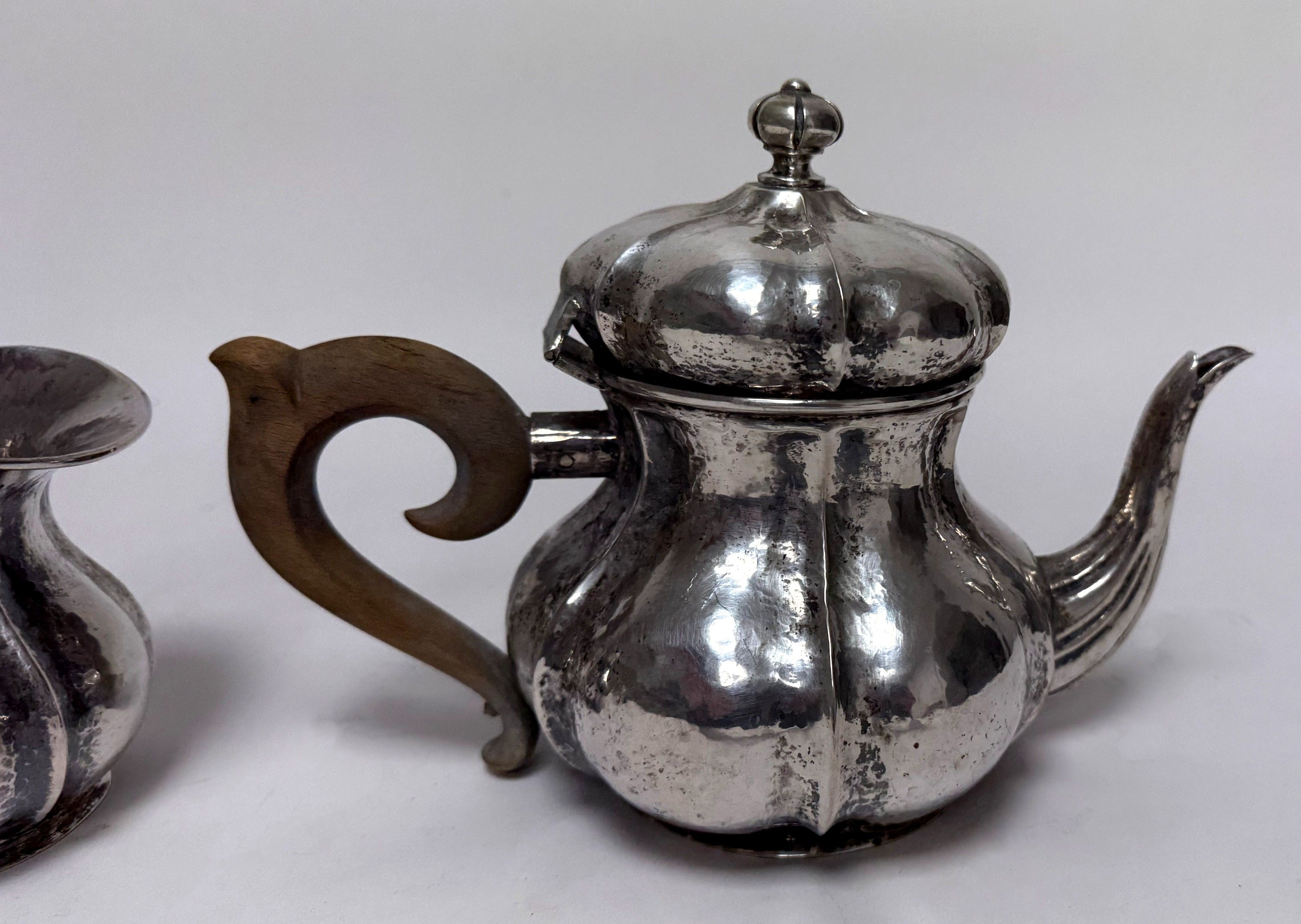 SERVICE à THE comprenant THEIERE, POT à EAU CHAUDE et POT à LAIT en argent martelé, panse renflée, modèle 'à la turque' anse en bois sculpté anciennement vernie, à fond plat. H. 19 cm, 18 cm et 10,5 cm Poids brut : 1457 g.