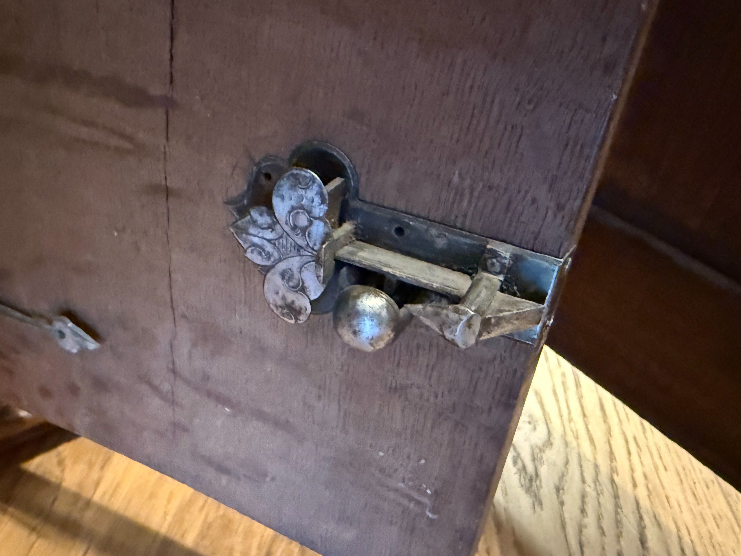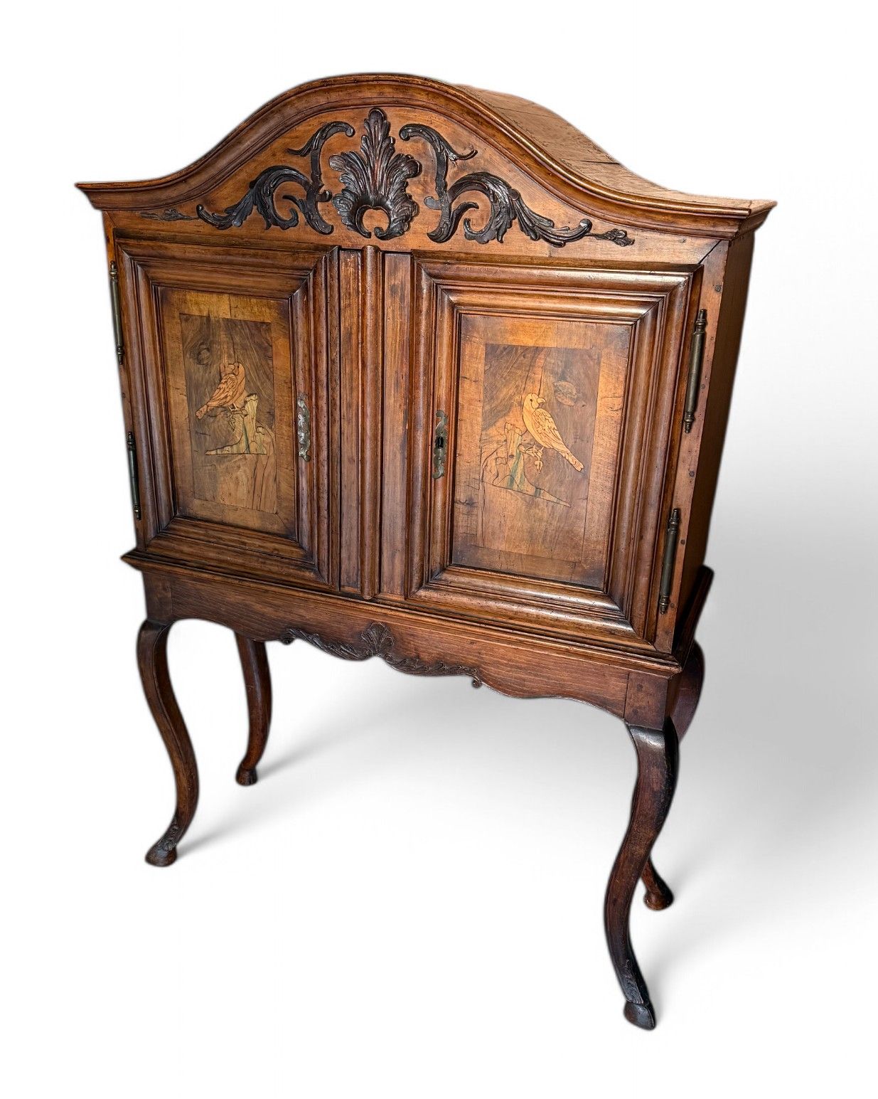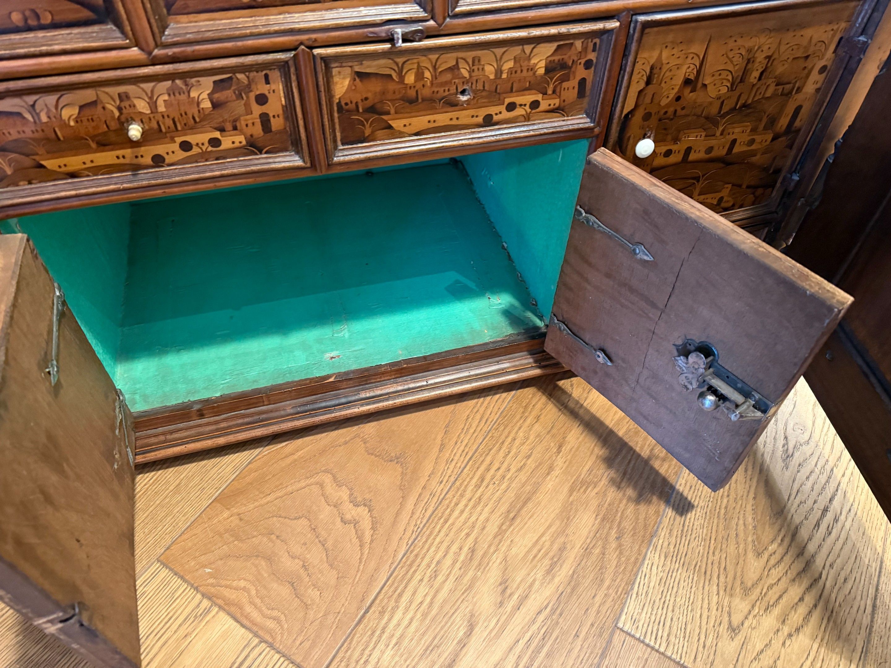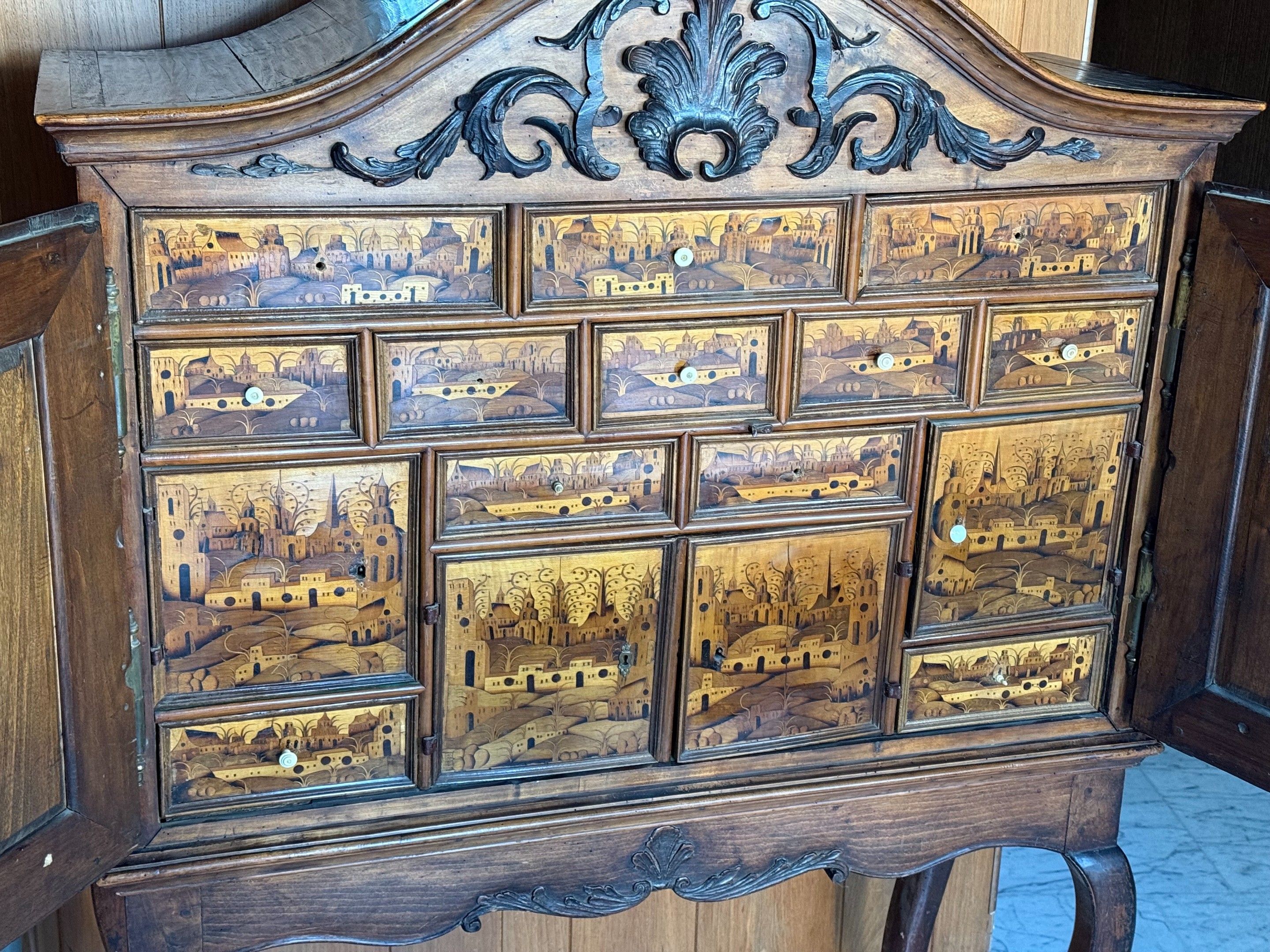 AUGSBOURG, fin XVIe transformé au XVIIIe. Important CABINET dit 'aux herbes folles' et 'aux caprices architecturaux' la façade marquetée ouvrant à douze petites tirois quatre petits vantaux en décalé, les intérieurs badigeonnés de couleurs. Il est enchâssé dans un meuble postérieur, à corniche mouvementée rehaussée d'un motif Rocaille en application, ouvrant à deux portes marquetées d'oiseaux branchés en partie colorés et et esr posé sur un piétement à quatre pieds cambrés terminés par des sabots de biches. belle serrure de fer ouvragée d'un trèfle. (Quelques trous de ver, manques des boutons de préhension des tiroirs). 149 x 100 x 39 cm