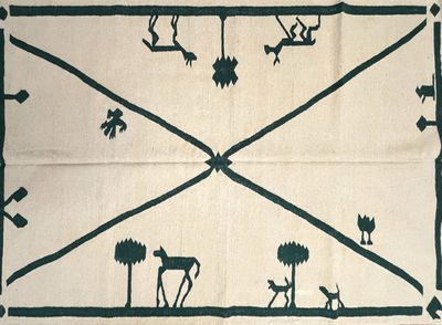 TAPIS en laine et coton à décor zoomorphe vert sur fond sabl…