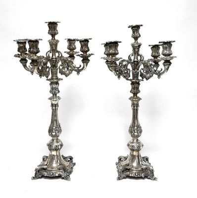 Paire de CANDELABRES en argent à cinq bras de lumière, le fû…
